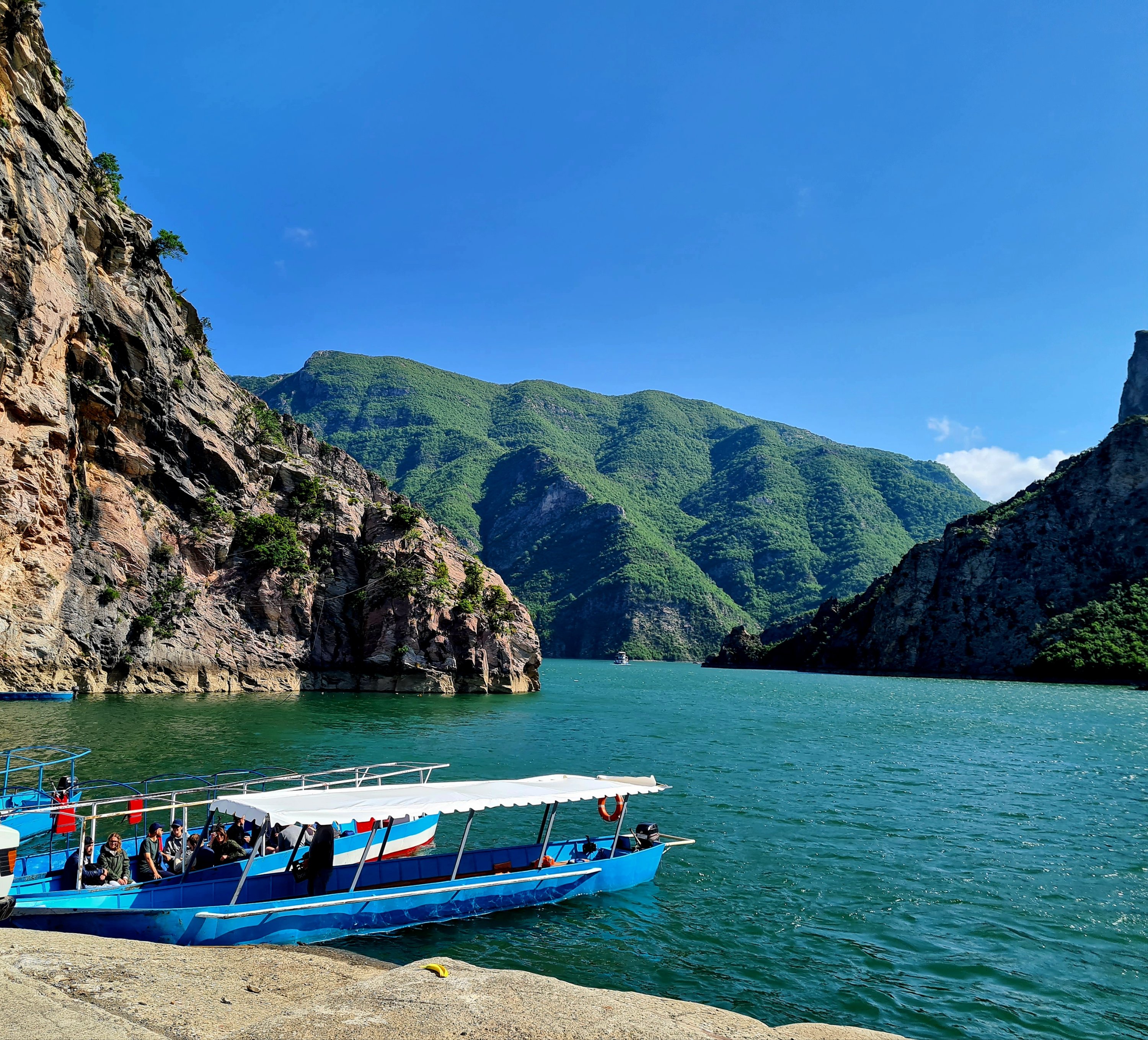 Diese beiden winzigen Boote sind die Verbindung nach Fierze. Von dort könnte man ins Valbonatal.