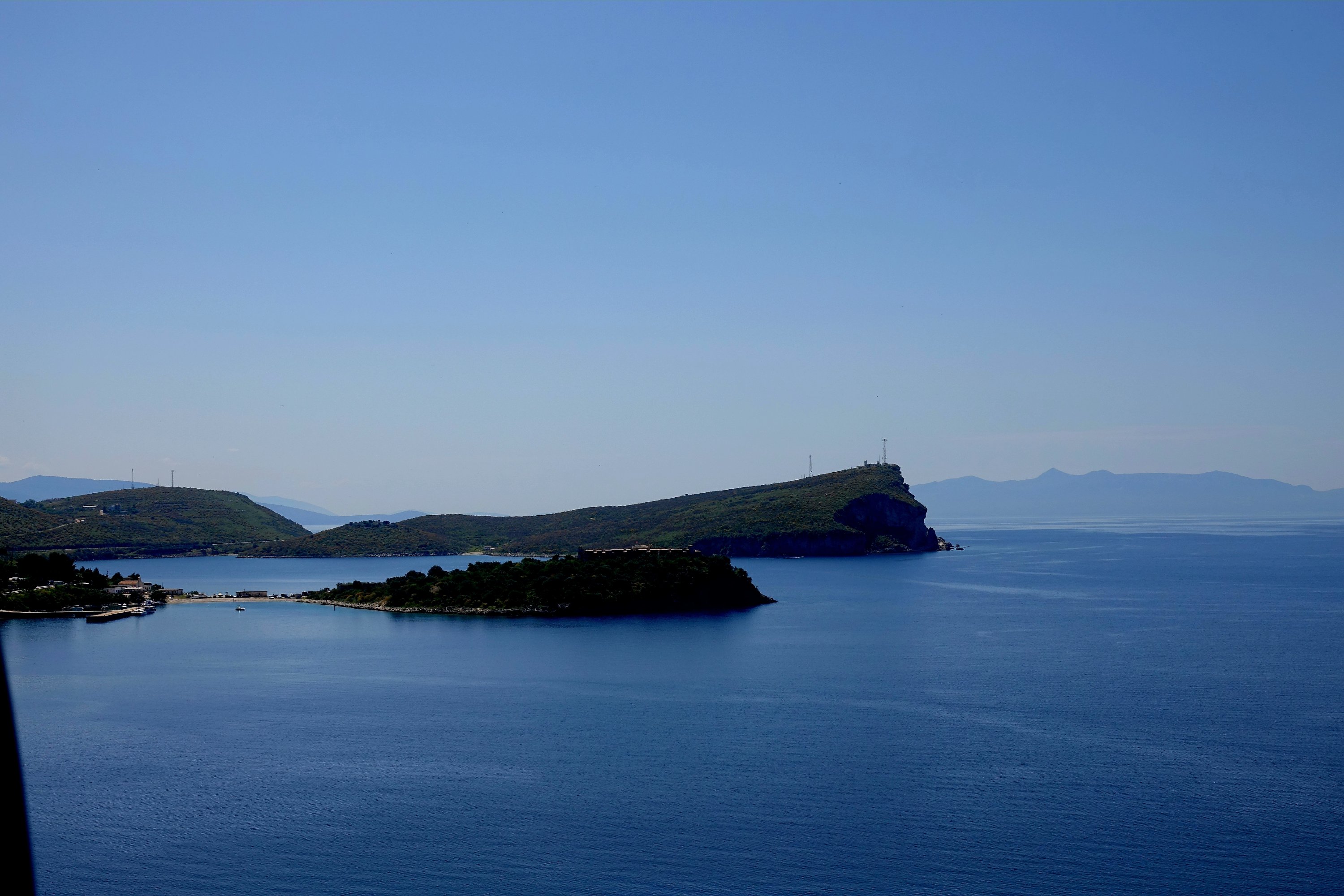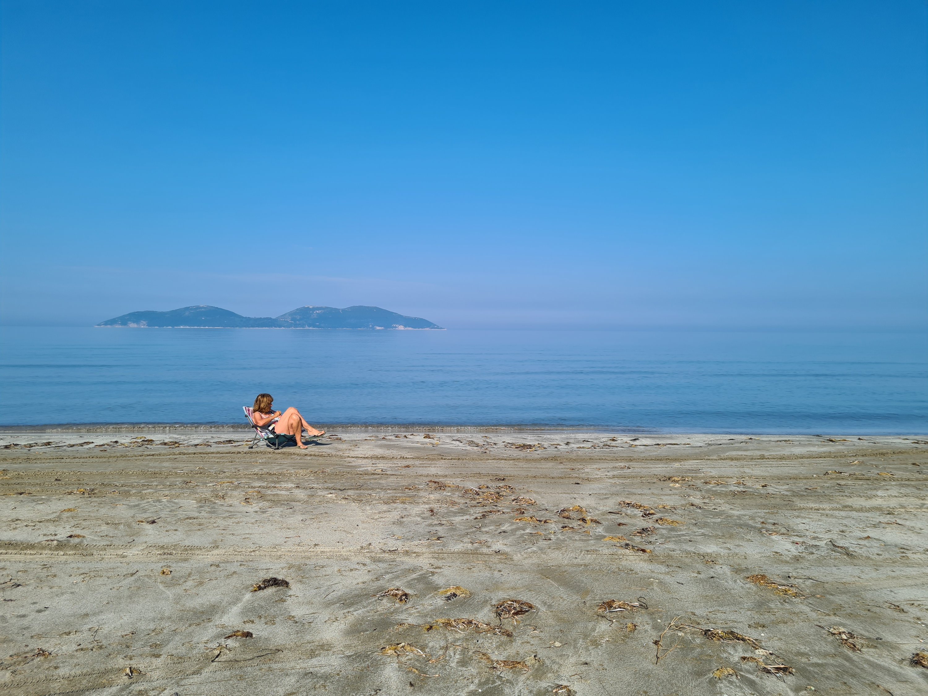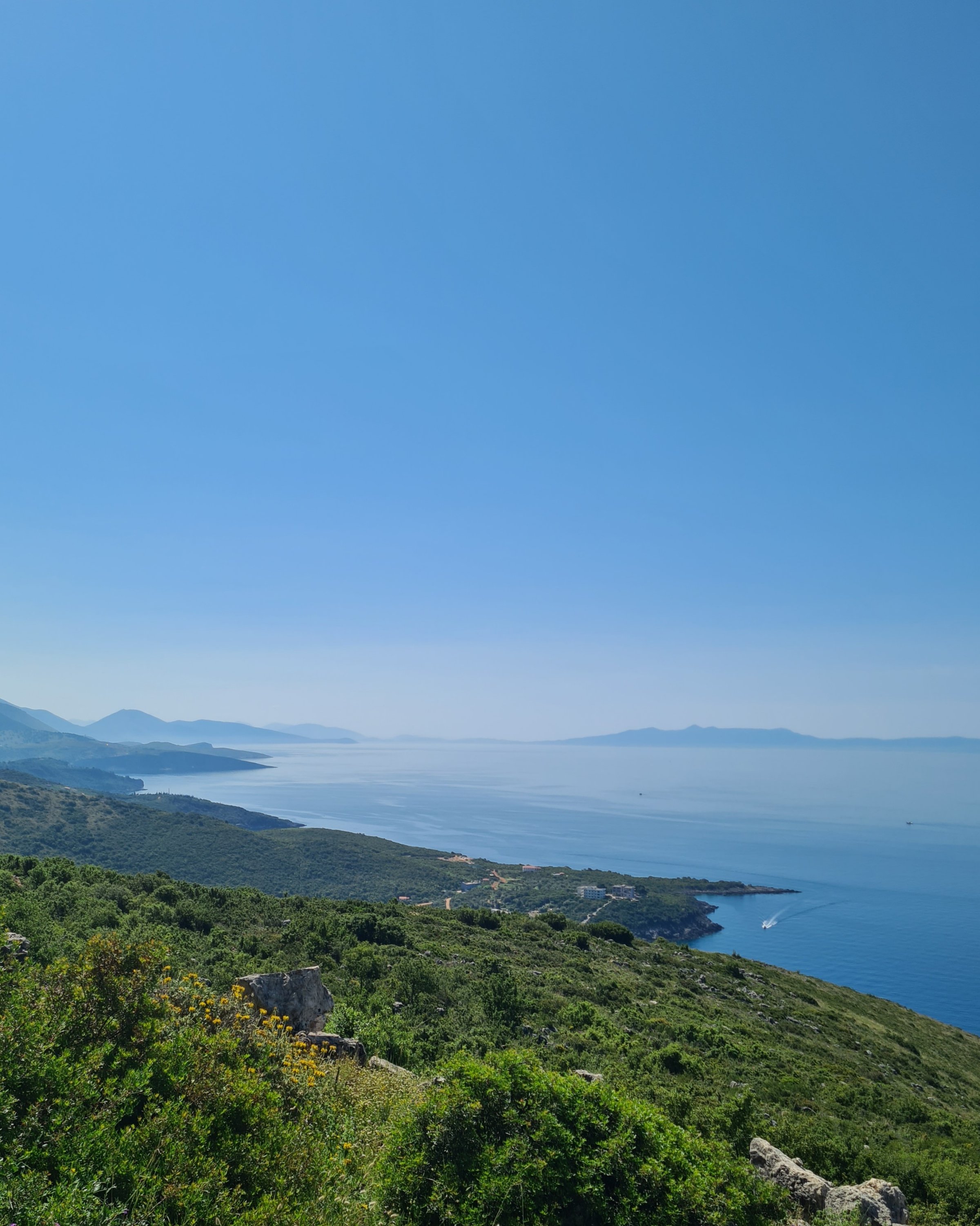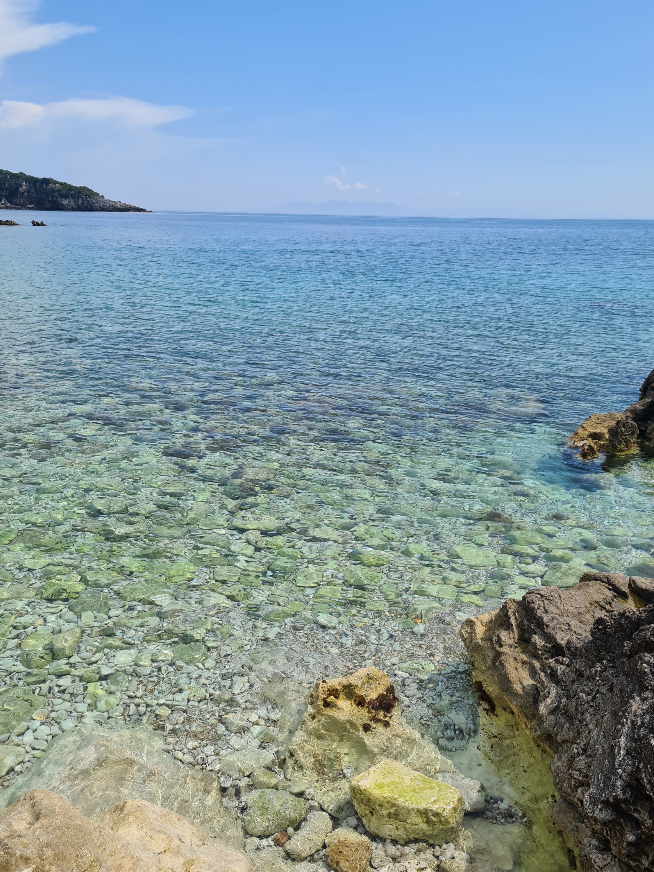 Der Himmel ist wieder einmal strahlend blau. Es ist angenehm warm, aber nicht heiß. Unserer Haut zuliebe frühstücken wir doch lieber im Schatten mit Blick auf die unbewohnte Insel Sazan.