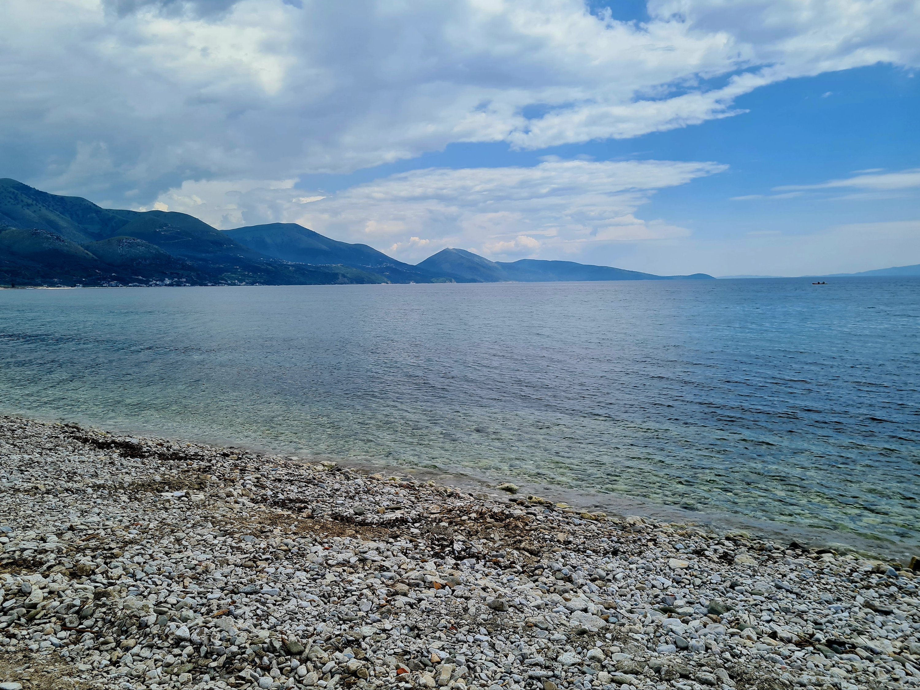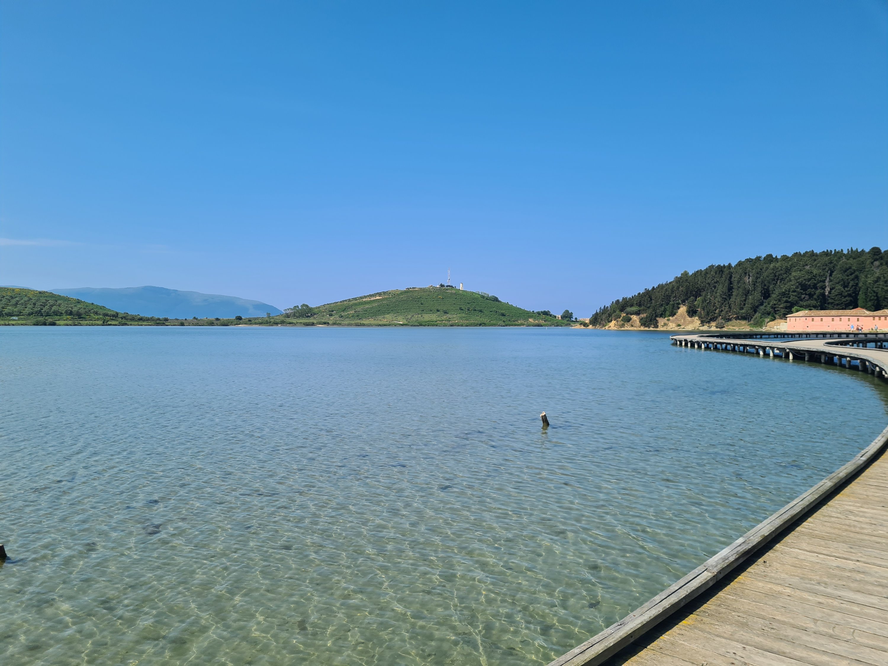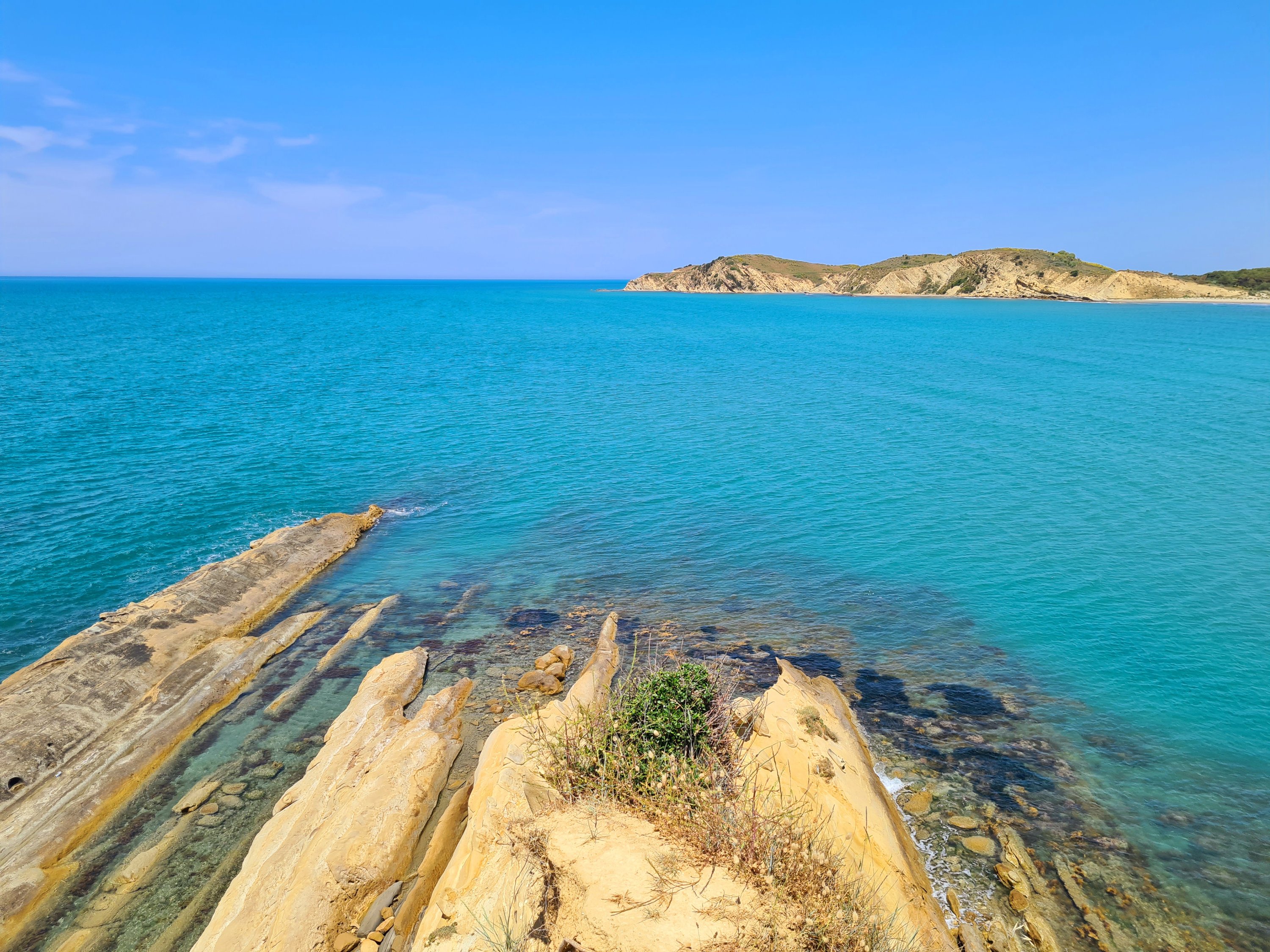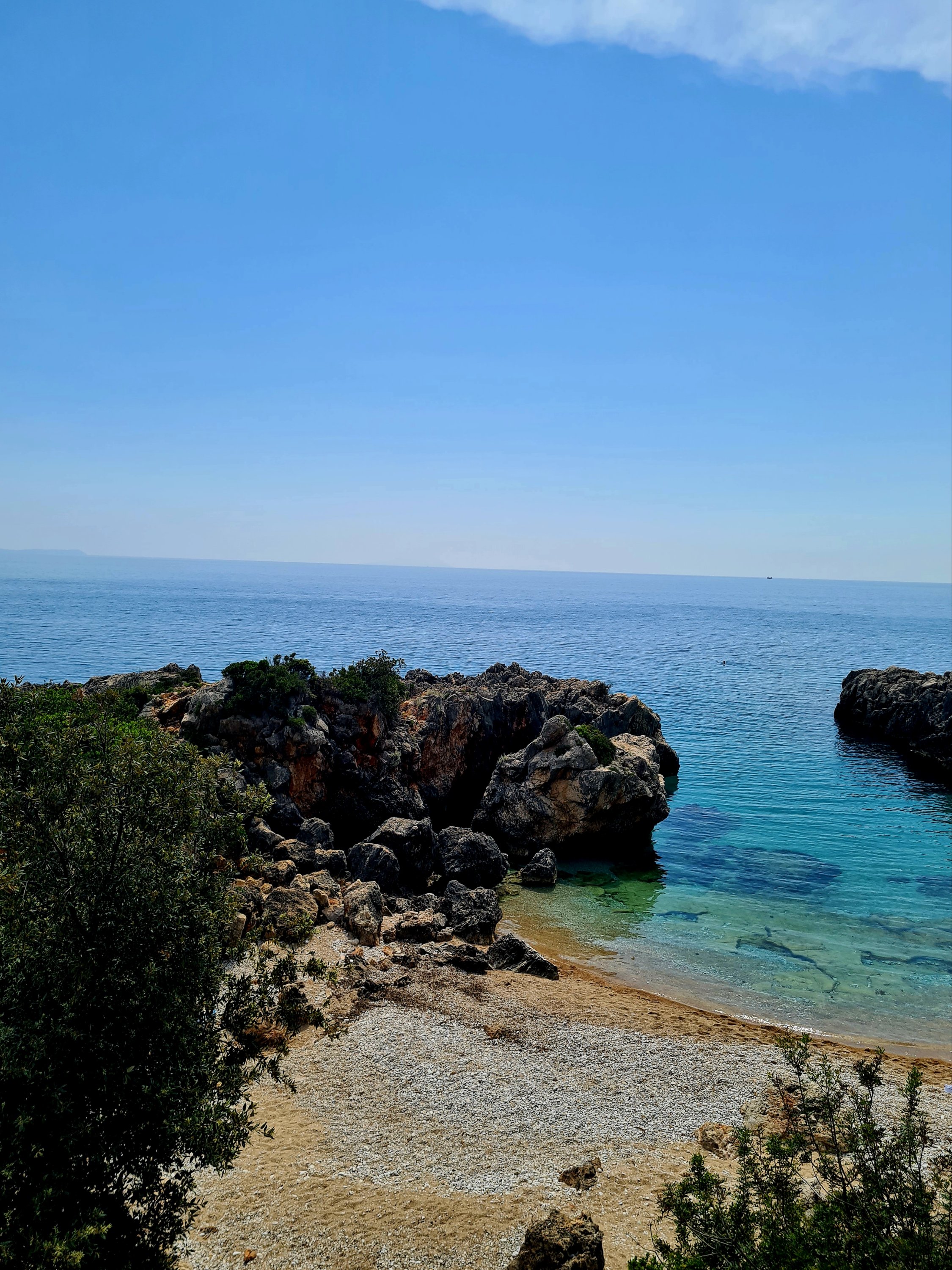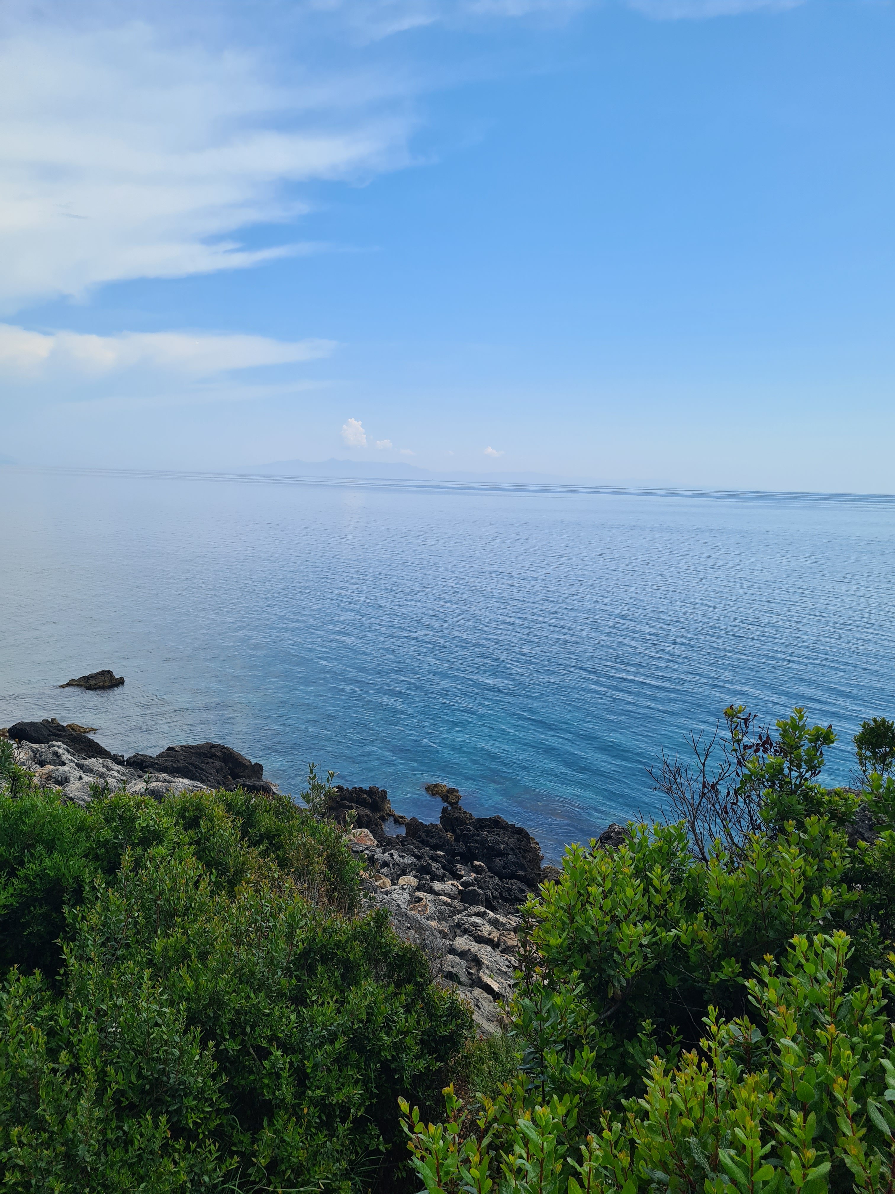 Der Himmel ist wieder einmal strahlend blau. Es ist angenehm warm, aber nicht heiß. Unserer Haut zuliebe frühstücken wir doch lieber im Schatten mit Blick auf die unbewohnte Insel Sazan.
