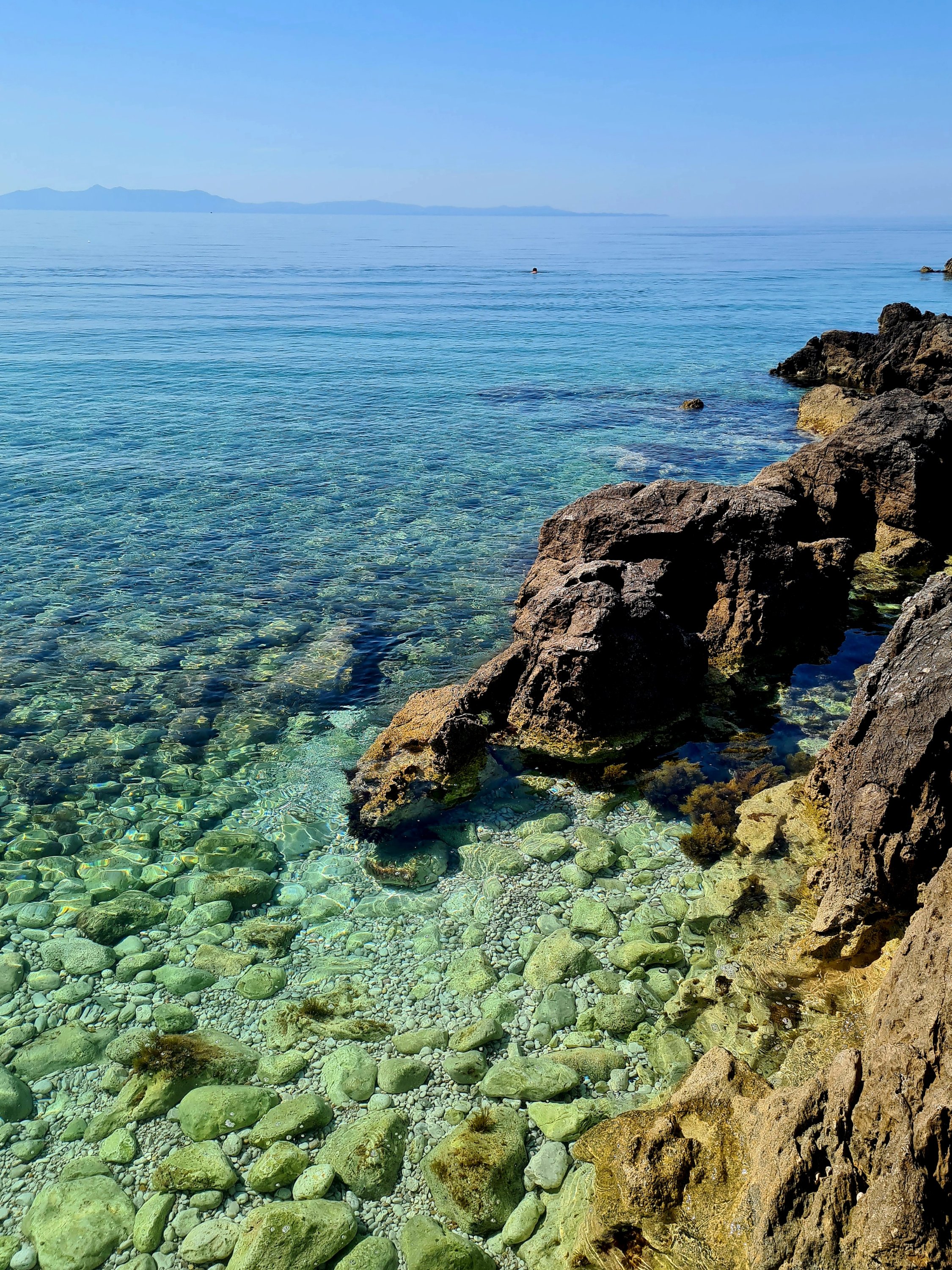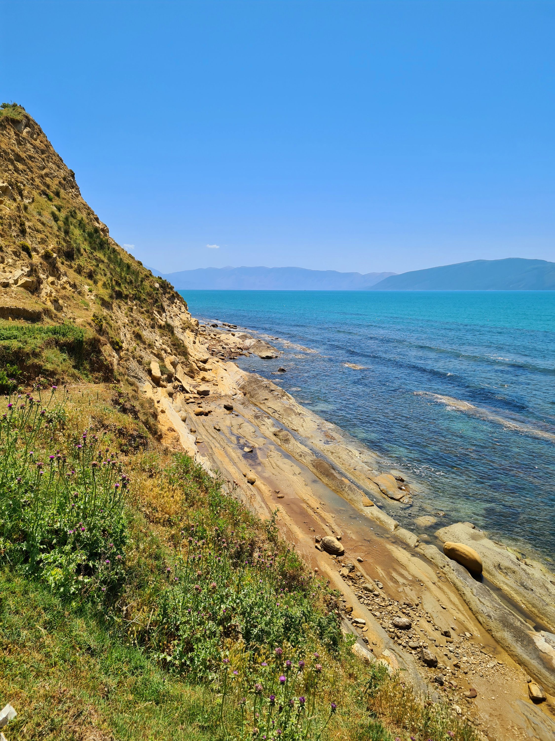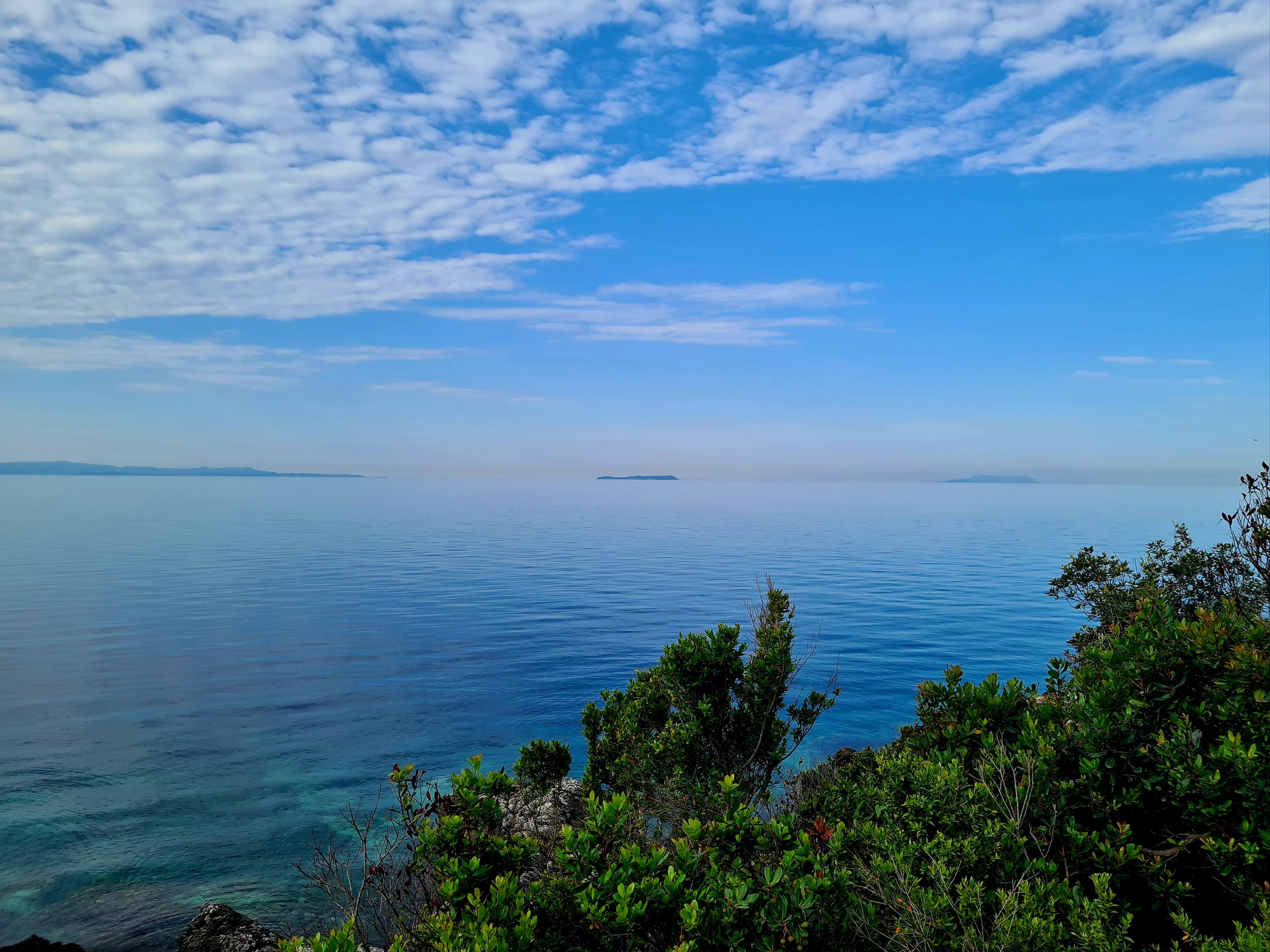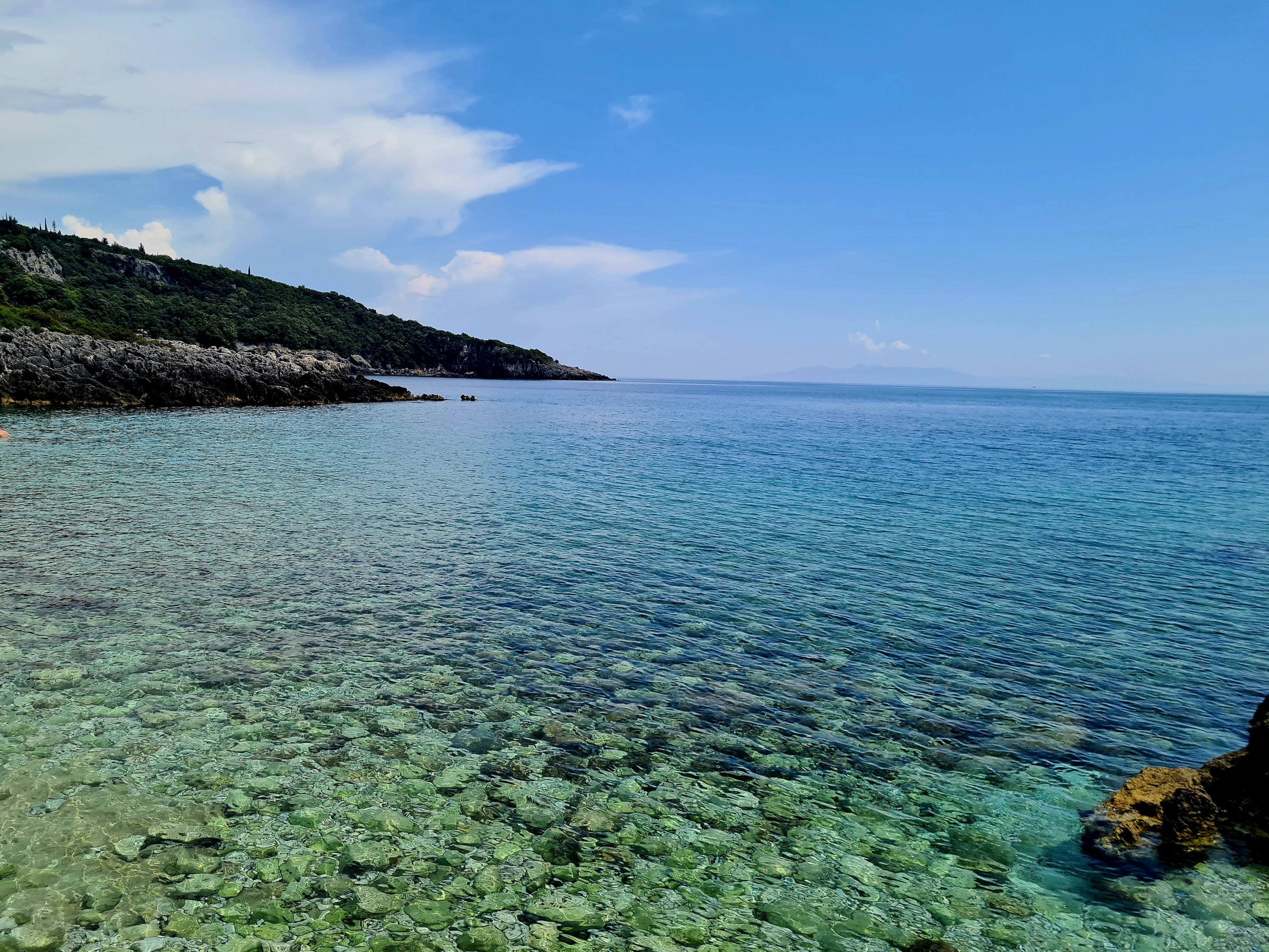 Der Himmel ist wieder einmal strahlend blau. Es ist angenehm warm, aber nicht heiß. Unserer Haut zuliebe frühstücken wir doch lieber im Schatten mit Blick auf die unbewohnte Insel Sazan.