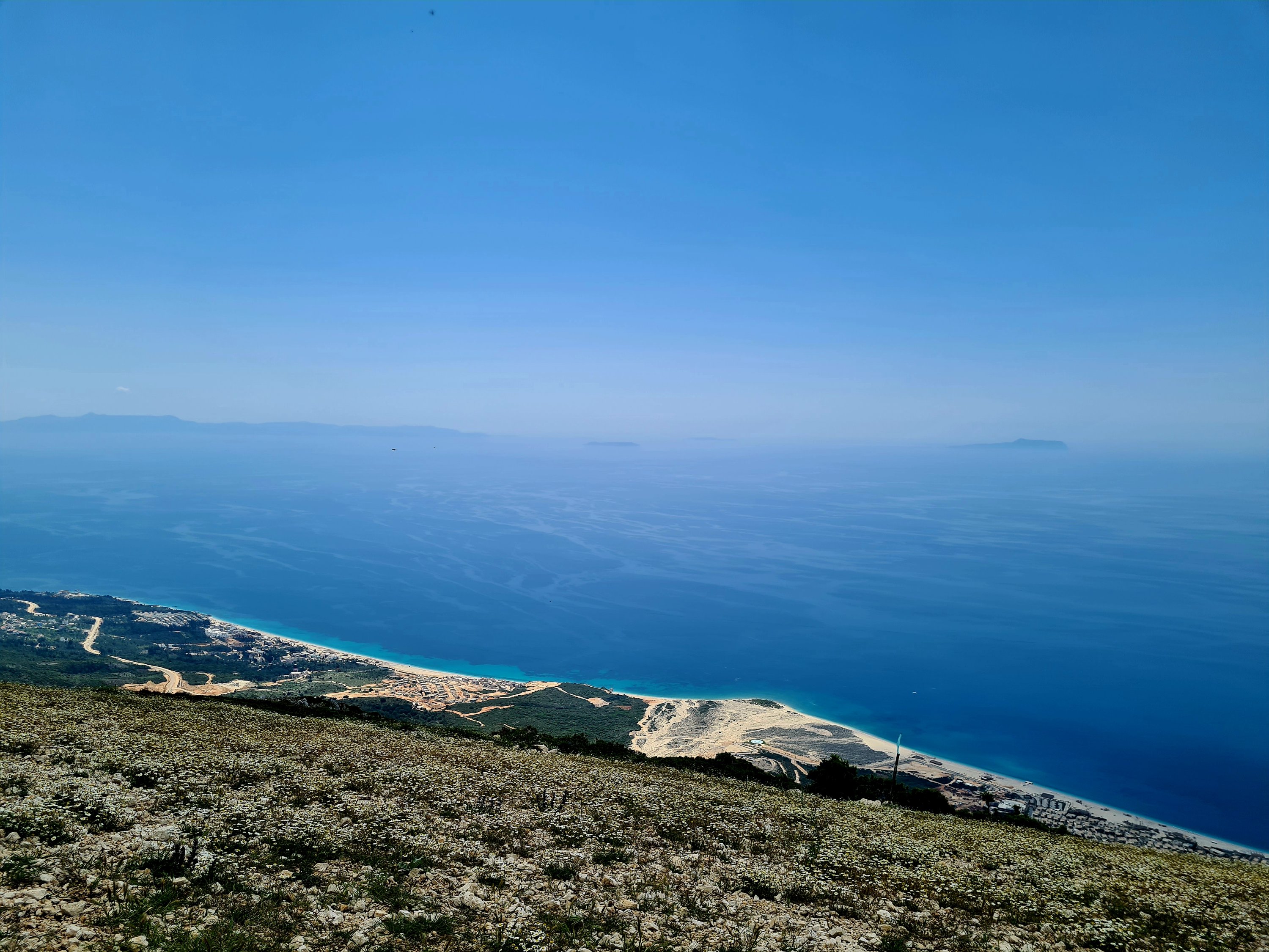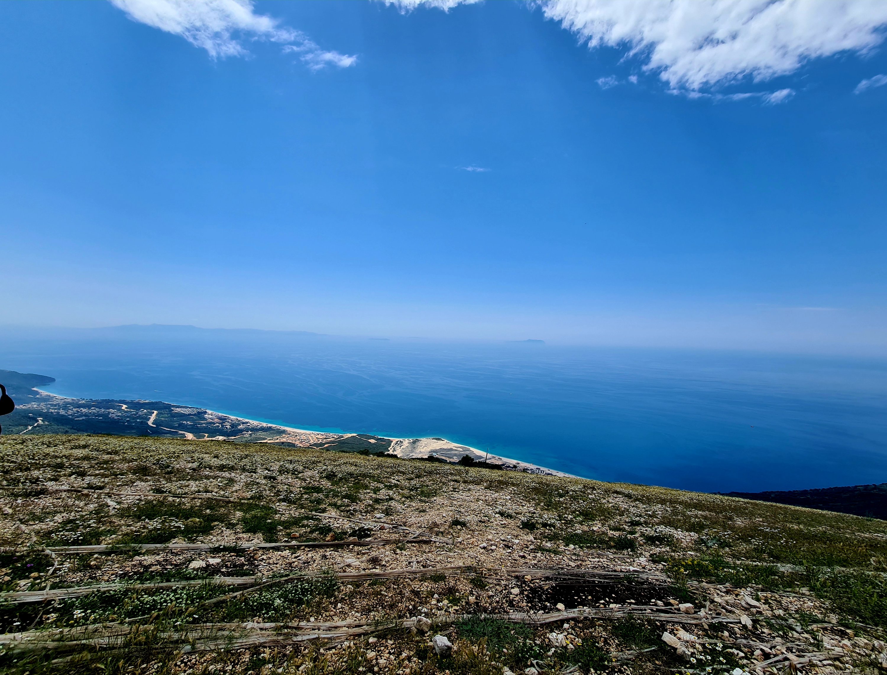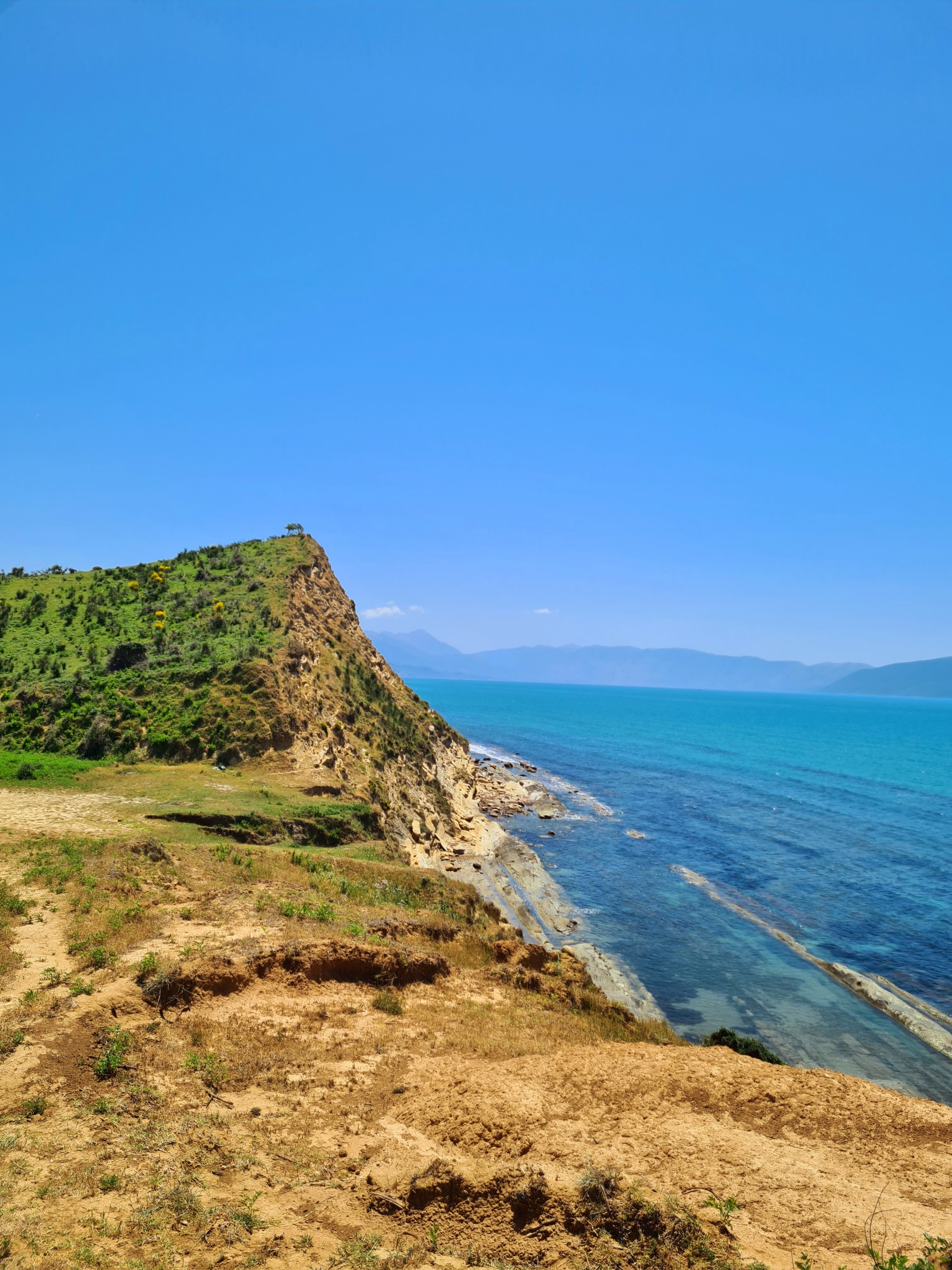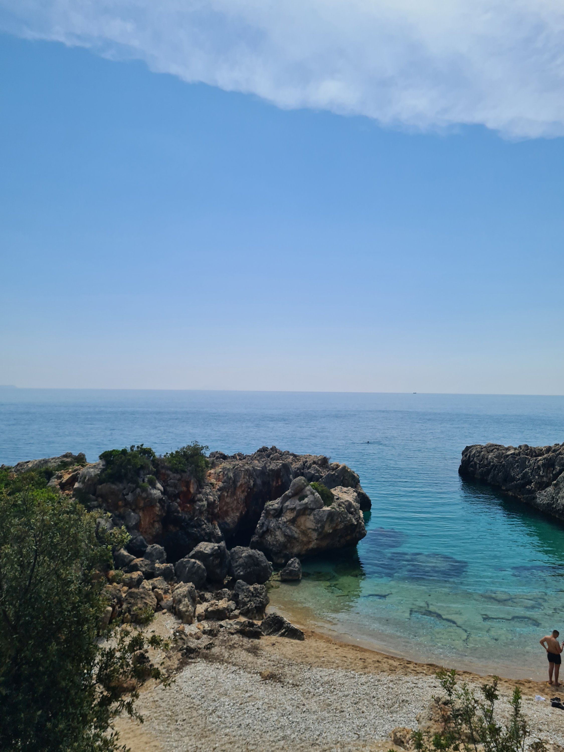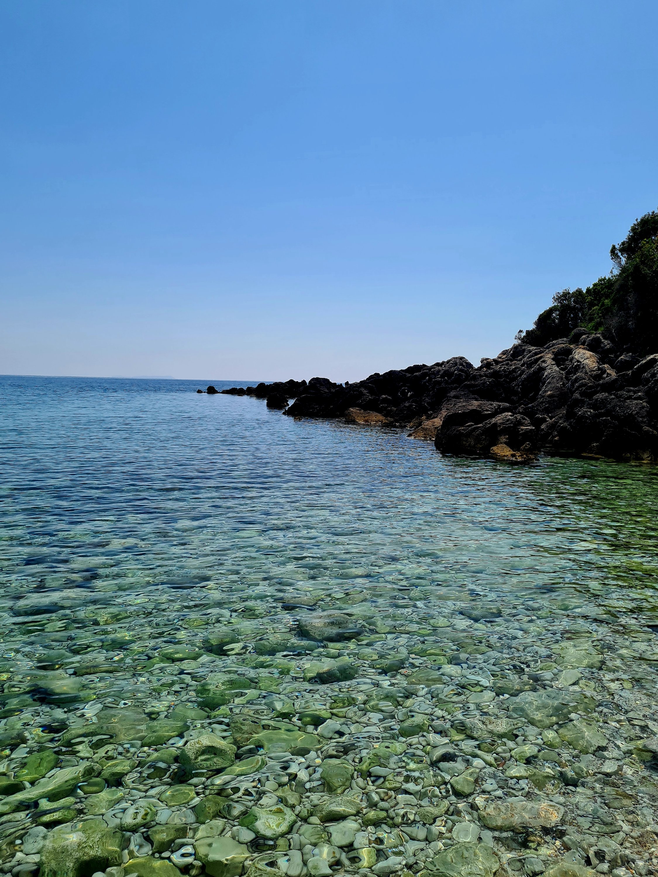 Der Himmel ist wieder einmal strahlend blau. Es ist angenehm warm, aber nicht heiß. Unserer Haut zuliebe frühstücken wir doch lieber im Schatten mit Blick auf die unbewohnte Insel Sazan.