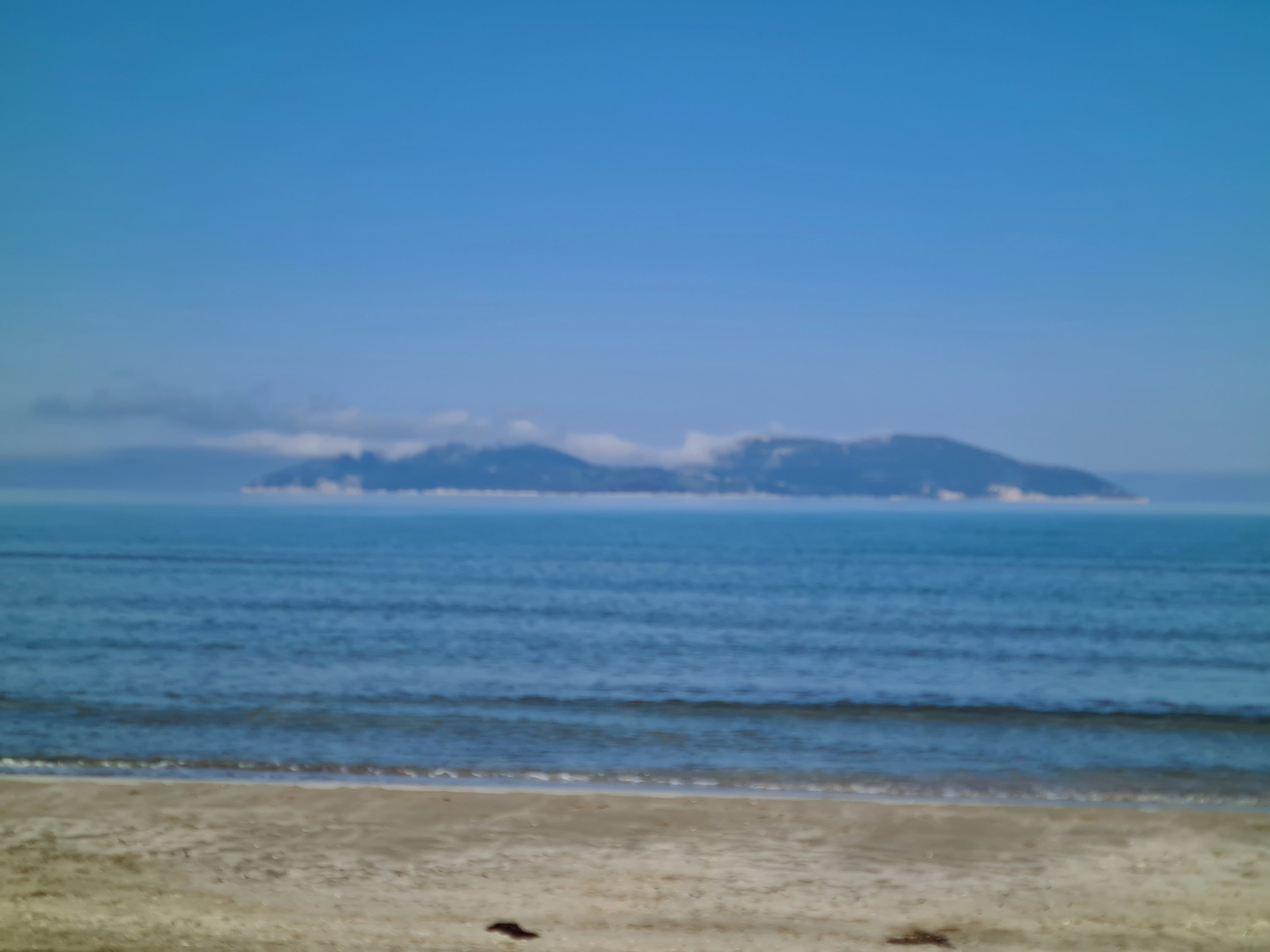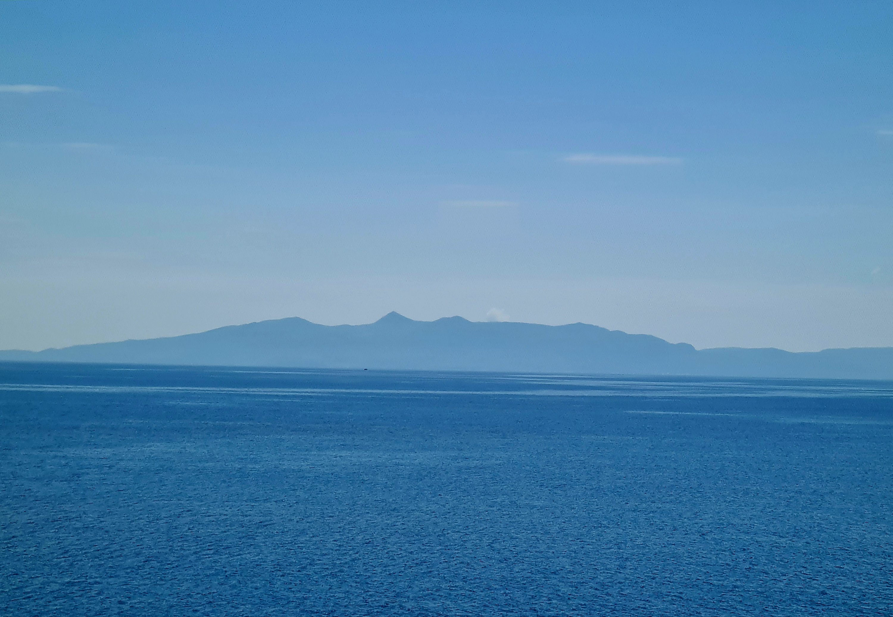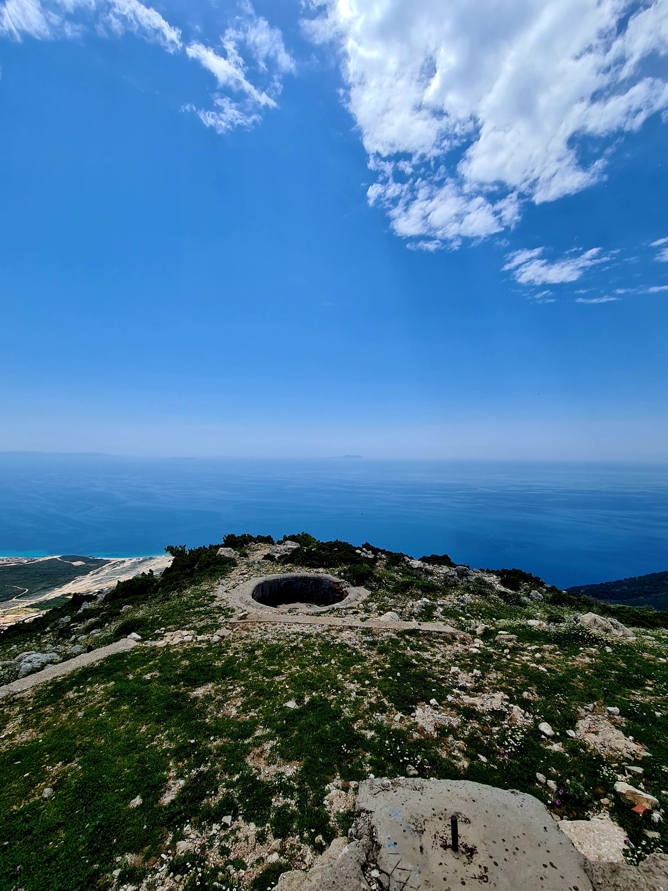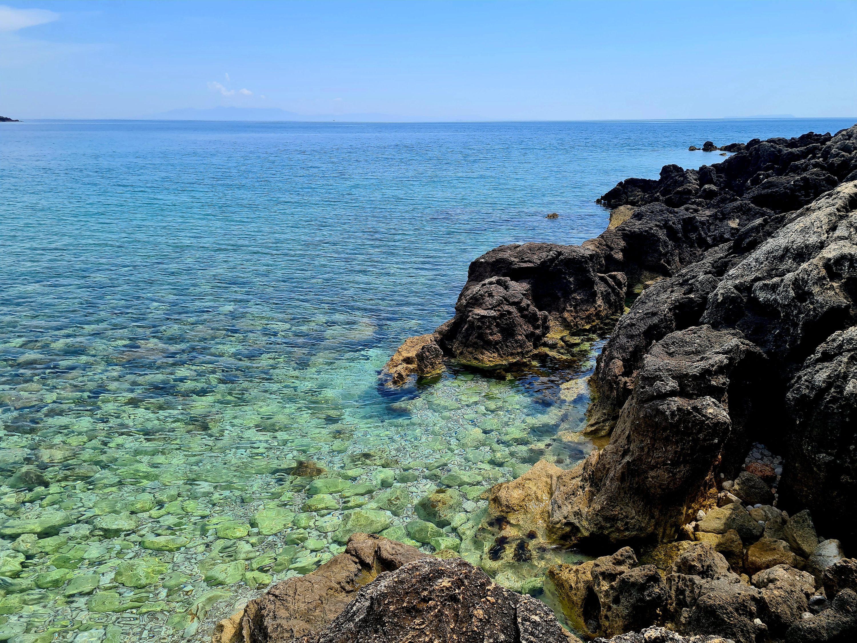Der Himmel ist wieder einmal strahlend blau. Es ist angenehm warm, aber nicht heiß. Unserer Haut zuliebe frühstücken wir doch lieber im Schatten mit Blick auf die unbewohnte Insel Sazan.