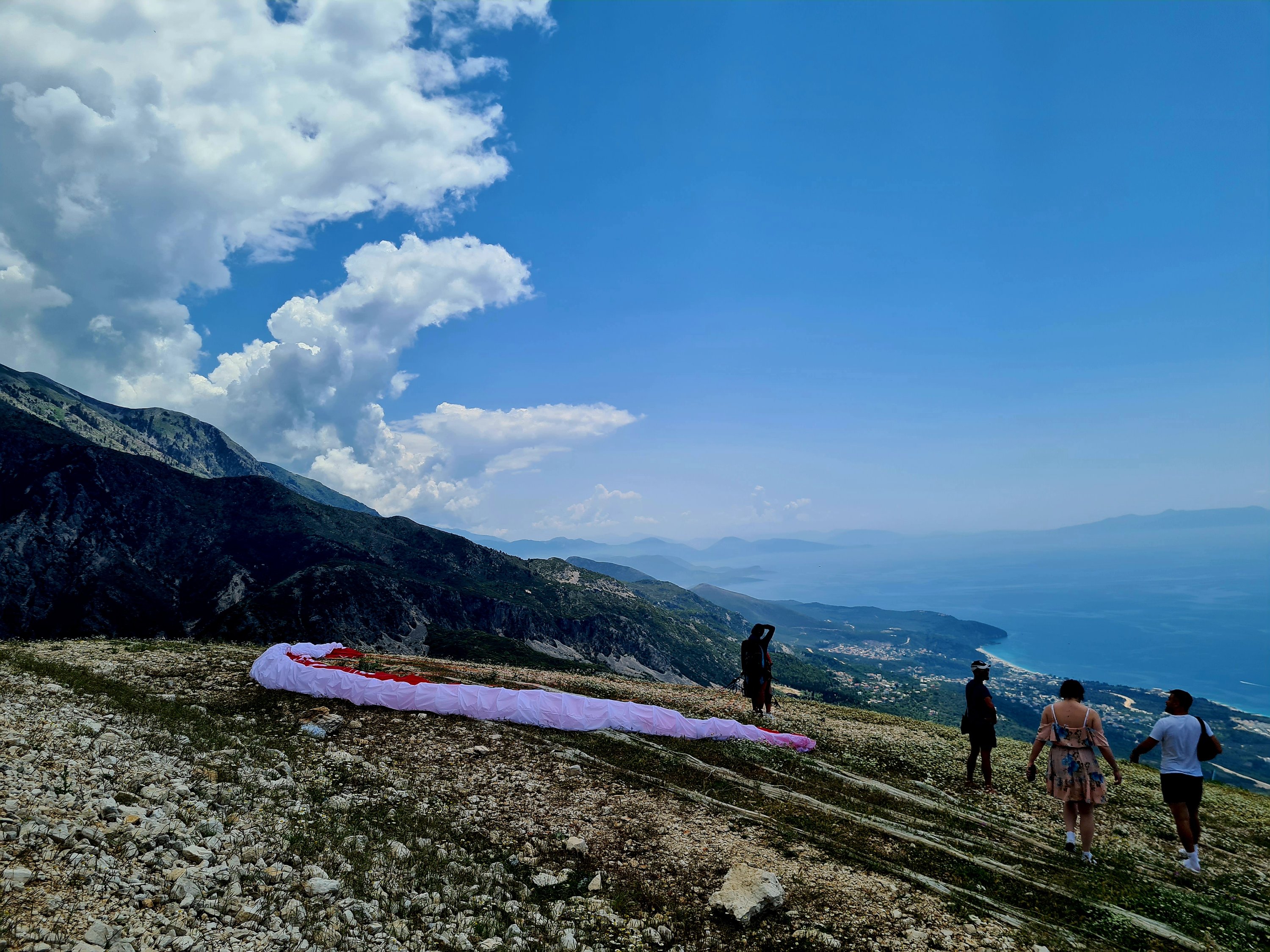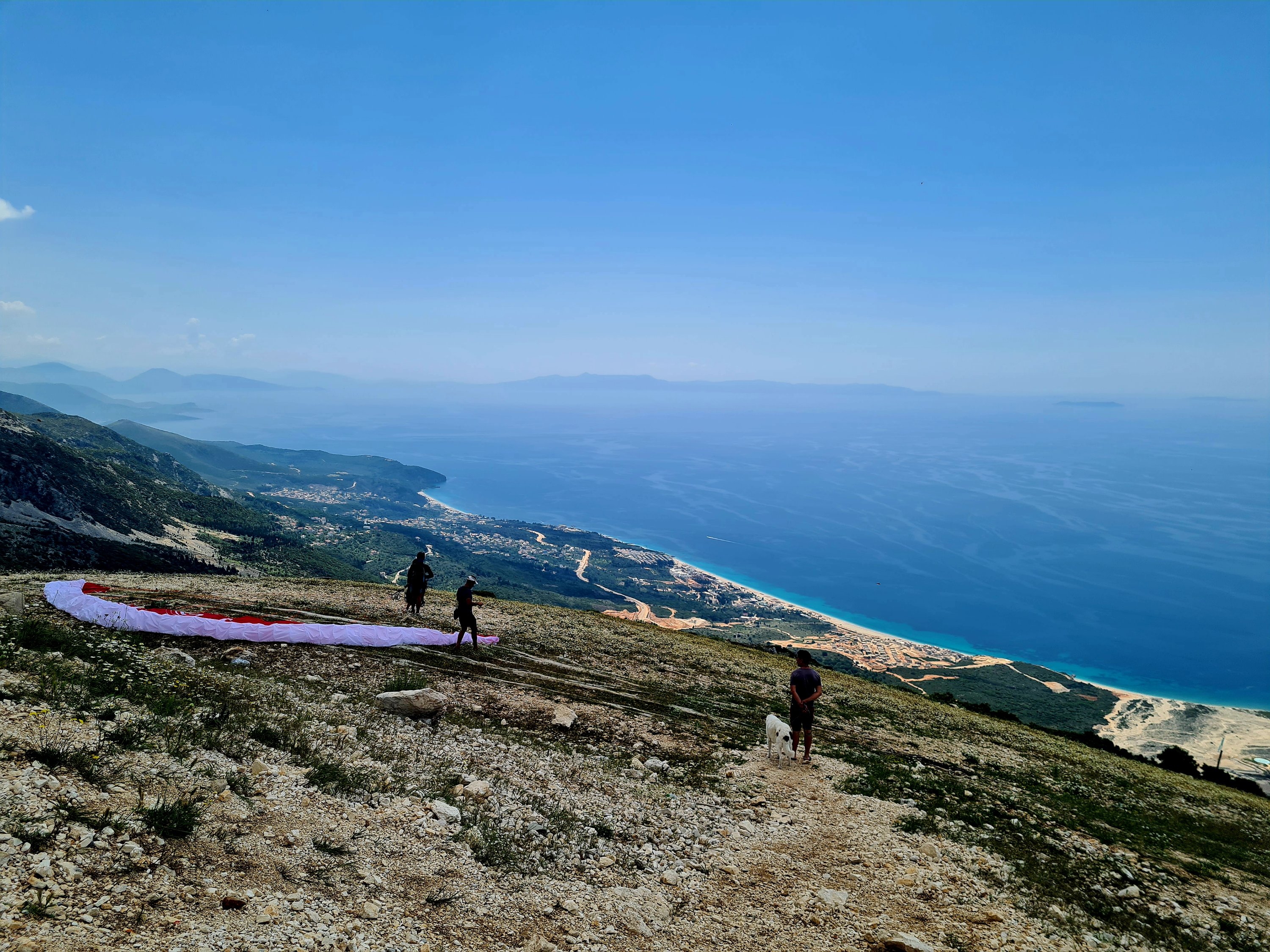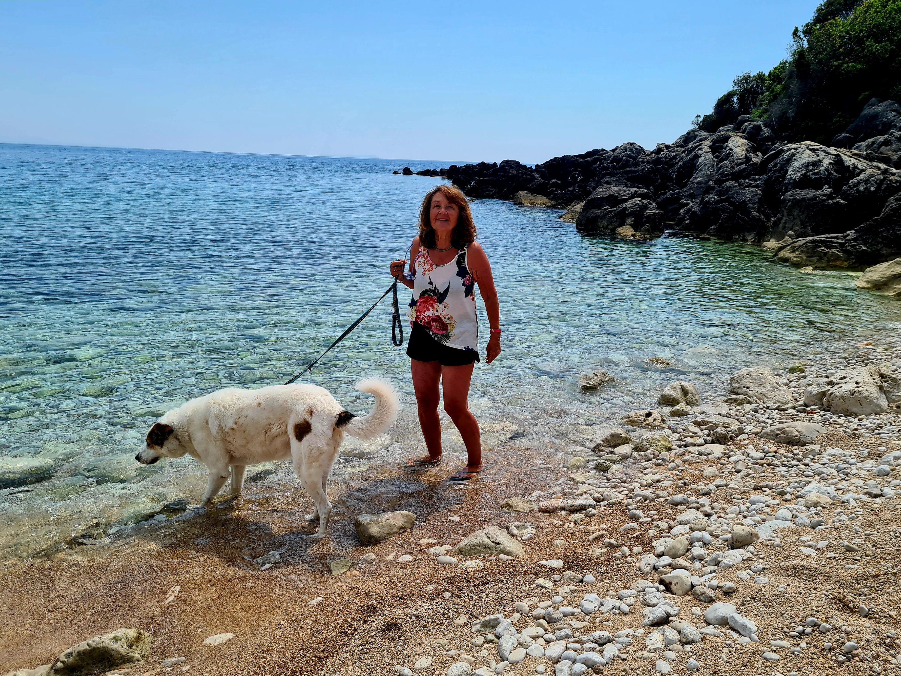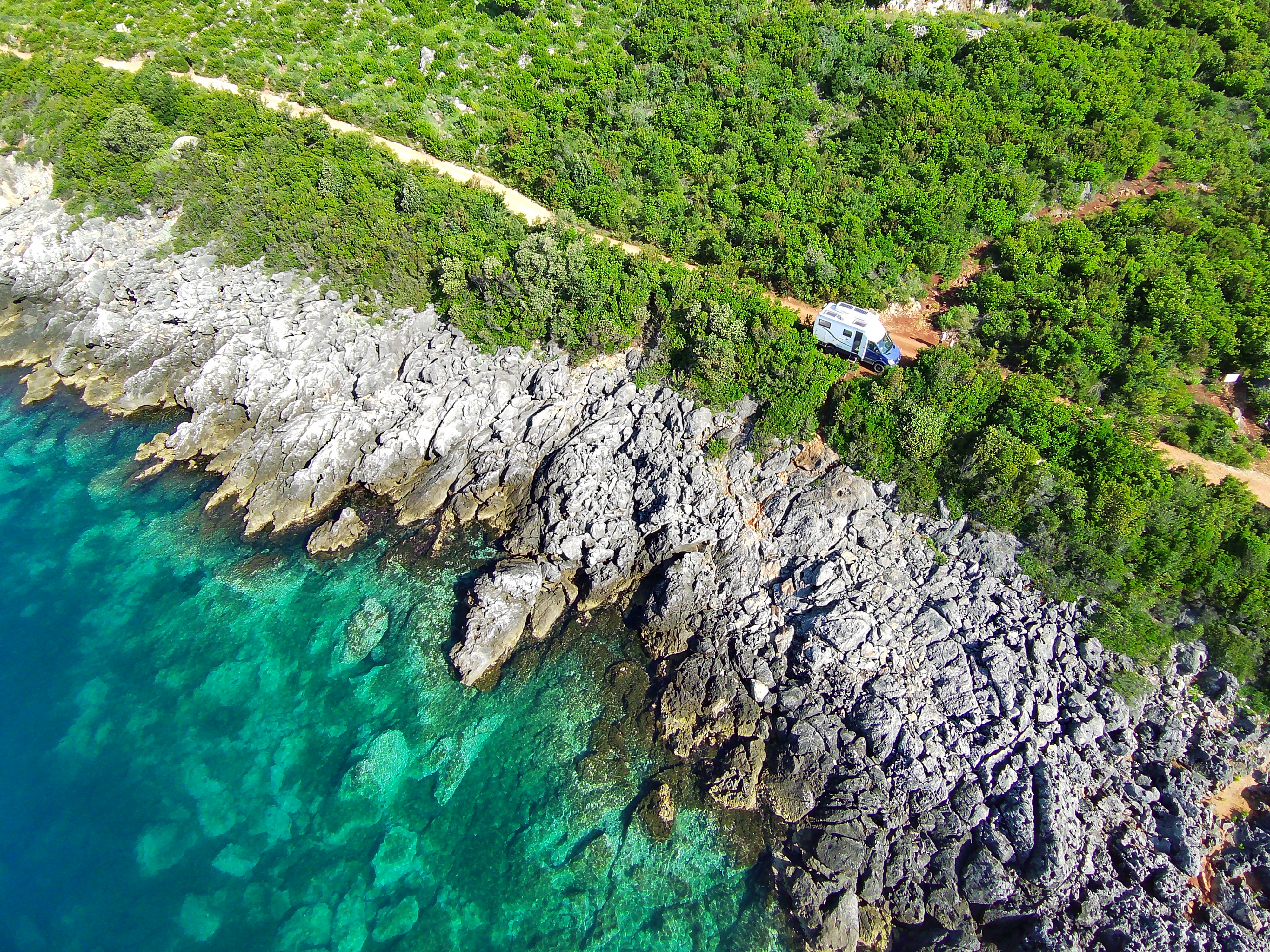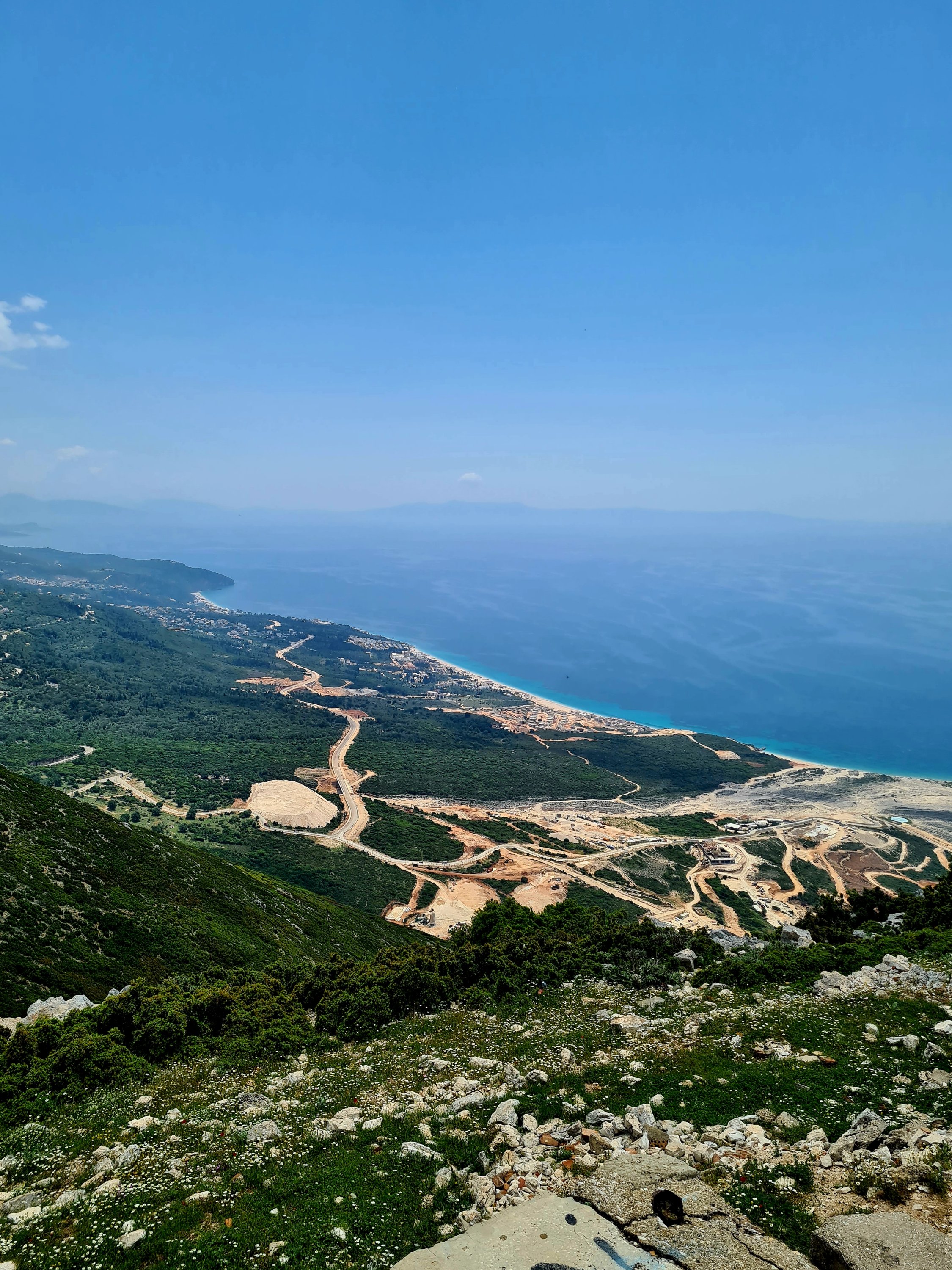 Der Himmel ist wieder einmal strahlend blau. Es ist angenehm warm, aber nicht heiß. Unserer Haut zuliebe frühstücken wir doch lieber im Schatten mit Blick auf die unbewohnte Insel Sazan.