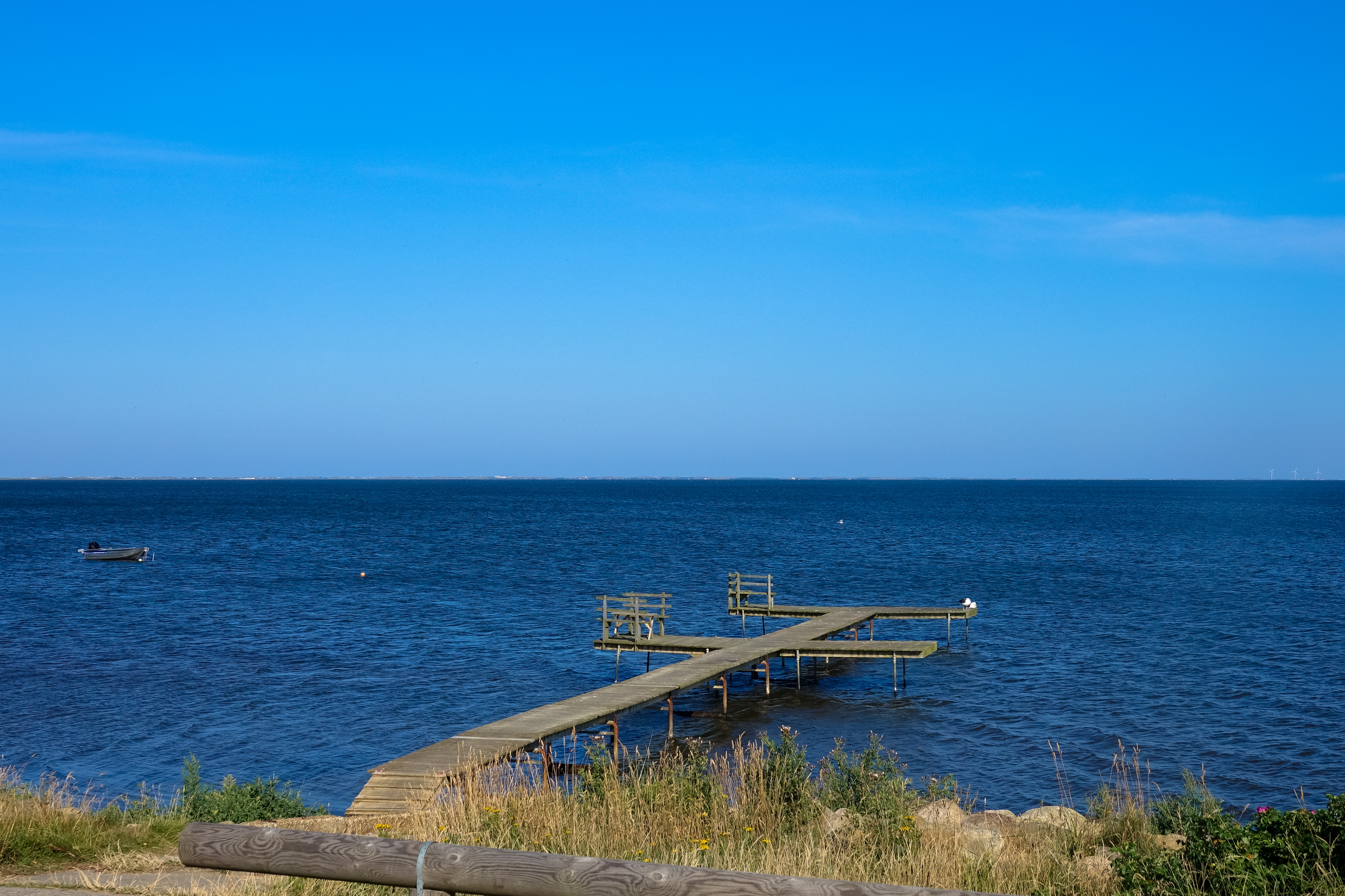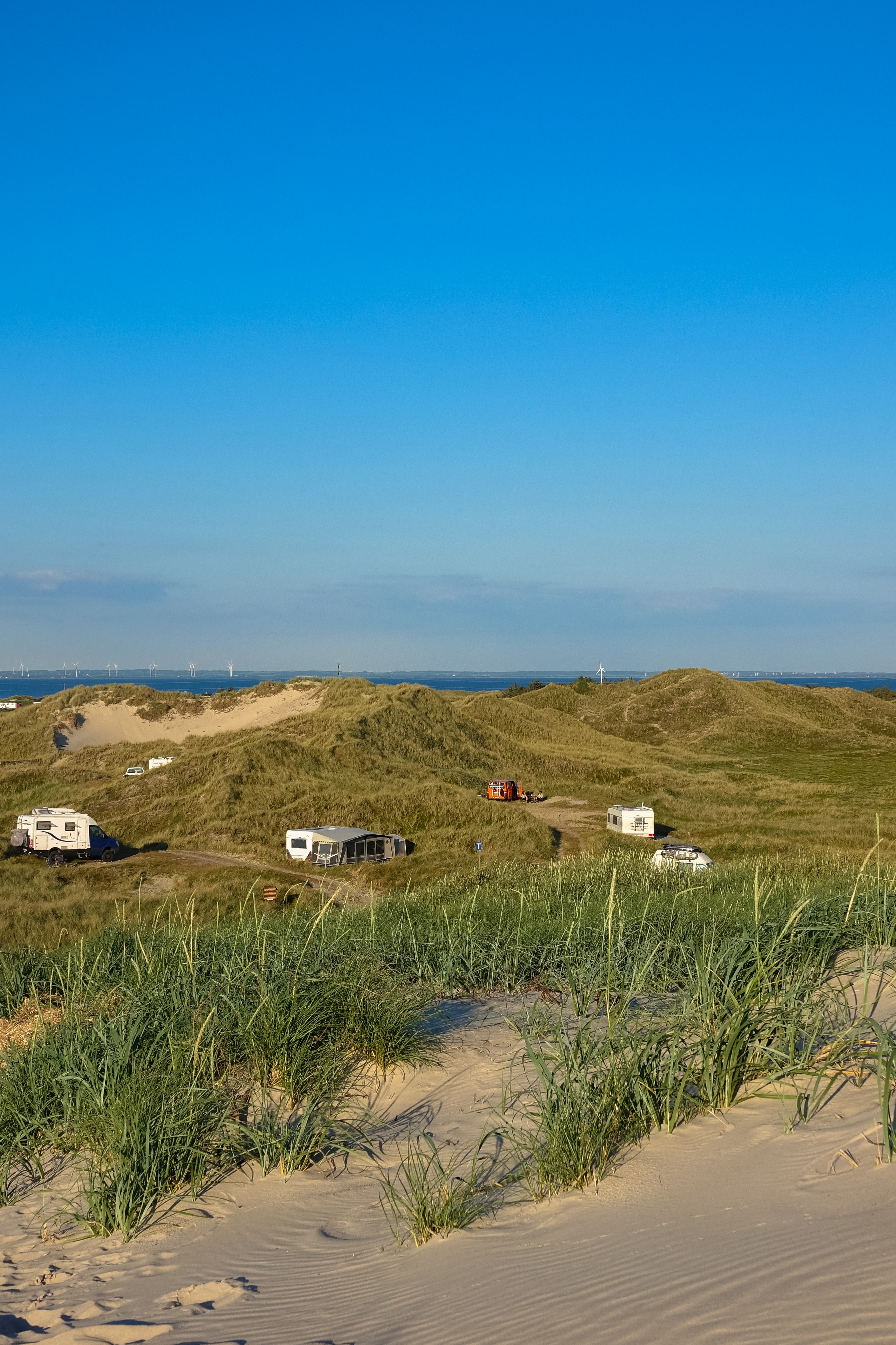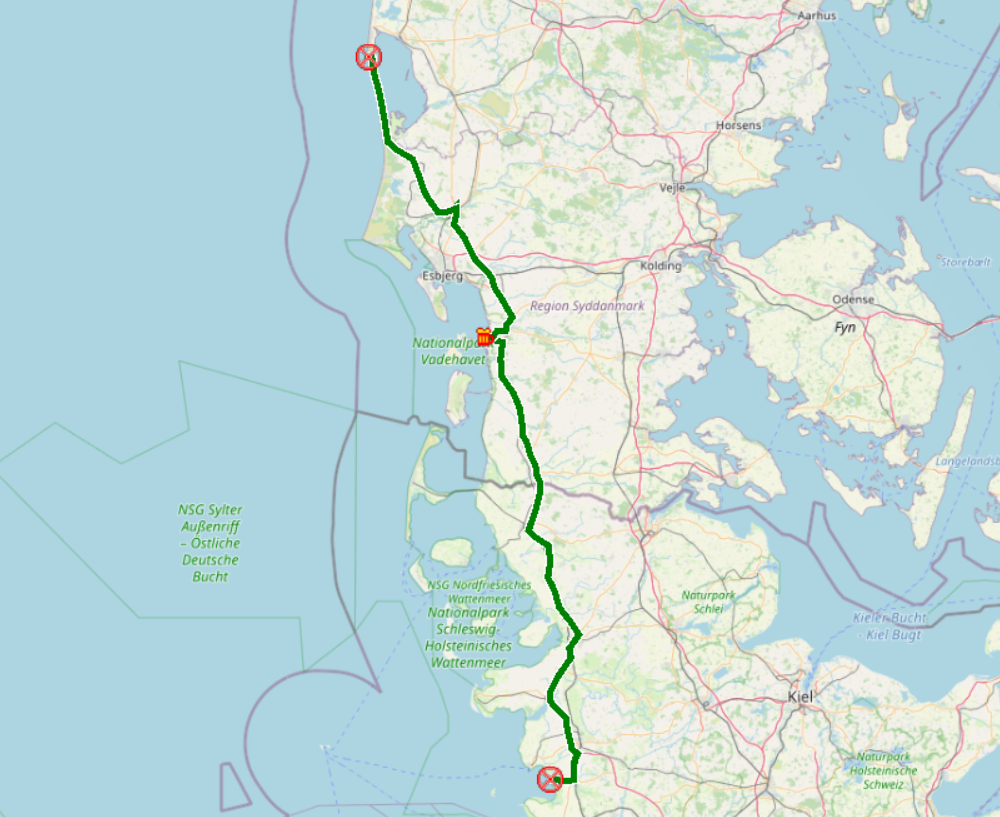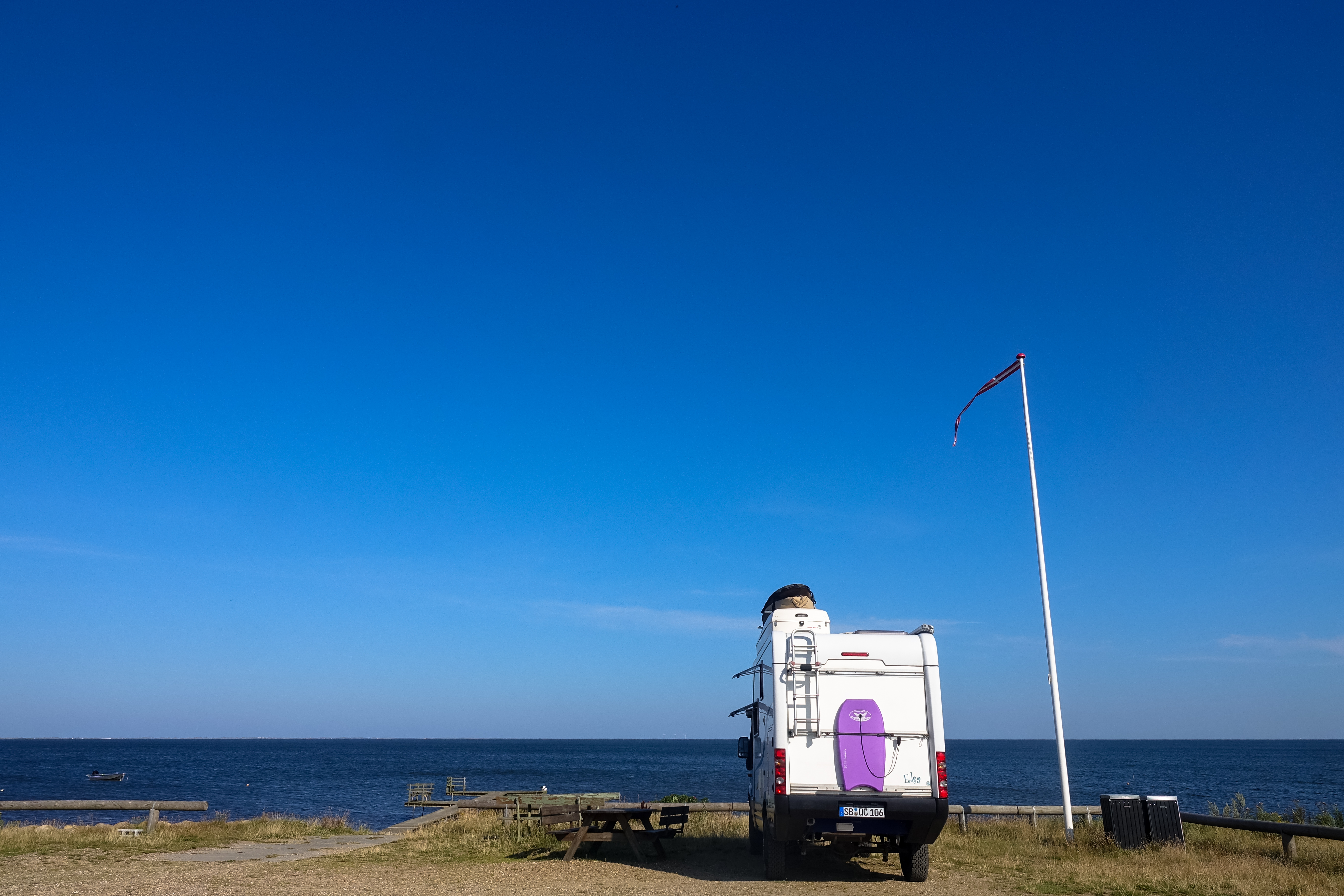 Wir haben in der Marina Handbjerg sehr ruhig geschlafen und sogar die Hunde werden hier verwöhnt, beide bekommen morgens vom Hafenmeister eine Tüte mit Leckerchen. Beim Frühstück können wir durch die Frontscheibe bei einer Segelregatta zusehen, aber für uns ist der Wind zu schwach, gerade einmal 12 Knoten, reicht nicht. Also wollen wir den weiteren Küstenverlauf nördlich von Ejsingholm erkunden und uns in Spøttrup eine mittelalterliche Wasserburg ansehen. Es regnet nicht, trotzdem ist der Himmel bewölkt, also ideales Wanderwetter. Die Dänen sind wirklich zu beneiden, es gibt hier endlos viele Strände, immer gemütlich hergerichtet mit Badesteg und Picknickplätzchen.