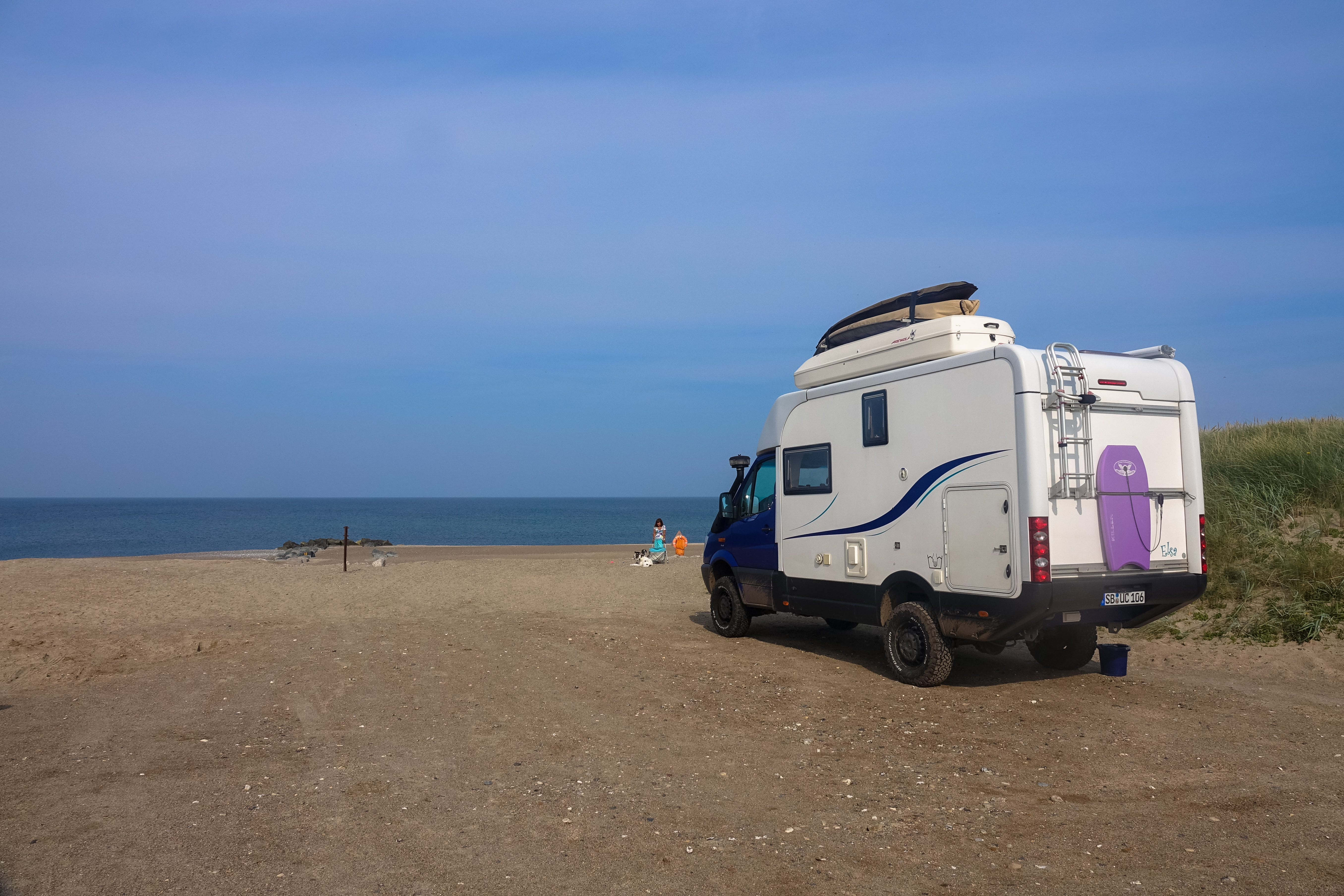 Und dann geht es vorbei an Klitmøller nach Norden. Wir wollen heute zu den großartigen befahrbaren Stränden in der Jammerbucht. Dänemarkurlaub ohne einmal auf den Strand zu fahren, geht nämlich gar nicht. Aber schon wieder haben wir etwas falsch abgespeichert. Ejstrup ist doch nicht der erste befahrbare Strand. Trotzdem bleiben wir erst einmal hier zum Lesen und picknicken.