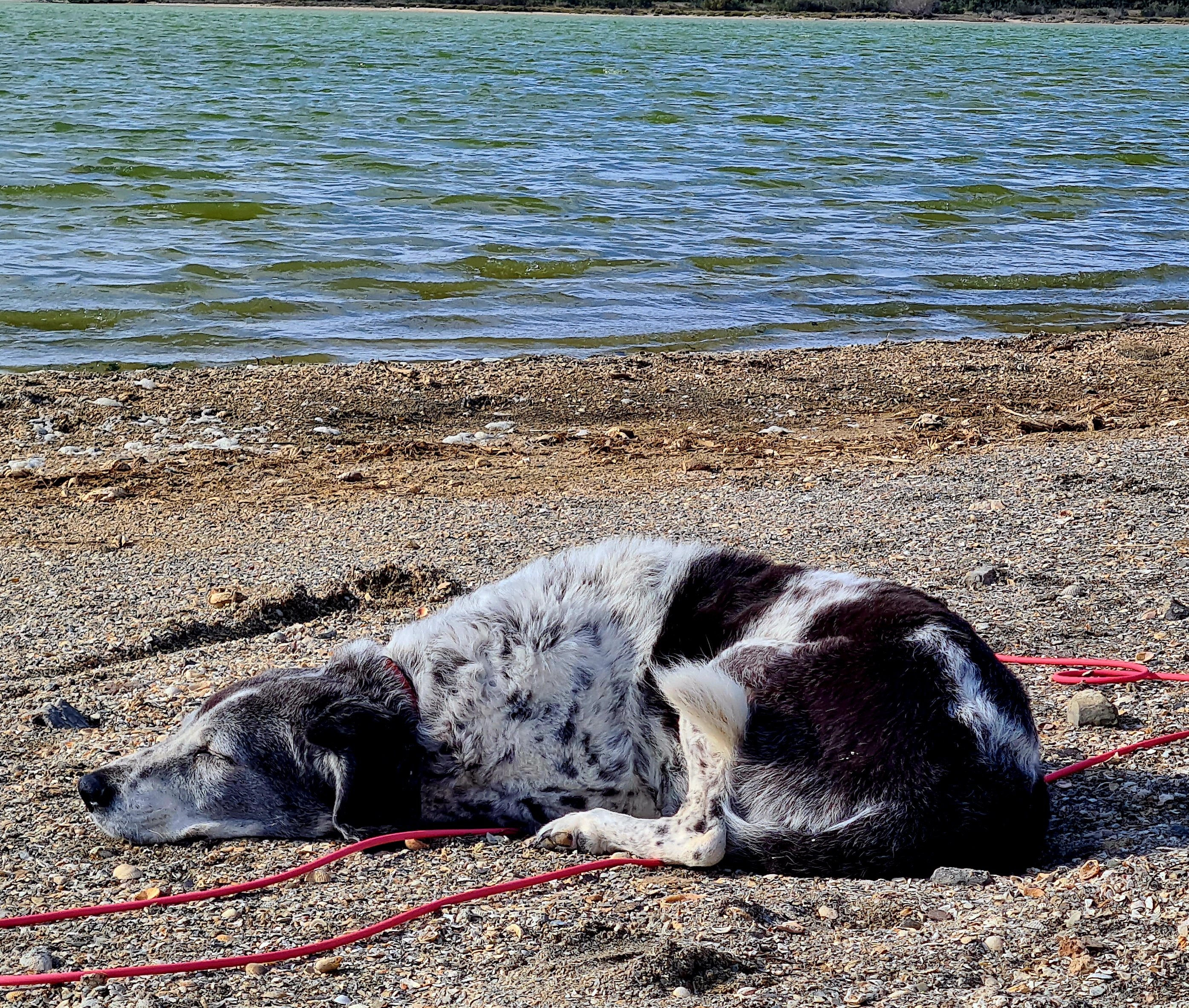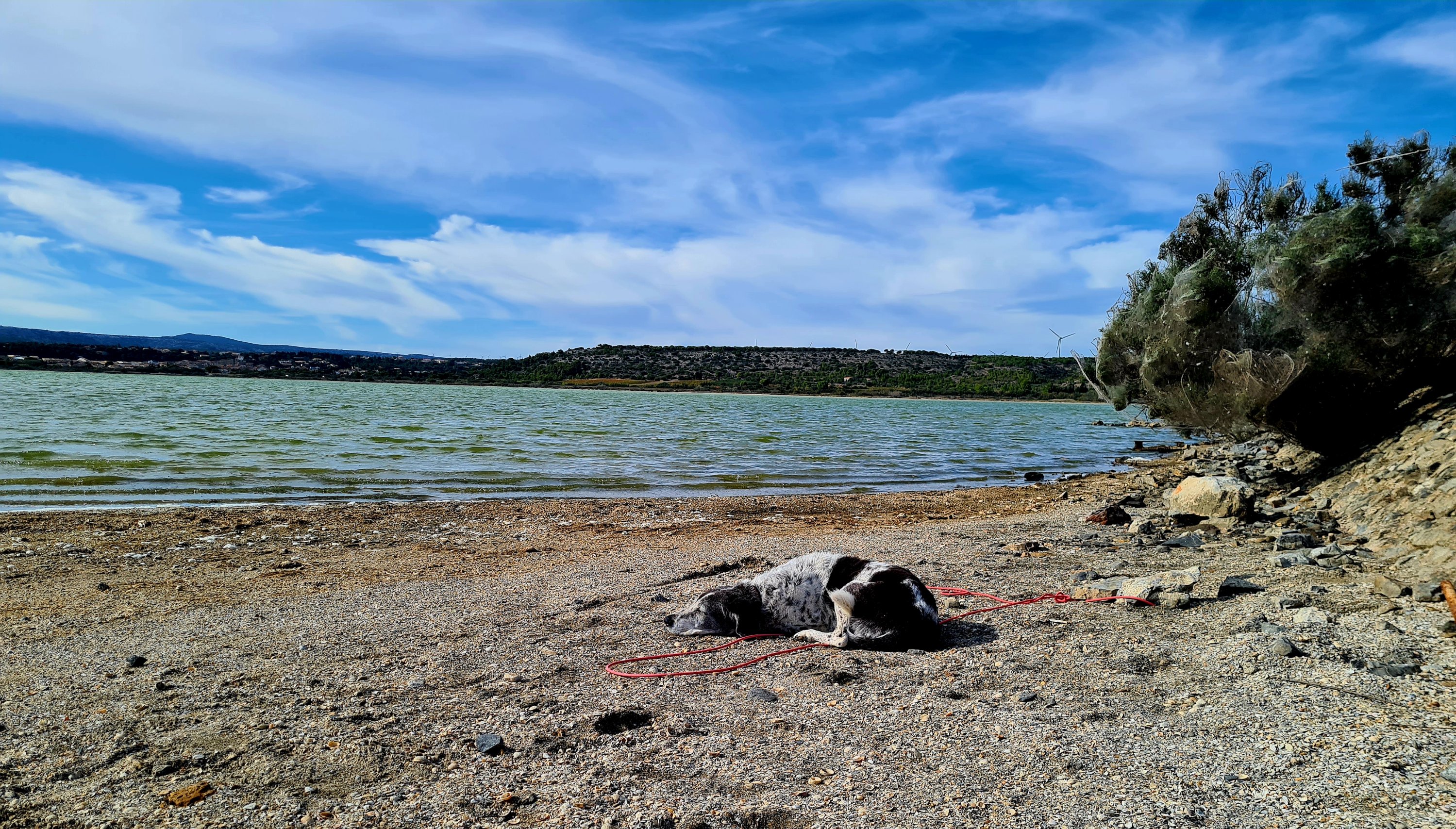 Nachdem wir durch das Örtchen gebummelt sind, essen wir die Pizzareste von gestern Abend und lassen Mina vor der Weiterfahrt zu unserem Übernachtungsplatz in Malzieu noch ein bisschen entspannen. In La Couvertoirade ist es bereits deutlich kühler als am Meer. Heute Morgen in Fitou waren es 20⁰, hier sind es nur noch 15⁰.