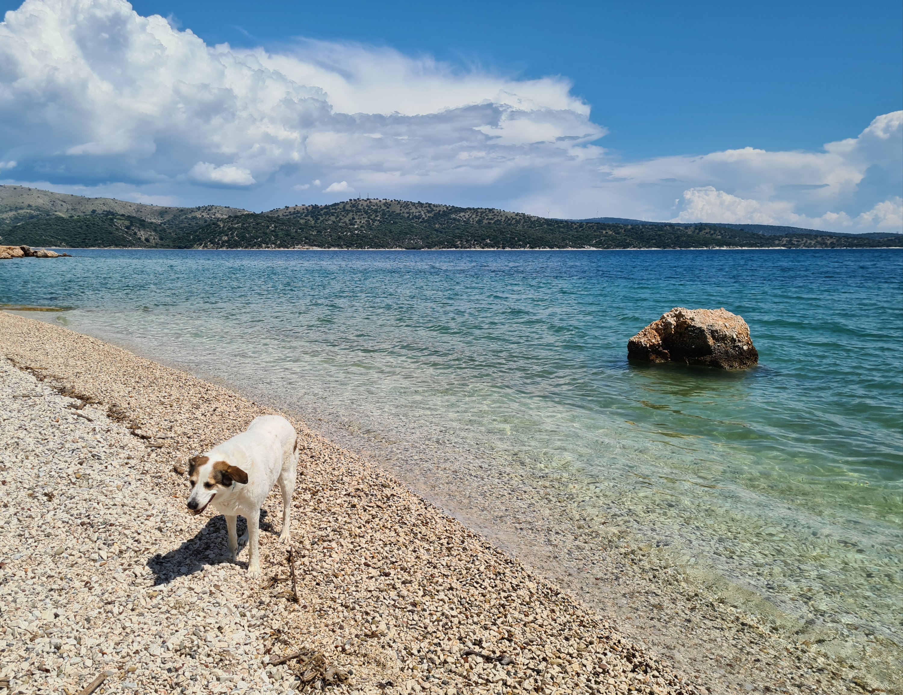 Tsimari hat endlose Strände und liebe Strandhunde.