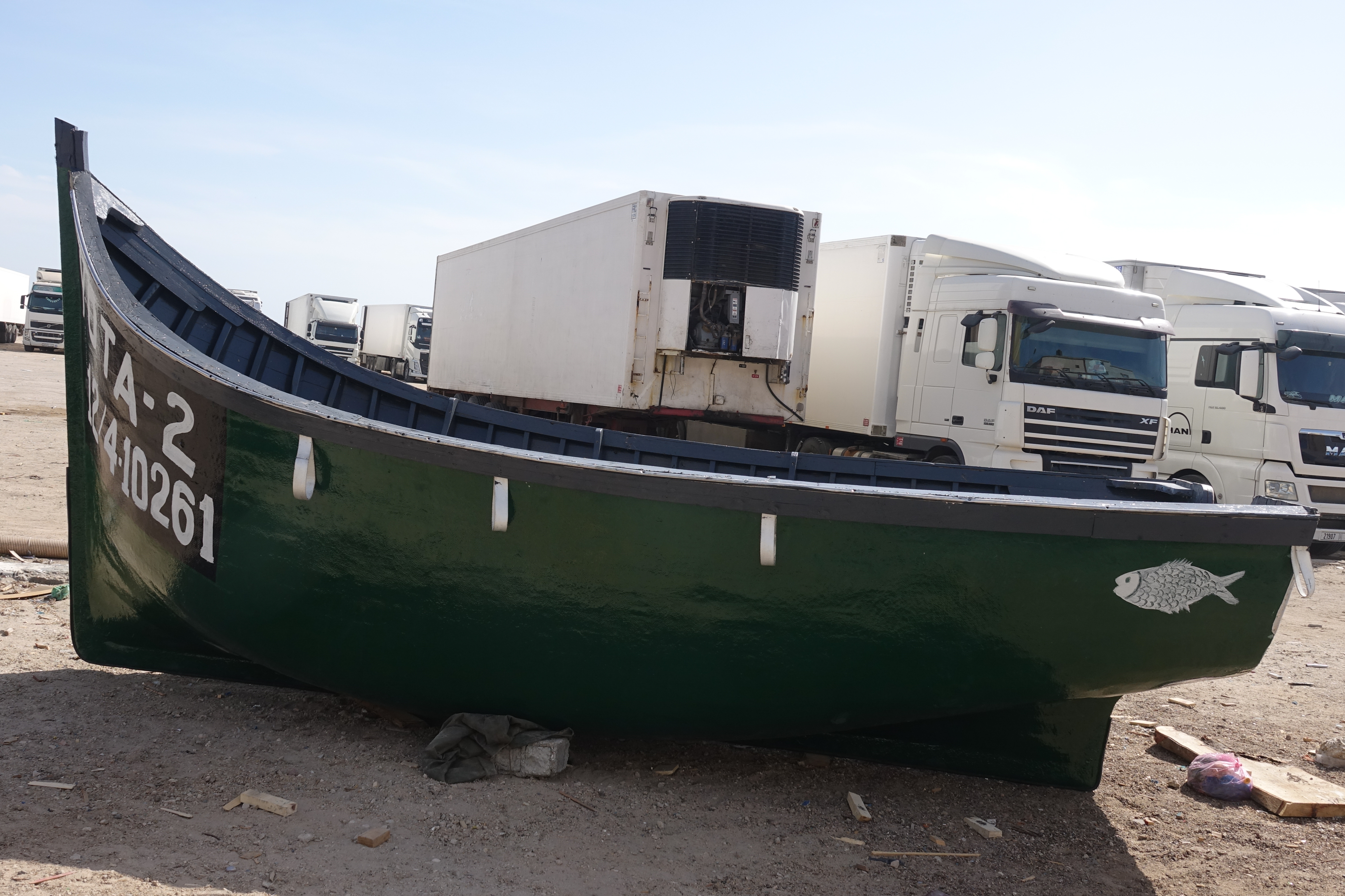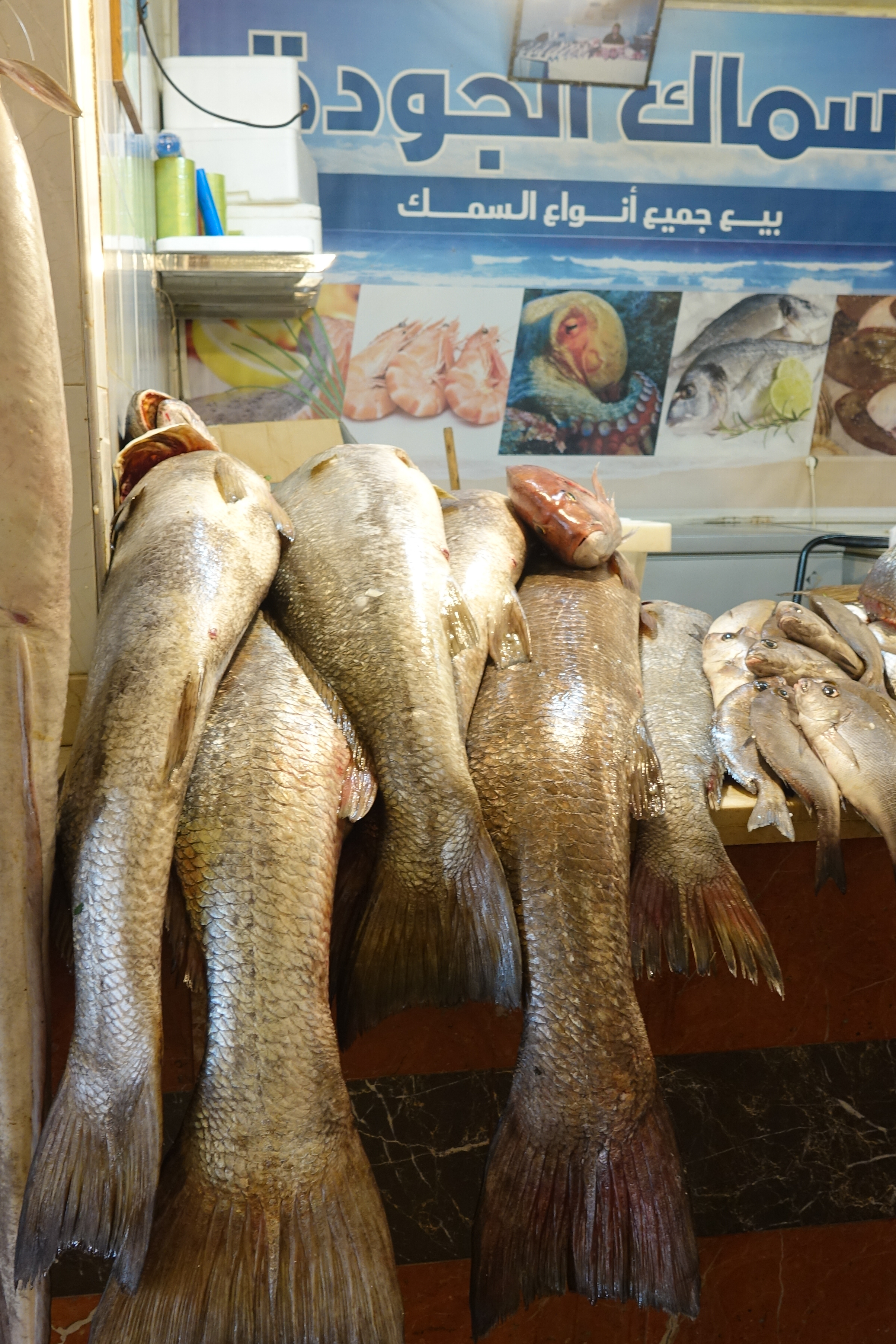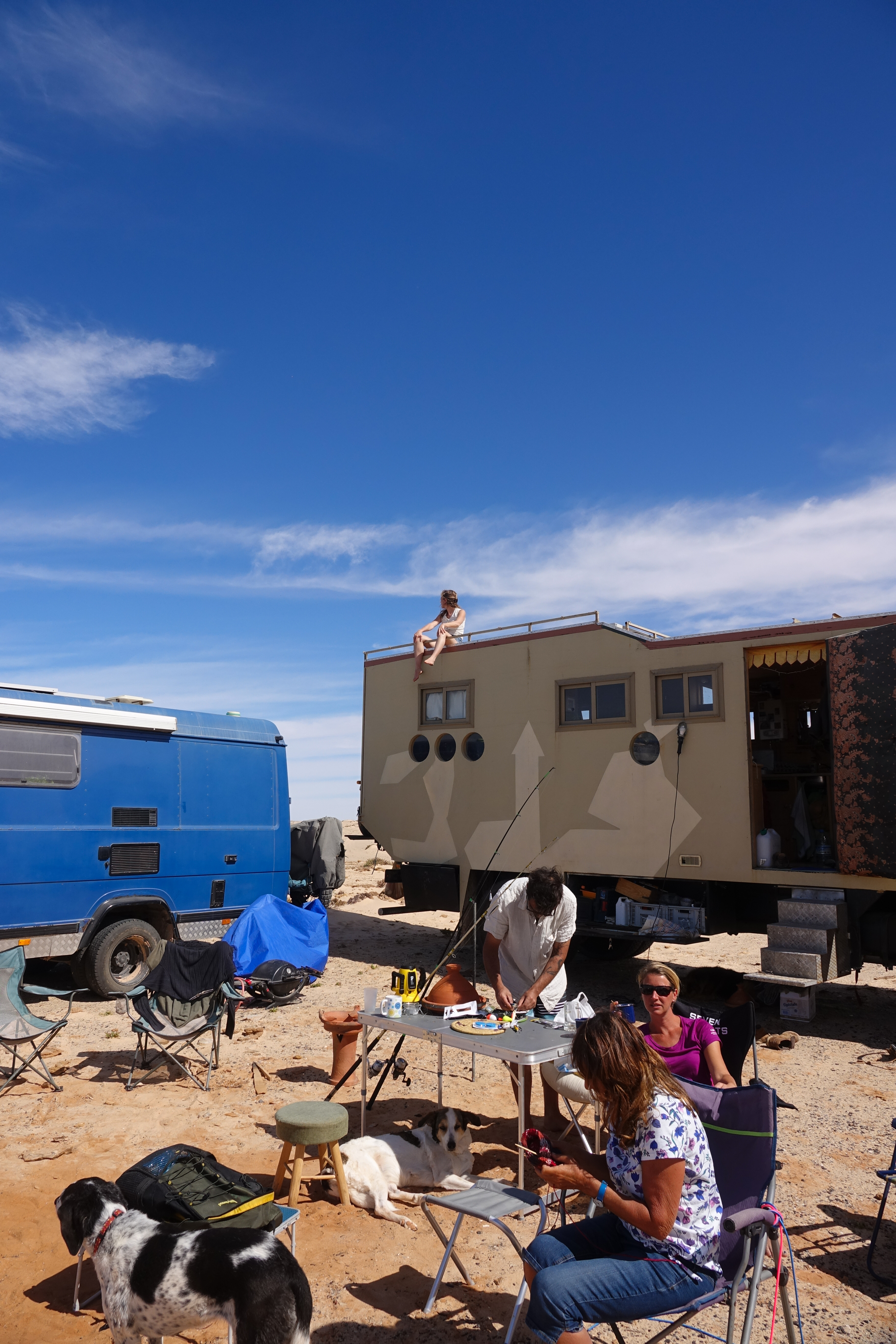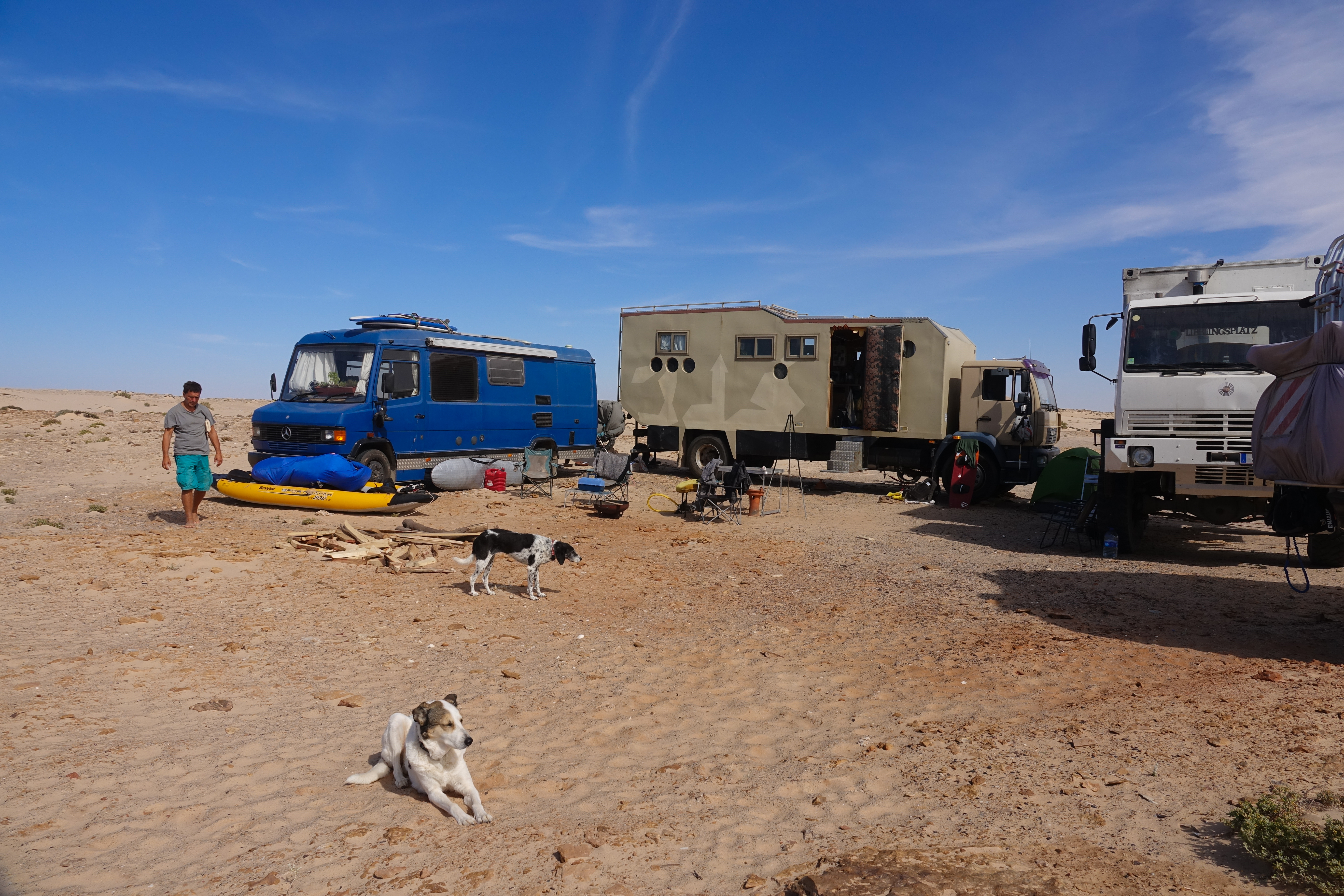 Und die meisten von uns müssen nach Dakhla zum Ergänzen der Lebensmittelvorräte. Wir wollen noch ein bisschen an der White Dune bleiben, weil sich das Zusammenspiel von Wind und Gezeitenstand in den nächsten Tagen positiv verändern soll, d.h. das Wasser ist nicht so weit von unserem Camp weg. Wir bringen Sam zum PK 25 und checken dort nochmals die Lage. Der Platz ist mehr als rappelvoll und einige Platzhirsche blockieren ein unverhältnismäßig großes Areal, damit sie ihren Zweitwagen parken können und die Segel liegen aufgeriggt unterm Partyzelt. Das ist uns definitiv zu blöd. Mit Becca und Fanny starten wir dann zum Großeinkauf in Dakhla. Fanny kennt sich als Südfranzösin supergut mit Fisch aus und bald ist das Überleben in der Wüste wieder sichergestellt.
