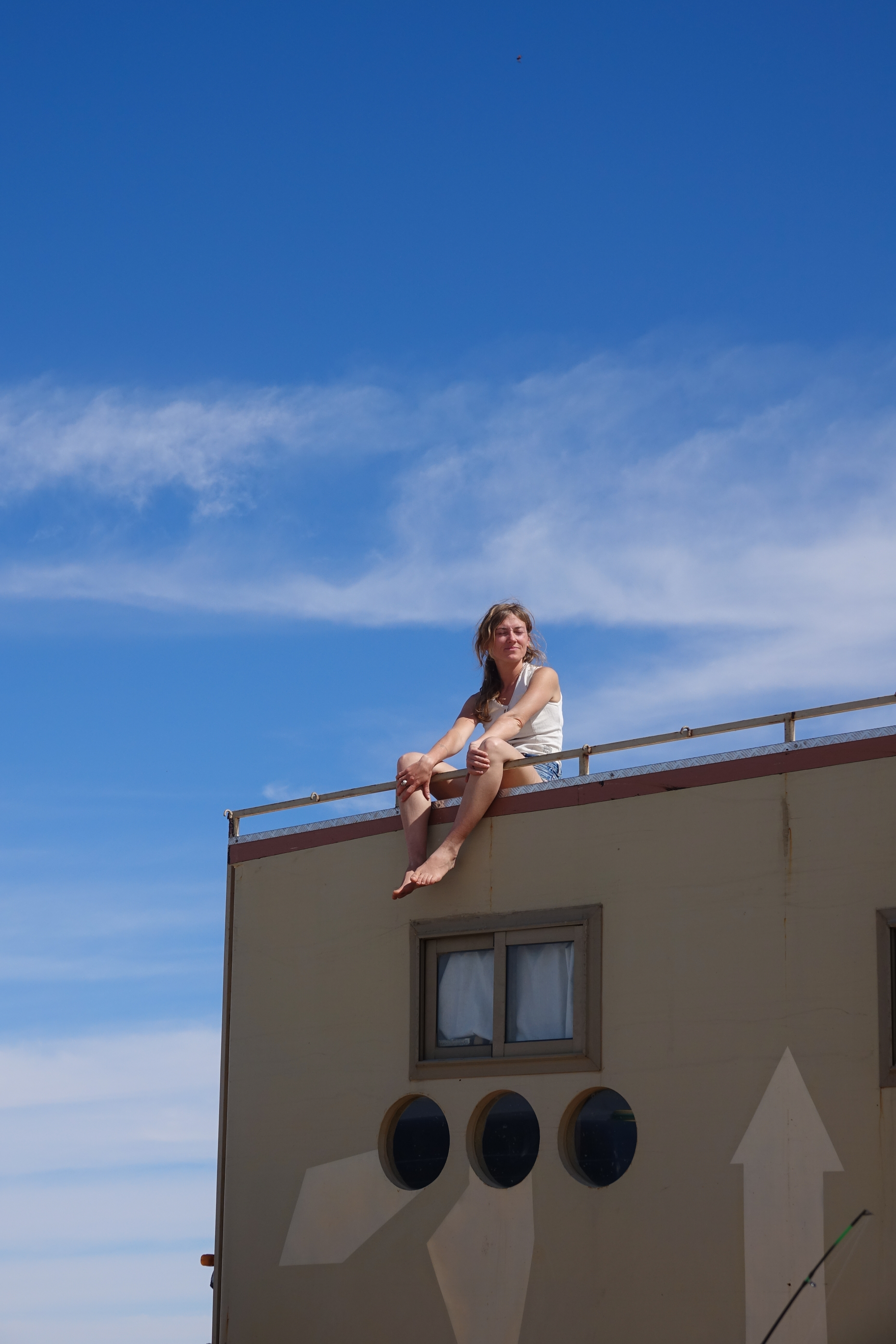 Fanny genießt den Ausblick auf ihre Crêpes von ihrem Dachgarten auf Timoumou aus.