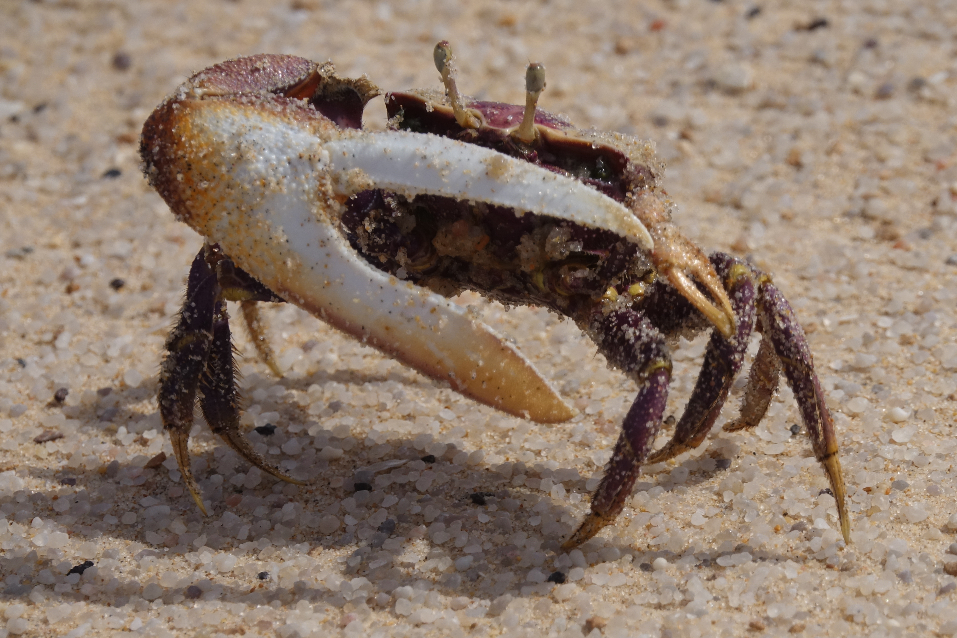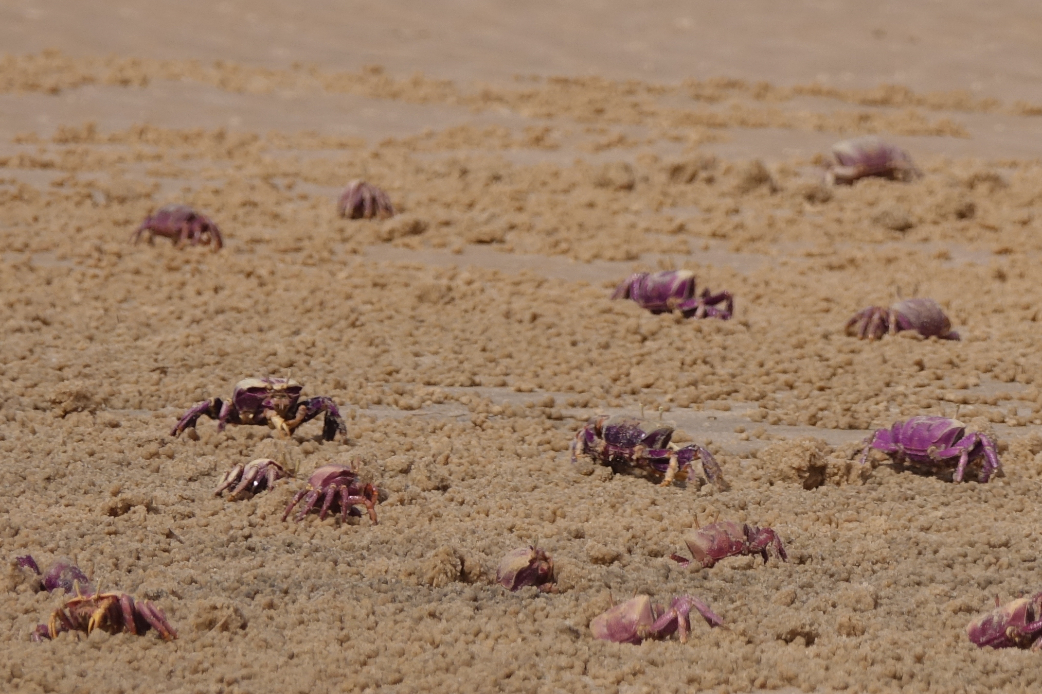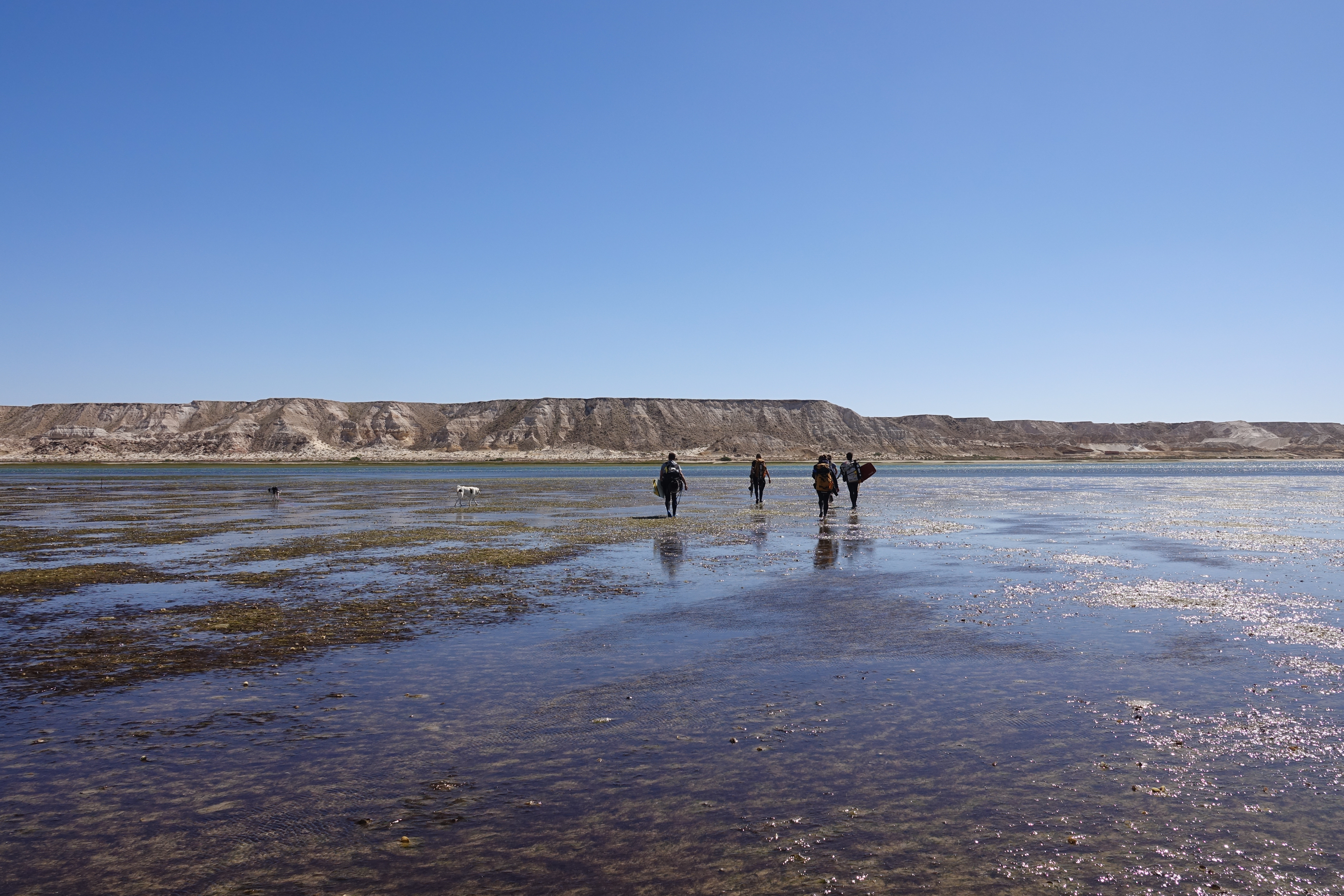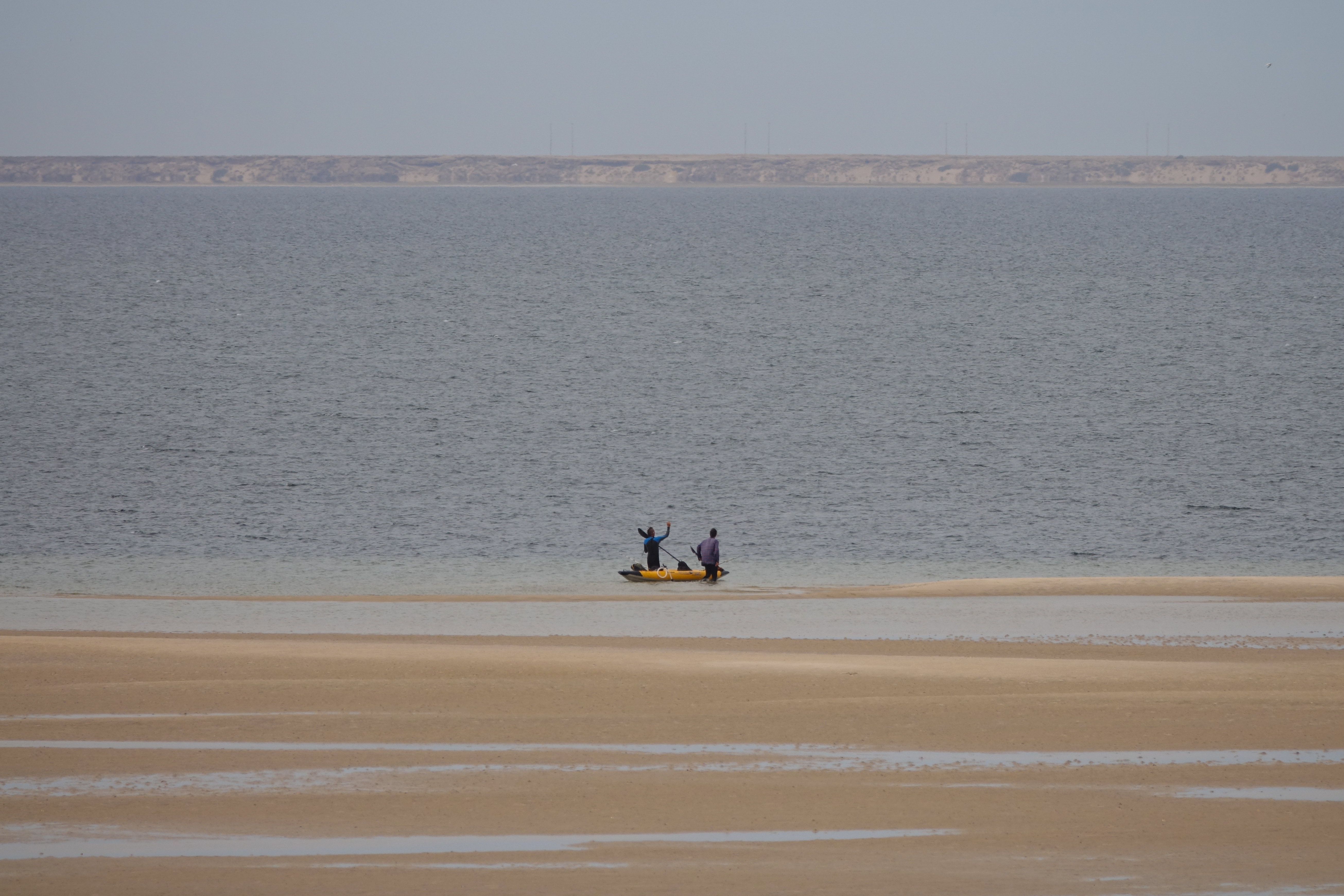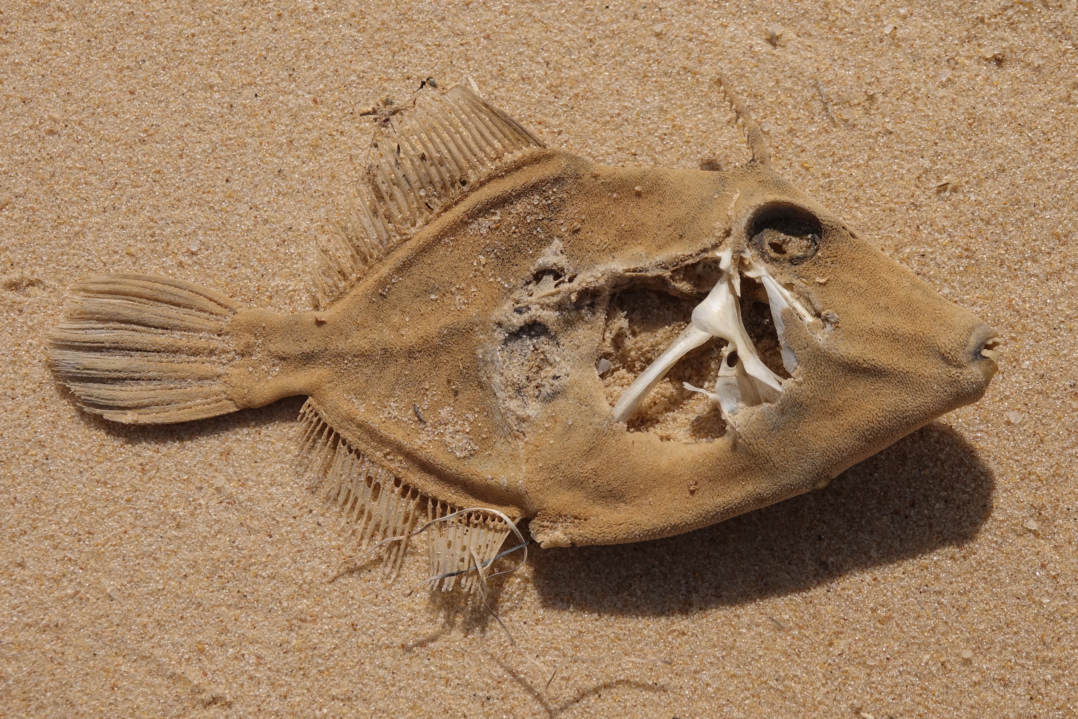 Auf dem Weg von unserem Camp zur weißen Düne entdecken wir einen vertrockneten Lippfisch, Krebse und Flamingos.