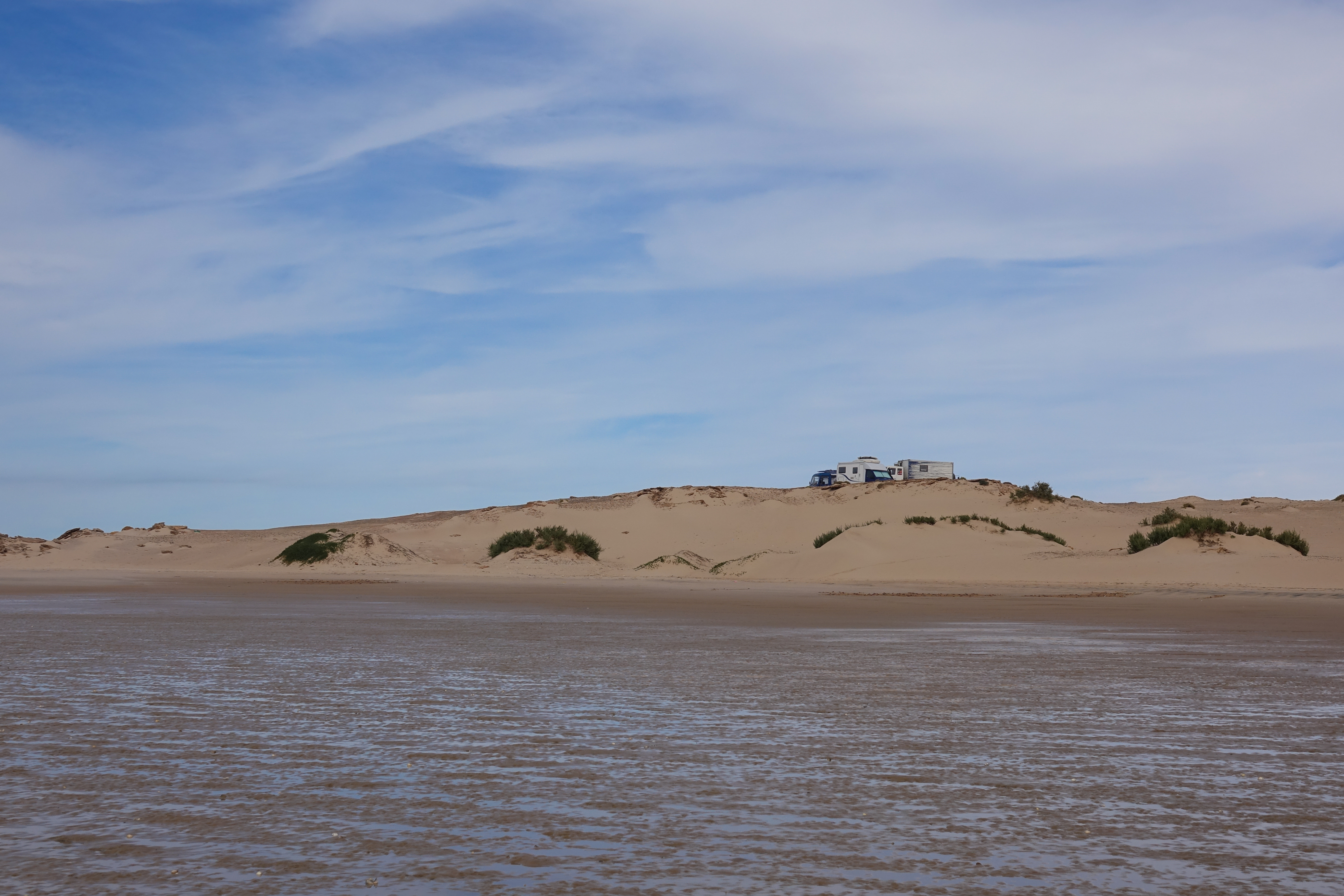 So hatten wir uns das ursprünglich vorgestellt. Einsamkeit, einige Wohnmobile und sonst nur Ruhe und Natur. Wir haben wirklich nicht damit gerechnet, dass PK 25 ein Überwintererplatz ist. Zum Glück sind wir mit dem Campfire-Team zur weißen Düne gefahren. Es ist hier so viel schöner und ruhiger.