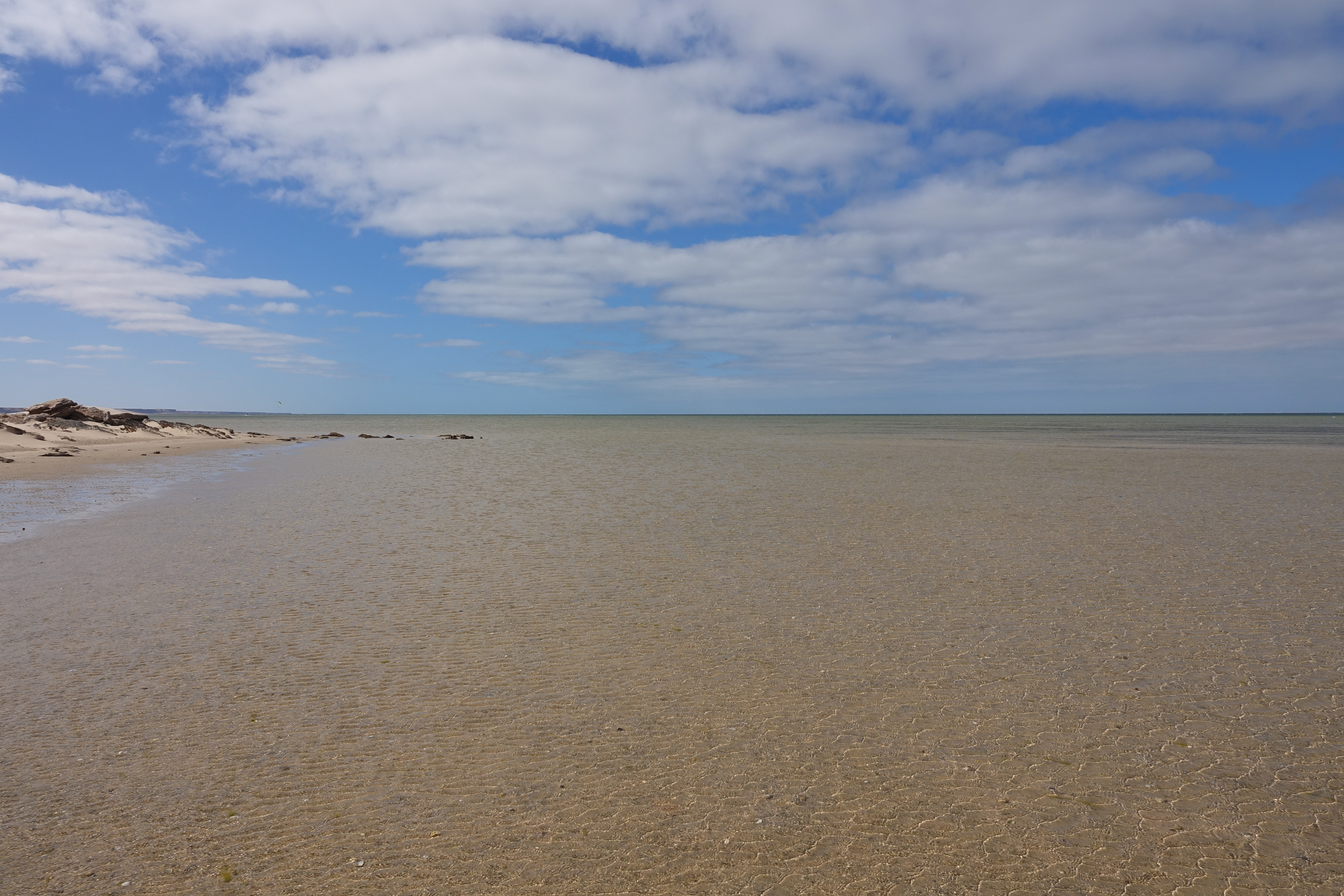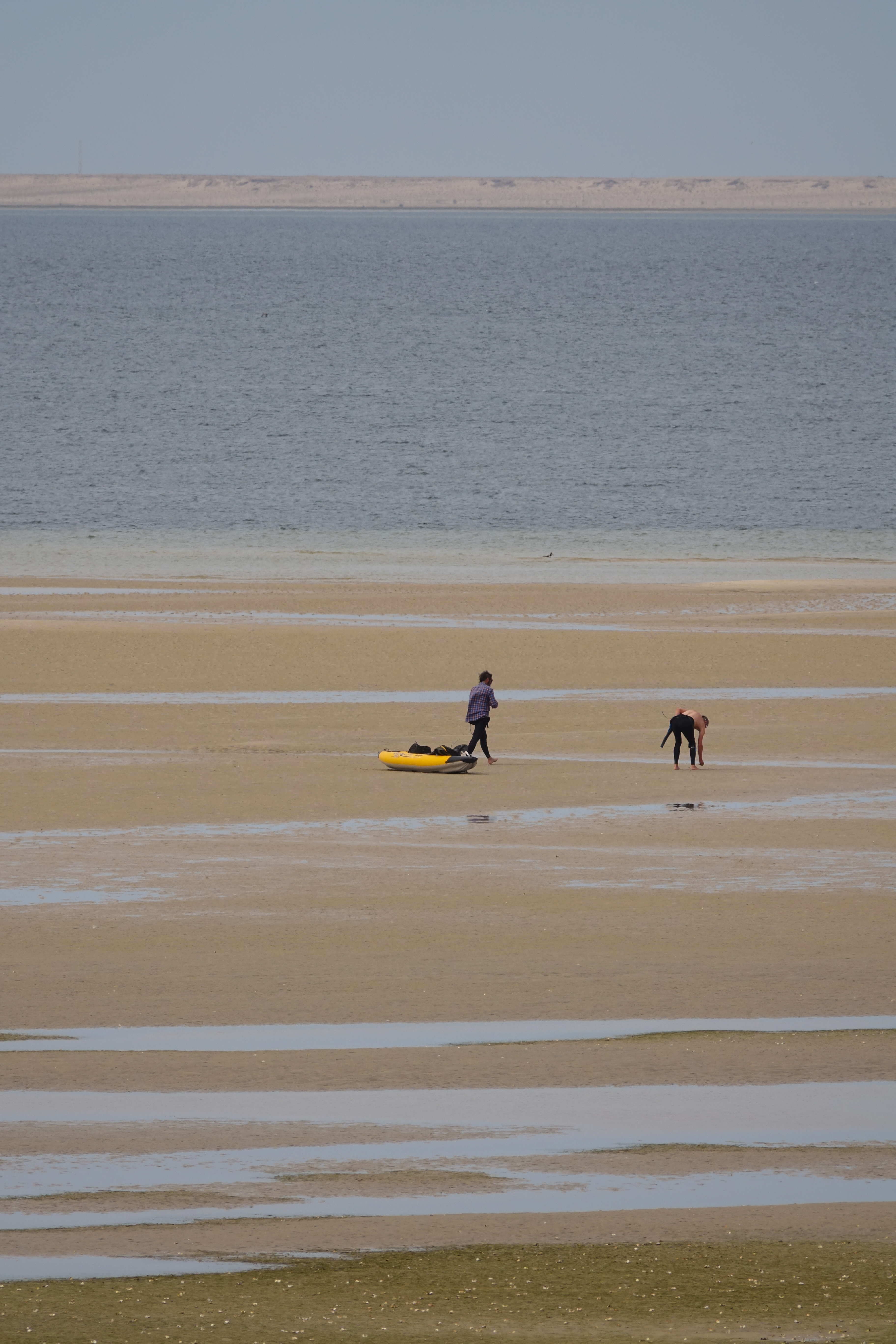 Hört sich komisch an, aber hier ist das Wasser so flach, dass man bei Ebbe ewig laufen muss, bis man am Wasser ist. Heute passt es wirklich gut zusammen. Carmen, Andy und Olivier haben noch ein bisschen Spaß, bis das Wasser wieder weg ist.