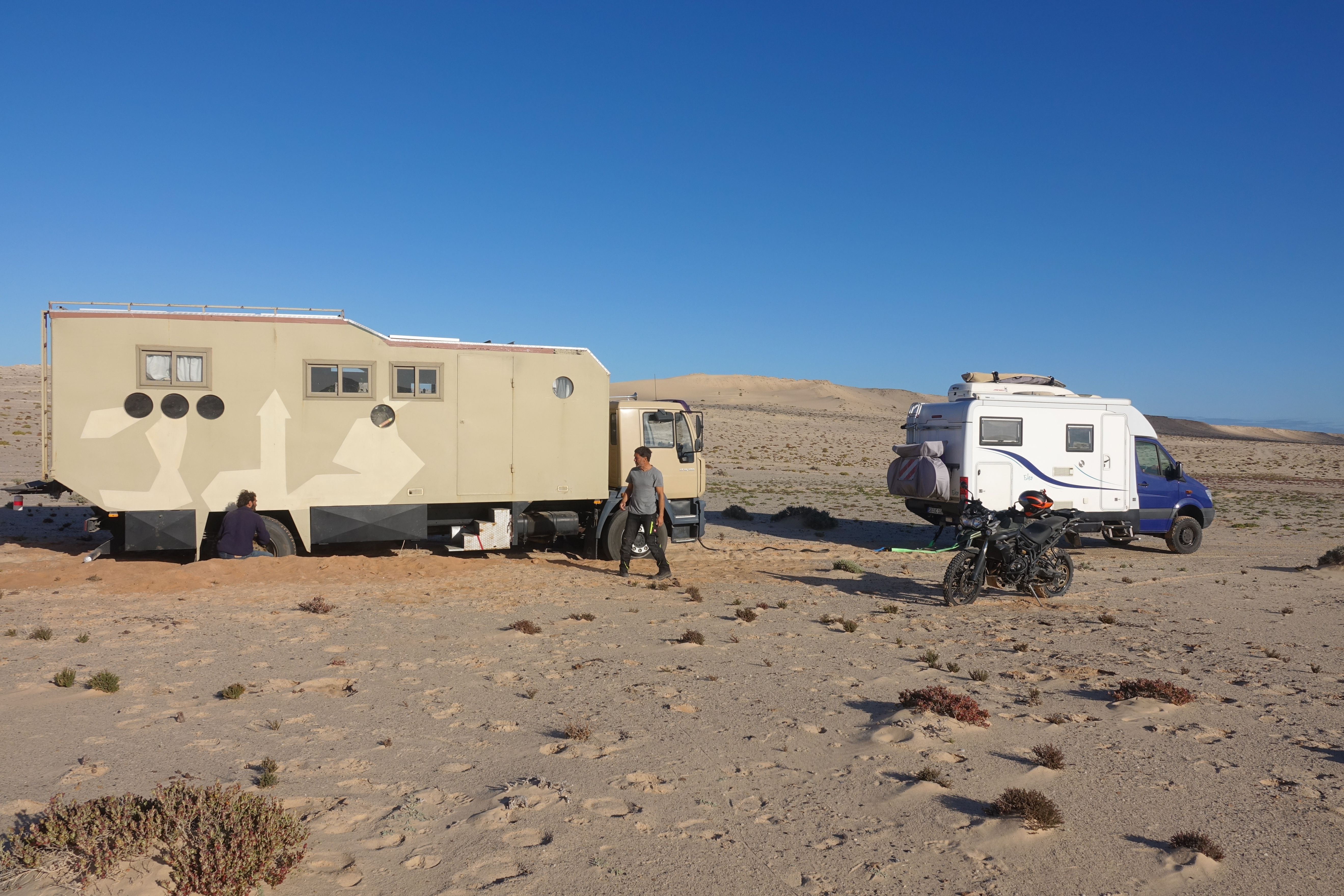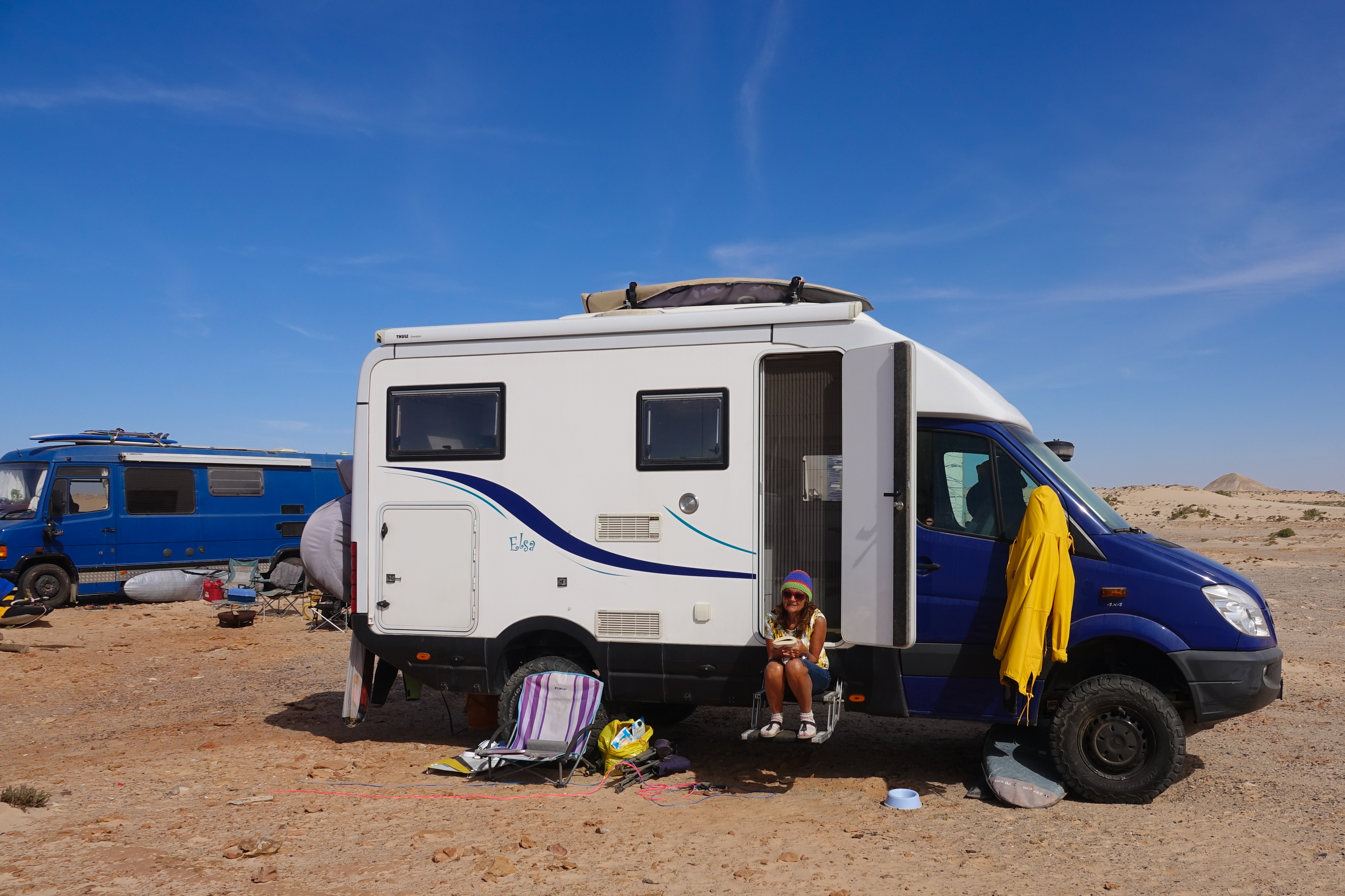 Die Versorgung und Entsorgung ist katastrophal. Viele Langzeiturlauber nehmen keinerlei Rücksicht. Wir wären hier normalerweise nicht geblieben, wenn das Surfrevier nicht so großartig wäre. Das Grauwasser wird hier einfach ins Gebüsch gekippt, die Toilette in eine Sickergrube geleert, die manchmal furchtbar stinkt. Fast alle entnehmen ihr Brauchwasser aus einem Tiefbohrbrunnen, der entsetzlich nach Schwefelwasserstoff riecht. Wir haben für uns die Konsequenz gezogen, das Trinkwasser in 5 Liter Flaschen zu kaufen und sparsam mit dem Wasser umzugehen. So schaffen wir es, pro Tag noch nicht einmal 10 Liter zu verbrauchen. Viele unserer Nachbarn verbrauchen am Tag soviel Wasser, wie wir in der Woche. So kann man in der Wüste nicht mit Wasser umgehen. Manche waschen hier sogar ihr Wohnmobil und täglich ihre Wäsche. Unsere Elsa haben wir in einer Lavage in Dakhla säubern lassen und die Wäsche in einer Wäscherei abgeben. Das halten wir für ökologisch verträglicher und zudem unterstützt es die lokalen Geschäfte. Wir haben leider das Gefühl, dass viele Leute nur hier sind, weil es so billig ist. Der Stellplatz ist kostenlos, der Sprit ist subventioniert und kostet fast nichts und man schafft es hier einen Monat zu verbringen und mit 2 Personen nur 300 € auszugeben. Das Einzige, was wirklich teuer ist, ist Alkohol, aber der ist in unseren 300 € schon enthalten. Zum Glück haben wir uns dann einen Stellplatz auf eigene Faust gesucht und hier hat es uns super gefallen. Hoffentlich stellt den niemand auf Park4nihgt. Der Platz an der weißen Düne ist wirklich ein Paradies. Wir haben am Anfang ein bisschen Müll eingesammelt und den bei unserer Einkaufstour entsorgt und dann konnte man sich wie im Paradies fühlen. So einen wunderbaren Ort in absoluter Einsamkeit findet man anderswo sicher nicht so einfach. Leider hat Uwe einen Einheimischen getroffen, der ihm Baupläne für Ferienhäuser gezeigt hat. Angeblich soll es noch dieses Jahr losgehen.