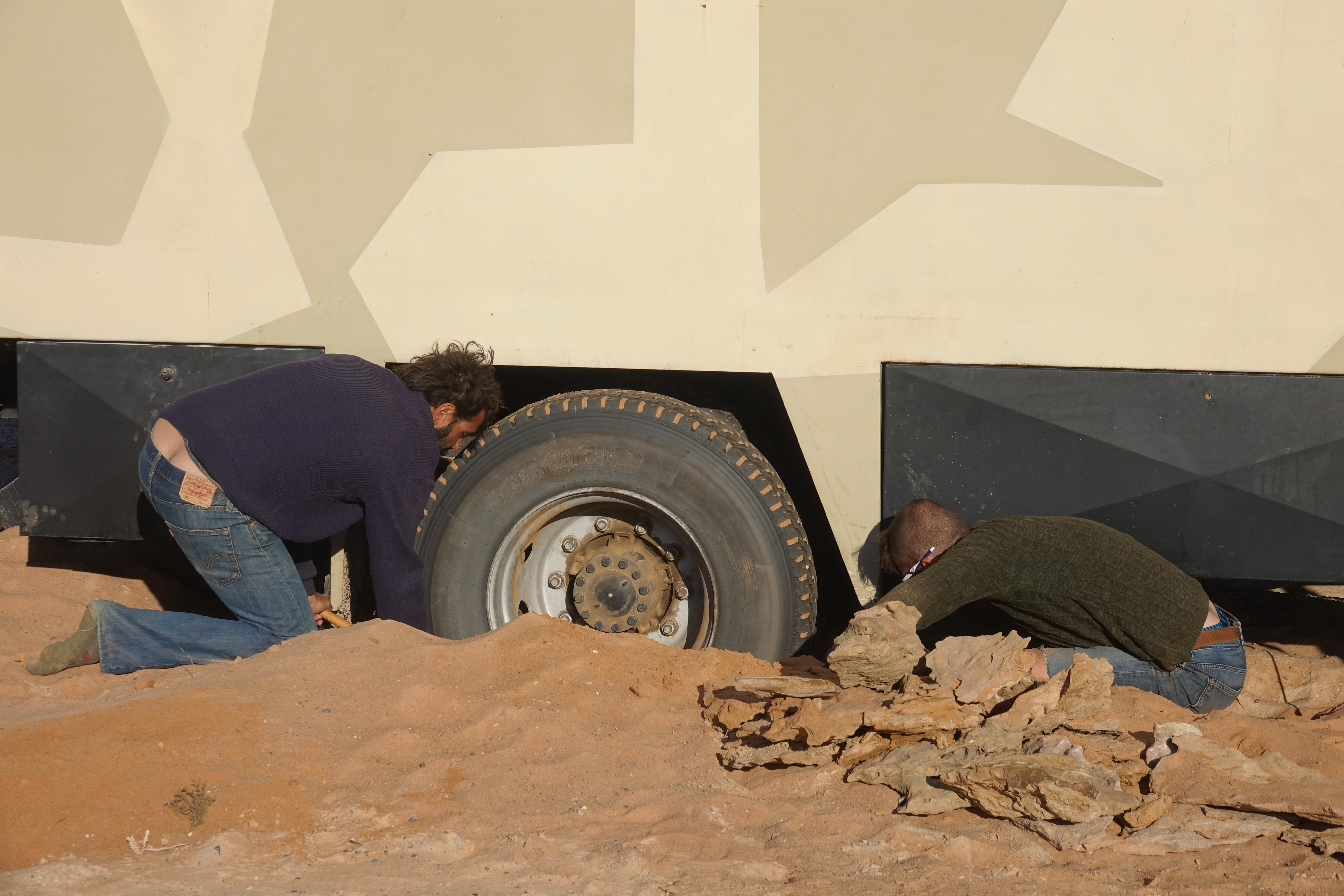 Währenddessen wollen Fanny und Olivier noch in PK 25 Wassertanken und verirren sich dabei in der Wüste und fahren sich im Sand fest. Andy und Uwe kommen erst bei Sonnenuntergang zurück. Für eine Rettungsaktion definitiv schon zu dunkel. Also müssen wir diese Nacht getrennt verbringen. Elsa und Bernhard sind noch zusammen. Timoumou steht ganz alleine in der Wüste. Morgen bei Tageslicht werden wir sie dann suchen, verhungern und verdursten können sie bis dahin nicht.