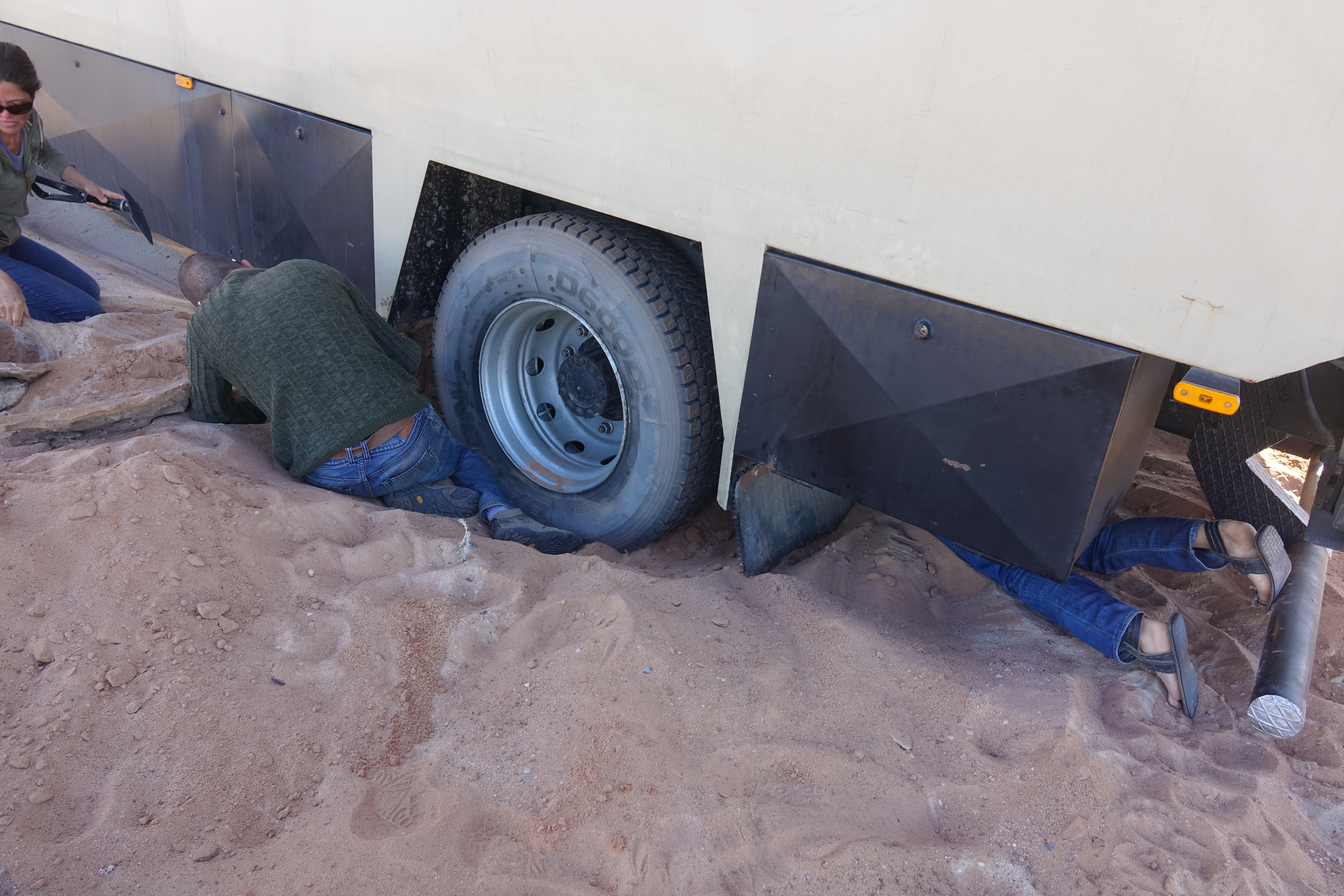 Auch Fanny verschwindet zum Graben unter dem großen LKW. Sie ist klein und zierlich und passt überall dazwischen.