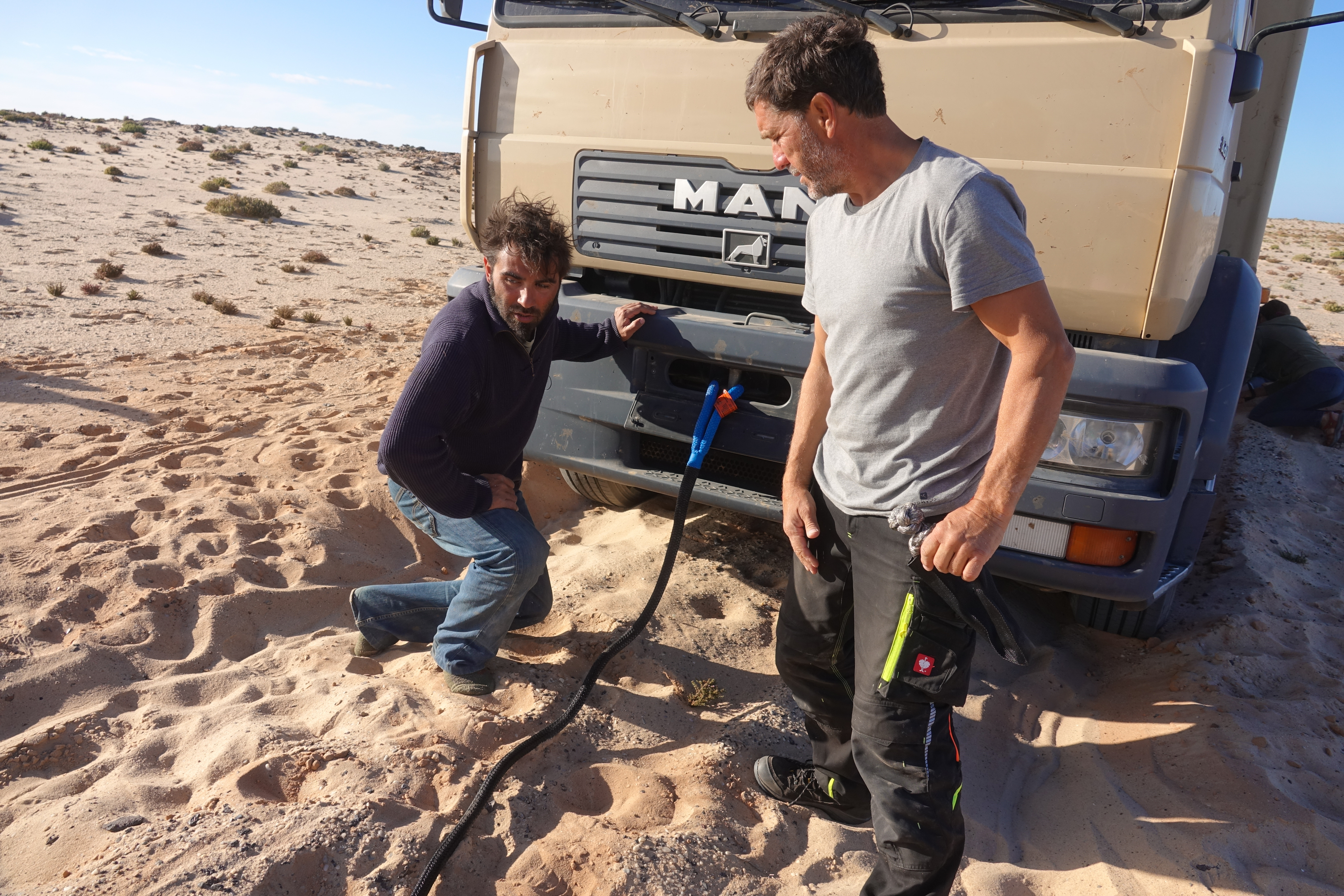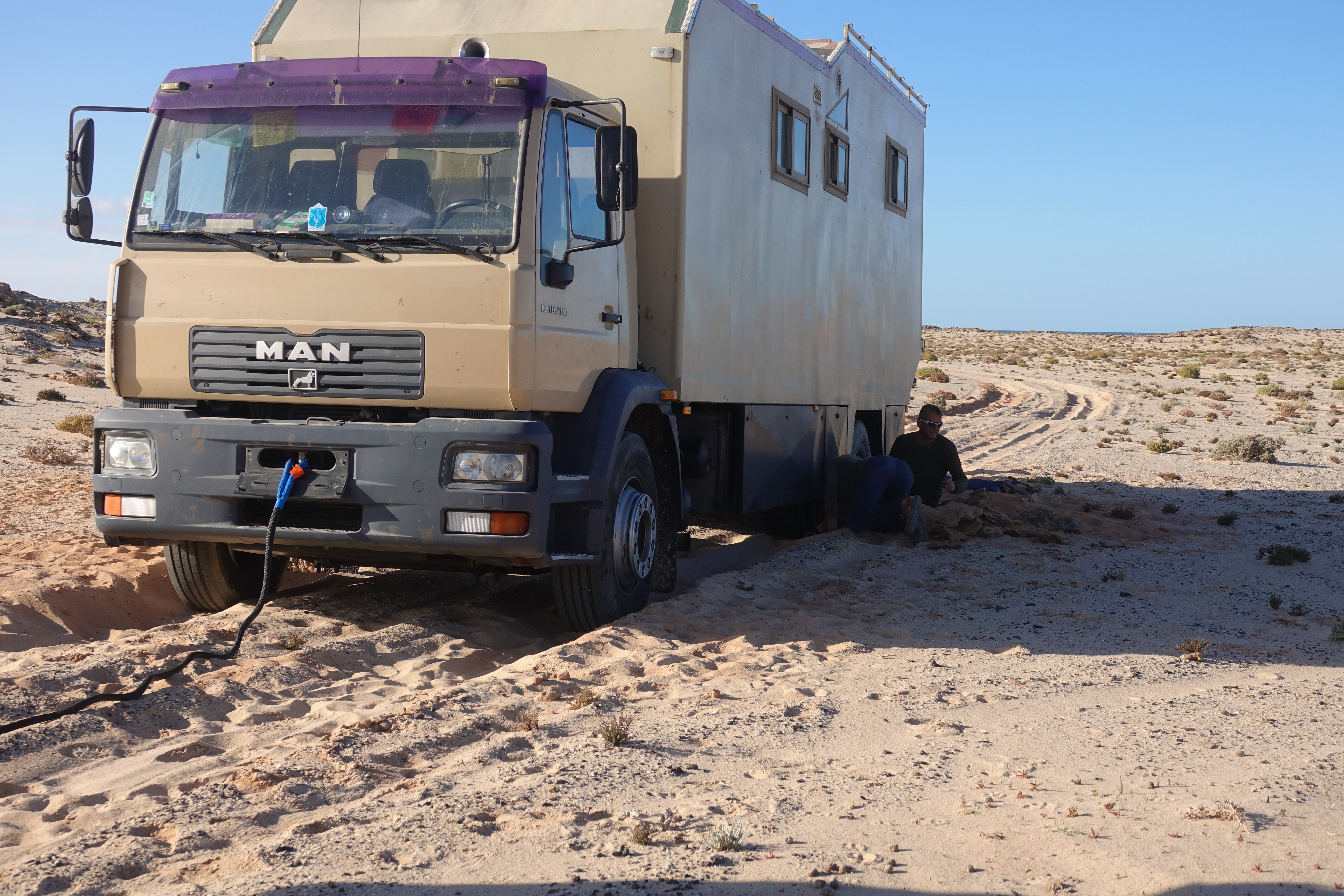 Heute ist der letzte Tag von Andrea und Raimund. Sie wollen mit ihrem Steyr Big 20 nach Mauretanien fahren. Wir wollen noch den vorhergesagten Wind mitnehmen und dann auch nach Sidi Kaouki aufbrechen, um uns dort mit Lisa und Familie zu treffen. Wind ist in der Tat heute mehr als genug. Fast sieben Beaufort, da bläst es einem den Sand durch alle Ritzen.