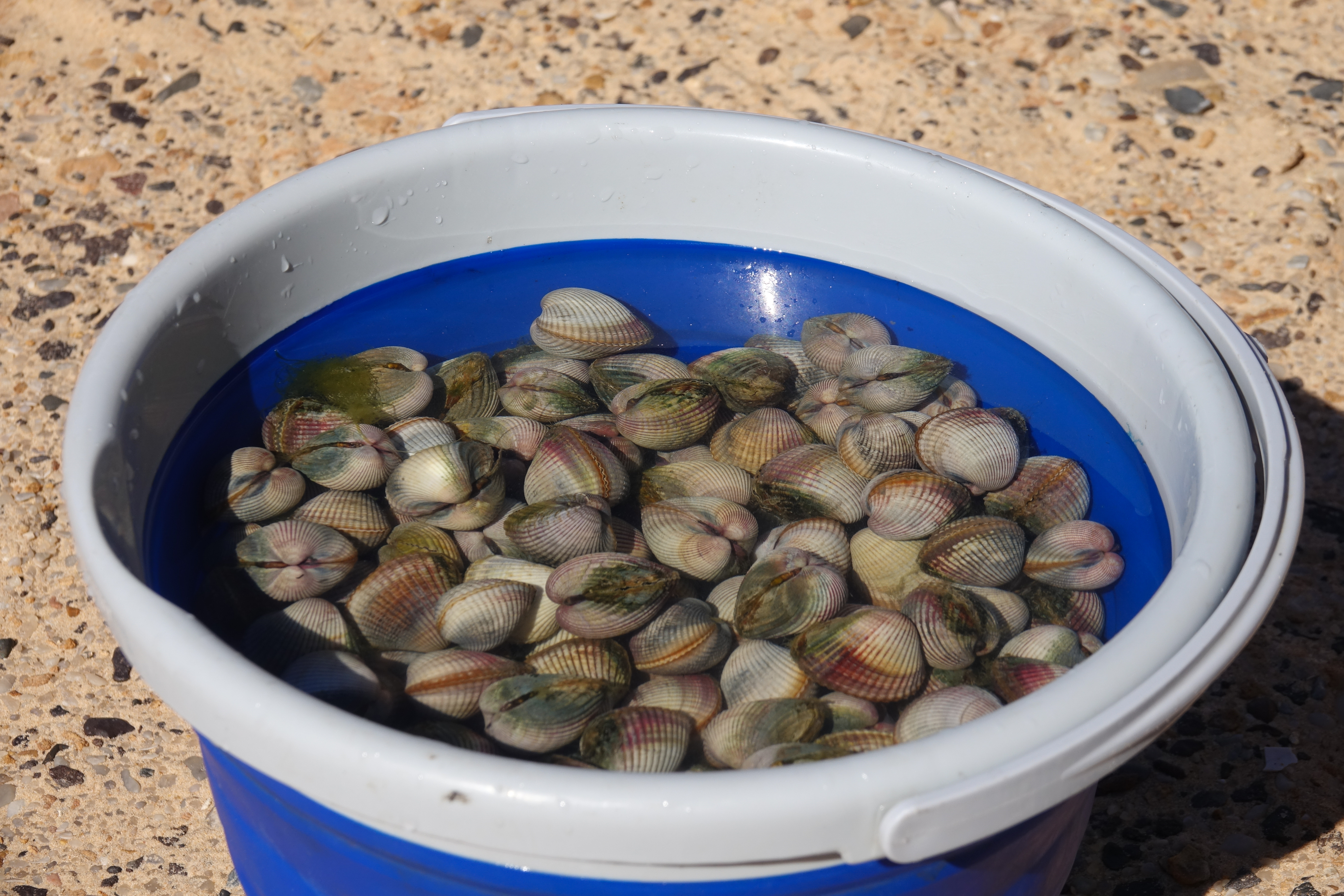 Unter Anleitung von Fanny sammeln wir einen Eimer voll Coque (Herzmuscheln).