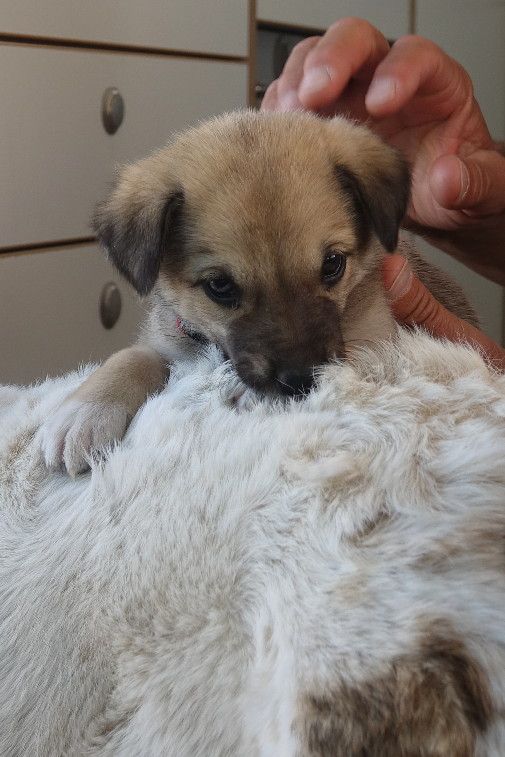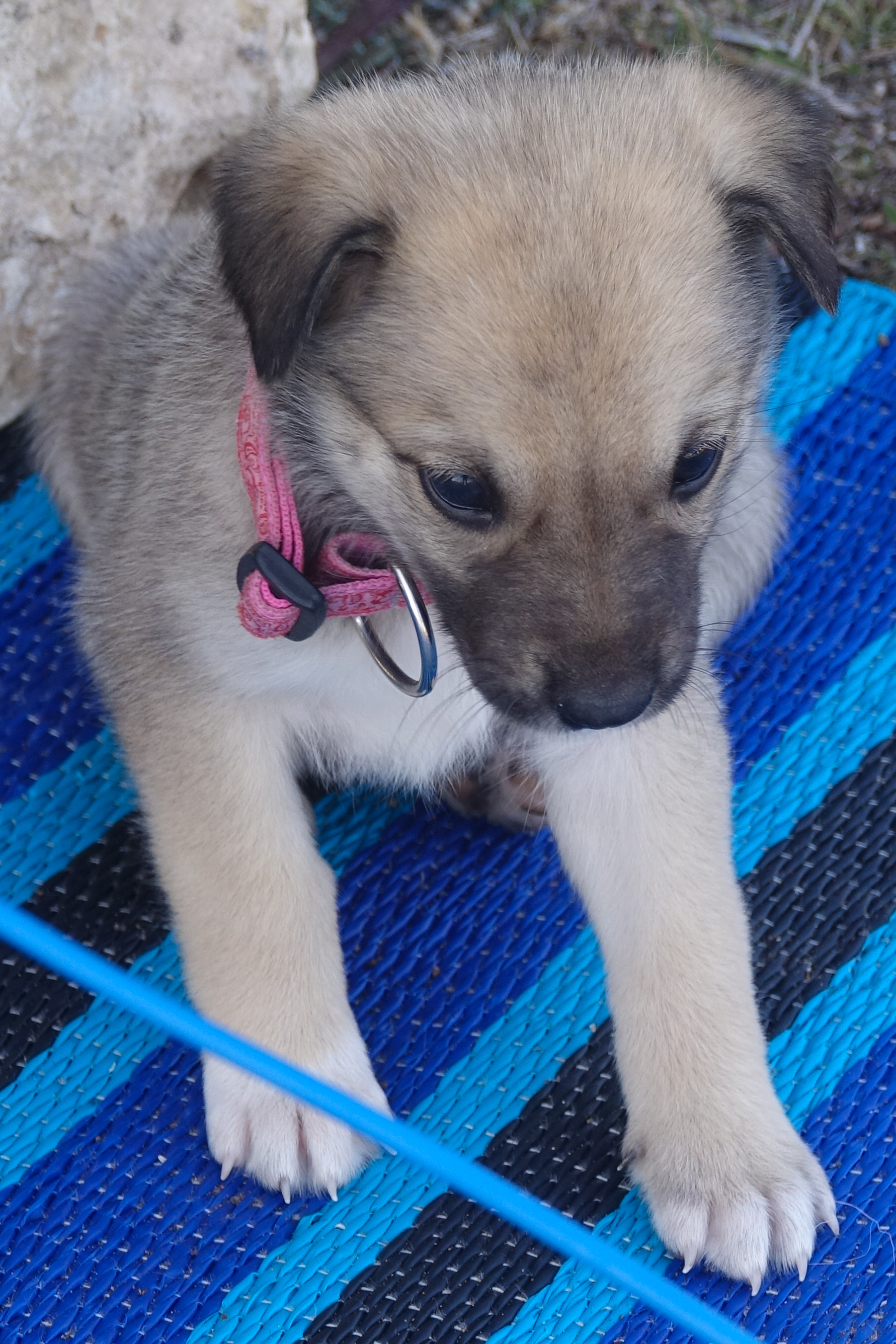 Sanna und Mina wachen allerdings eifersüchtig über ihr Terrain und deshalb musste Aicha ein eigenes Bettchen in einer Klappkiste bekommen. Ein eigenes Halsband hat sie auch schon, weil wir immer Reserven dabei haben.