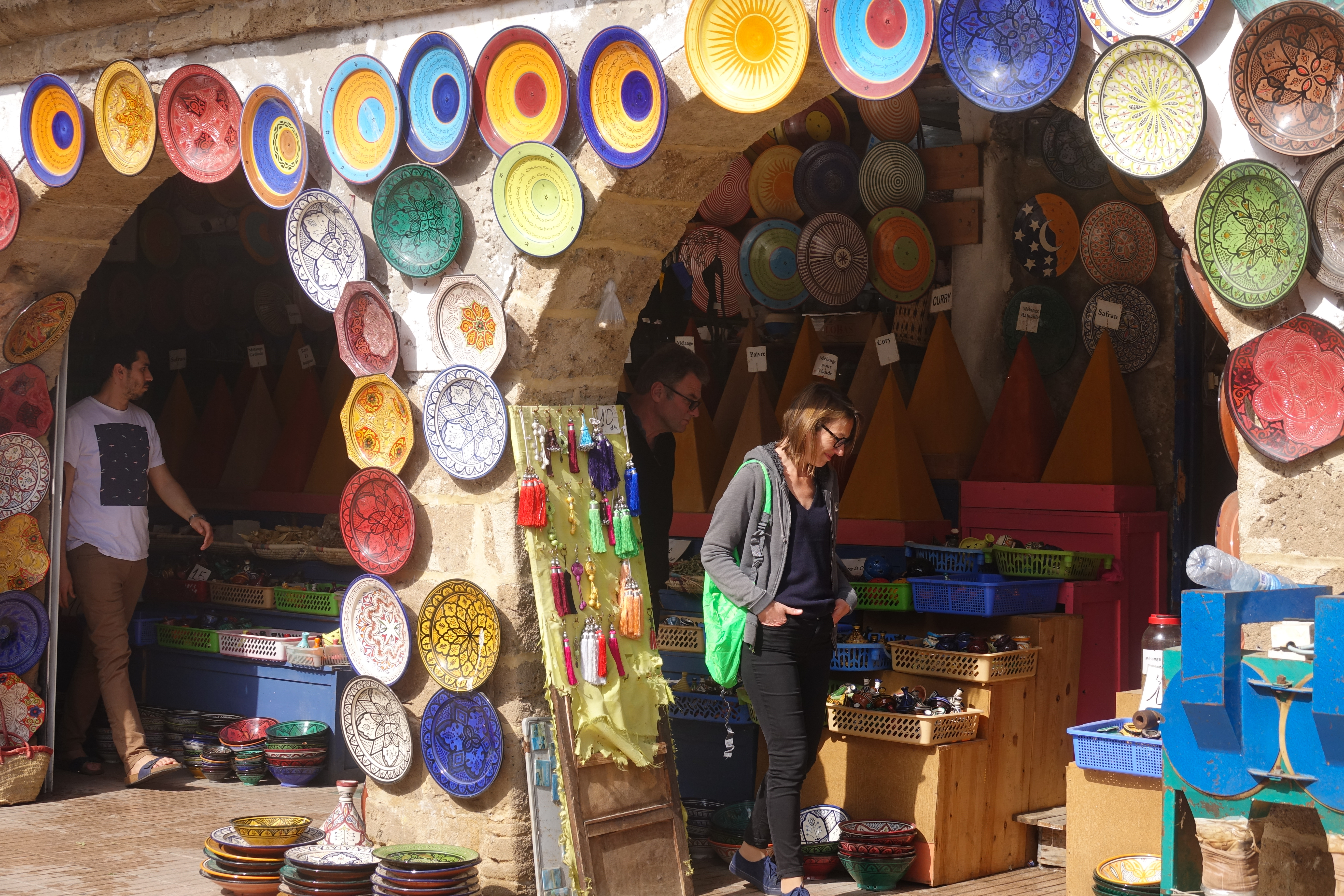 Klar gibt es hier alles zu kaufen, was das Touristenherz begehrt, aber die Händler sind zu unserer großen Überraschung mittlerweile nicht mehr aufdringlich. Uns gefällt Vieles, was wir sehen. Es gibt schöne Keramikschalen, Tücher, Handtaschen und Silberschmuck, aber verglichen mit den andern Soukhs im Land, werden hier wirklich Sachen angeboten, die dem europäischen Geschmack entsprechen.