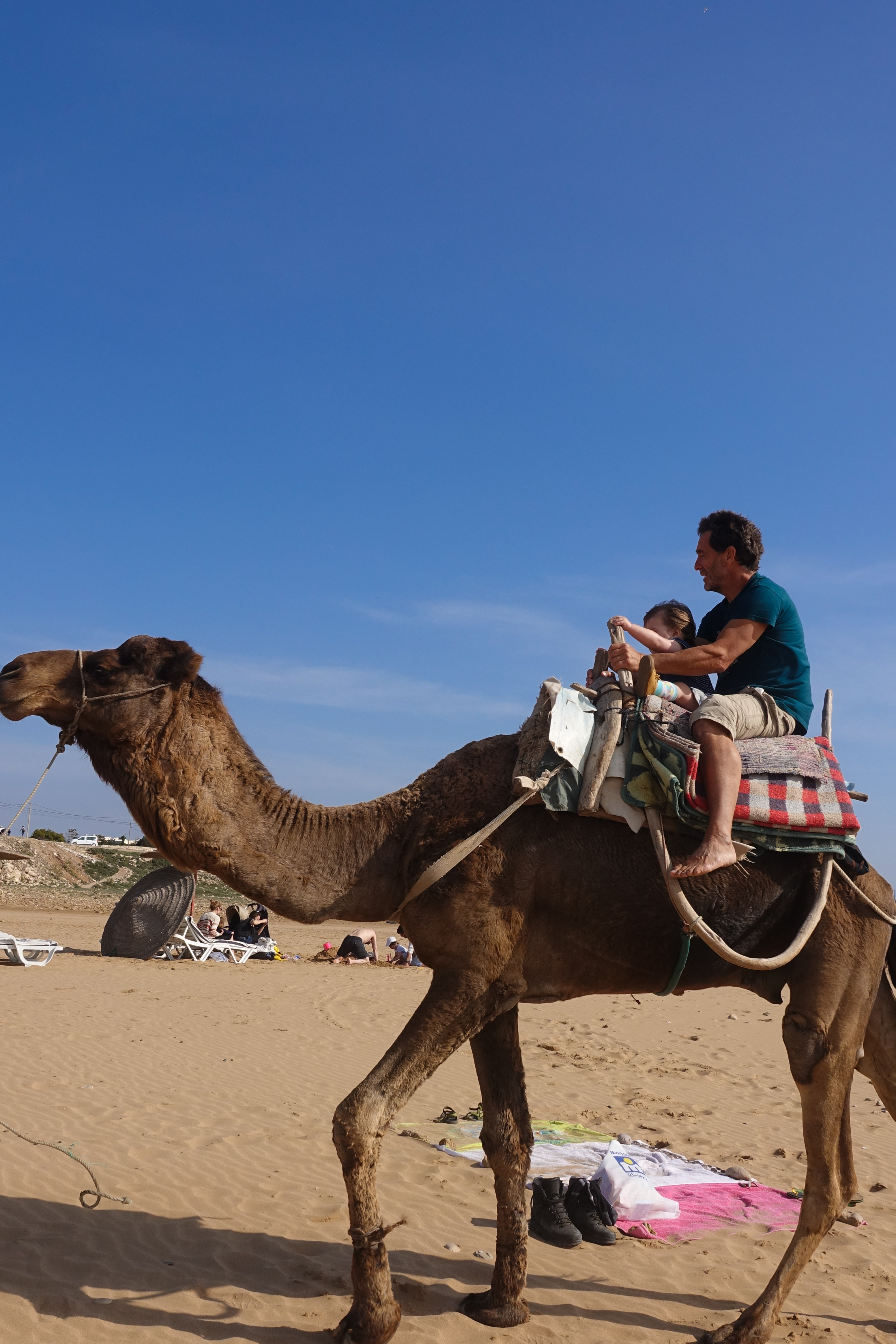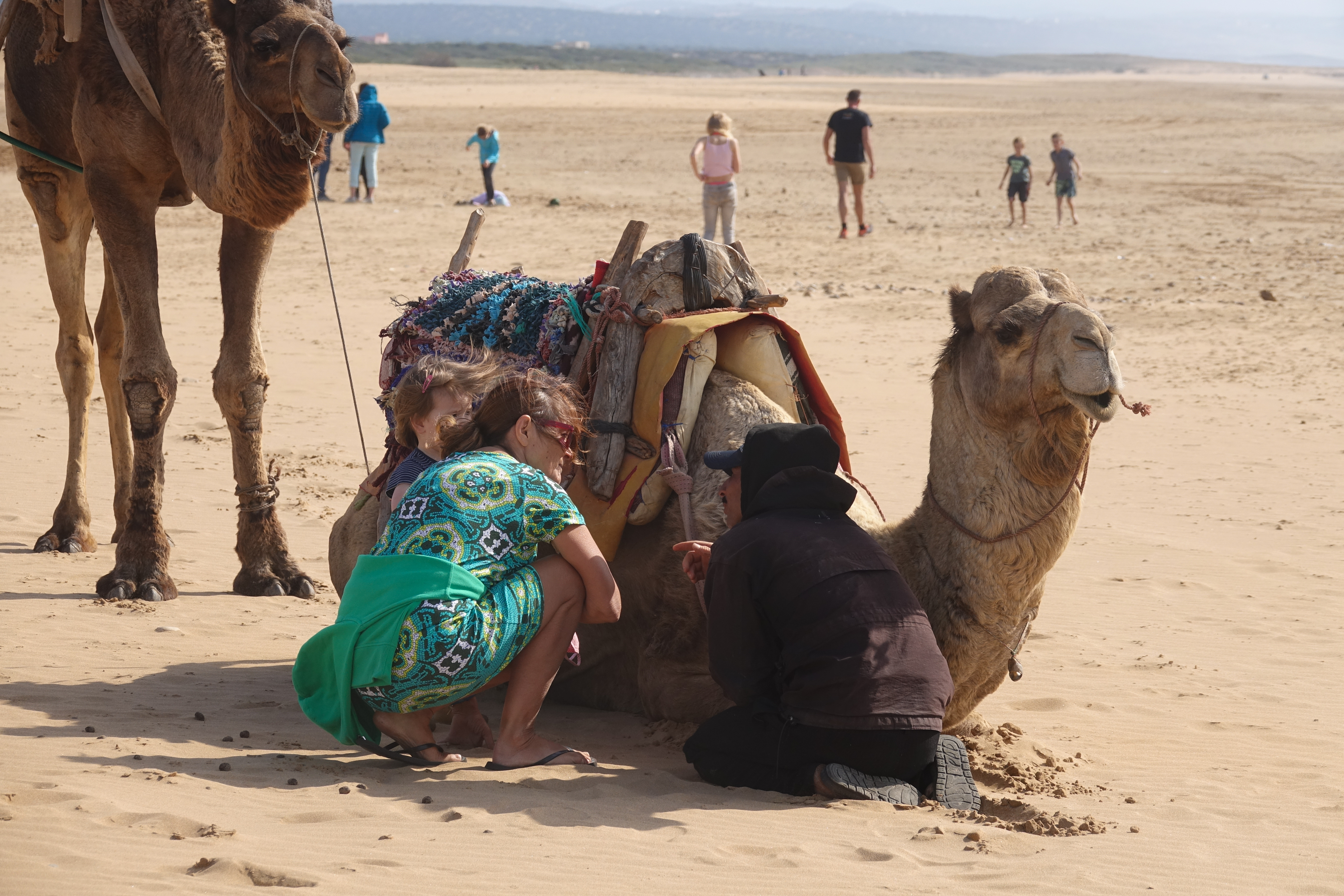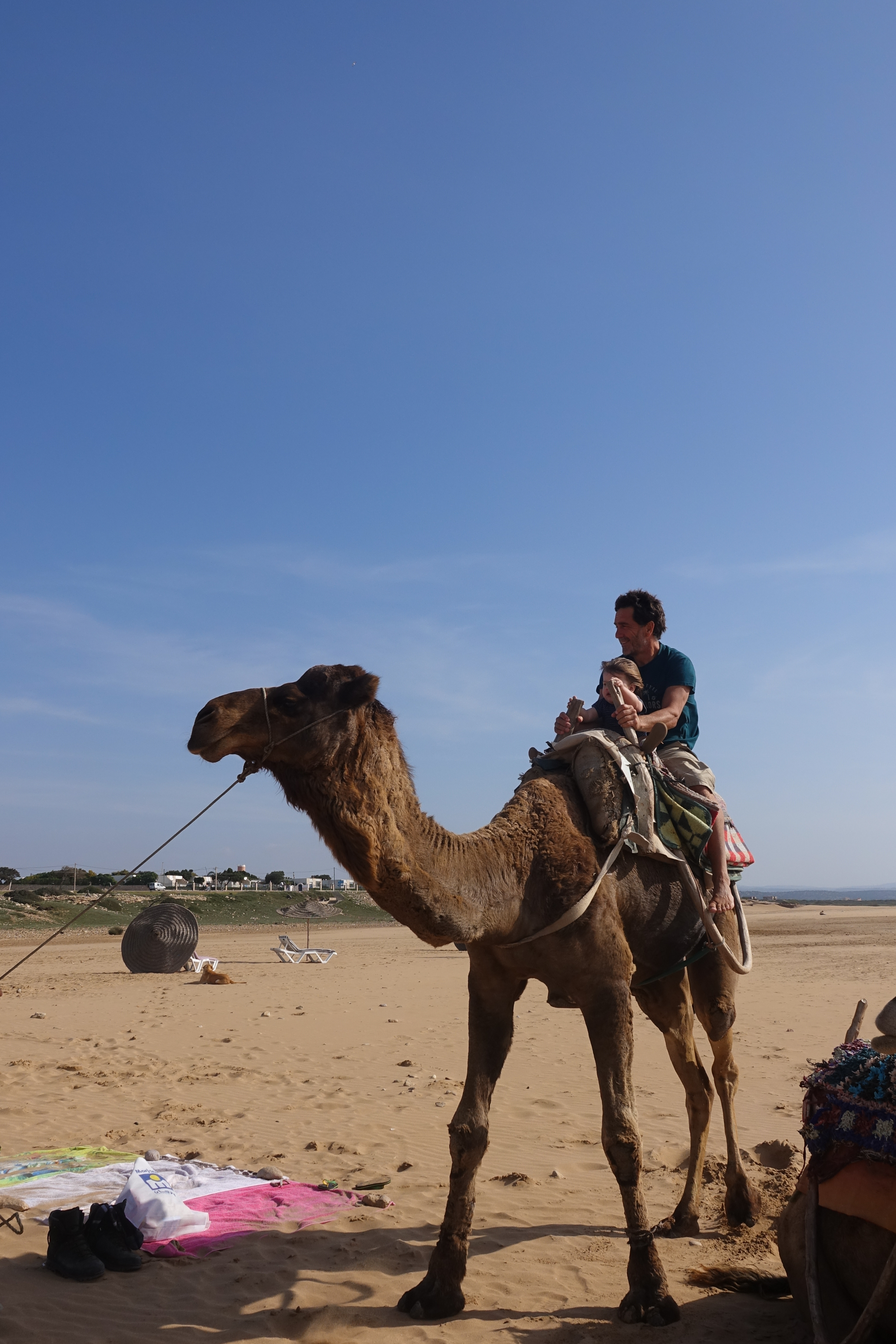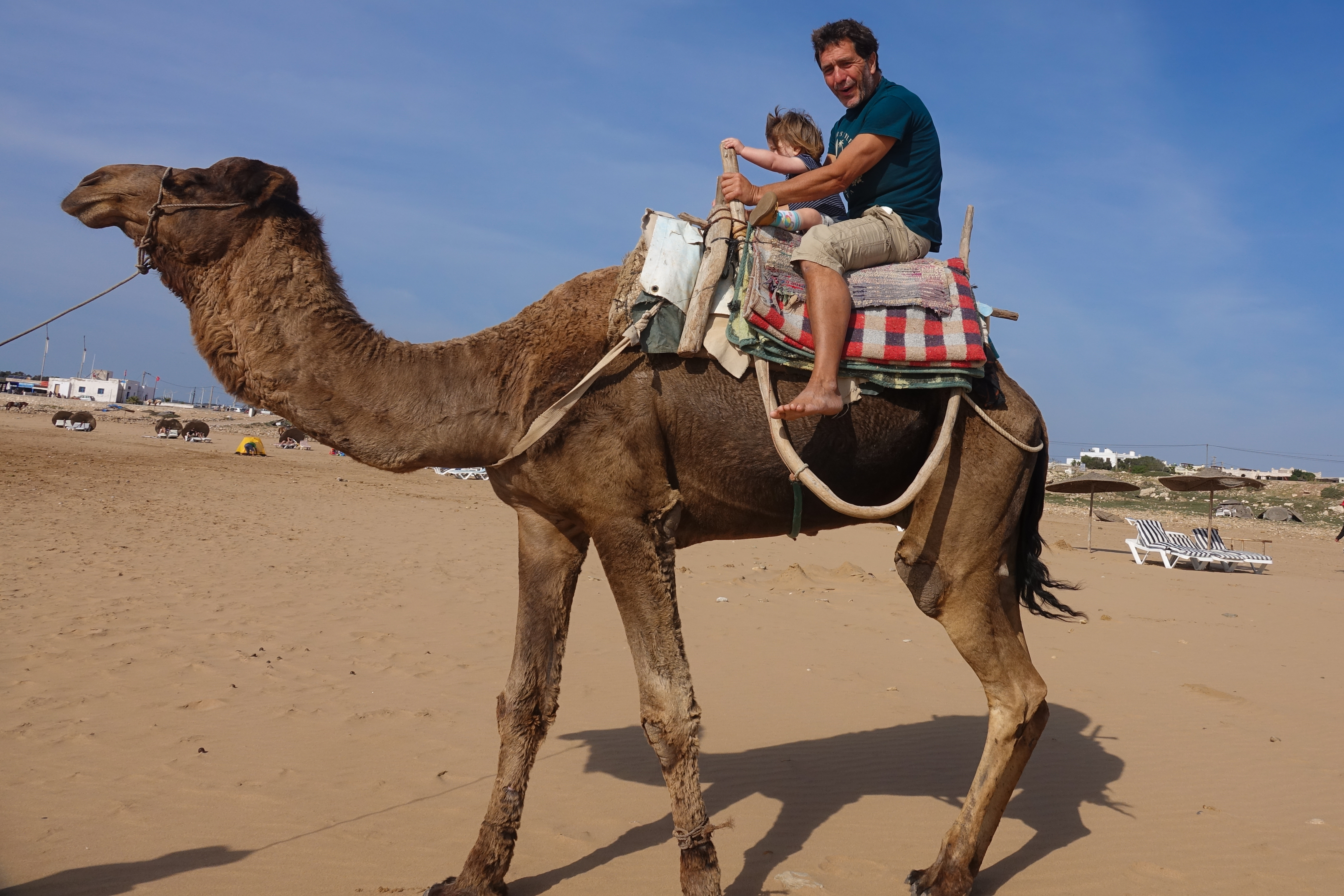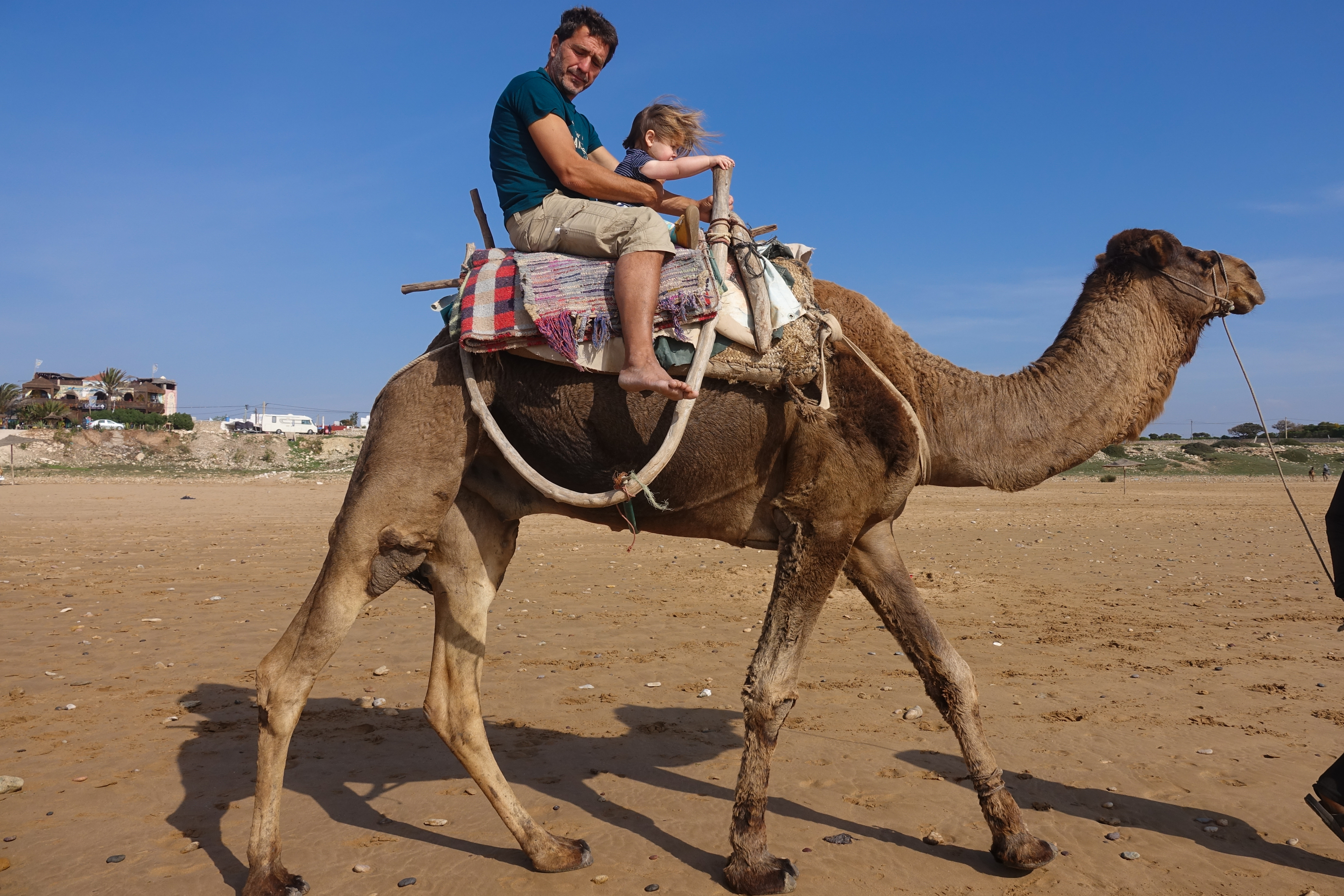 Nach dem Frühstück geht erst erst einmal mit Mali und Jan zu einem Strandspaziergang in Sidi Kaouki. Vor allem die Dromedare haben es unserem Enkelkind angetan.