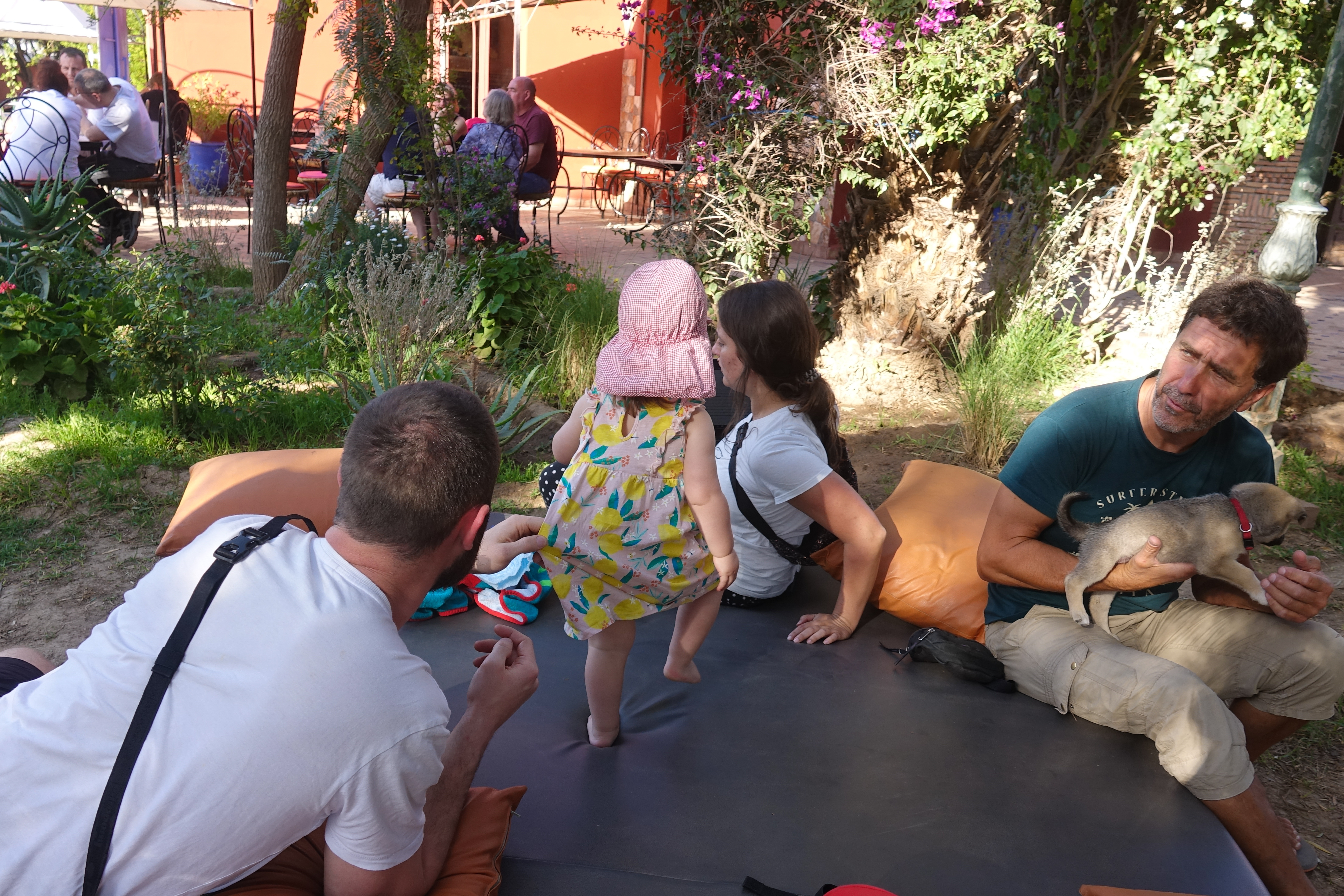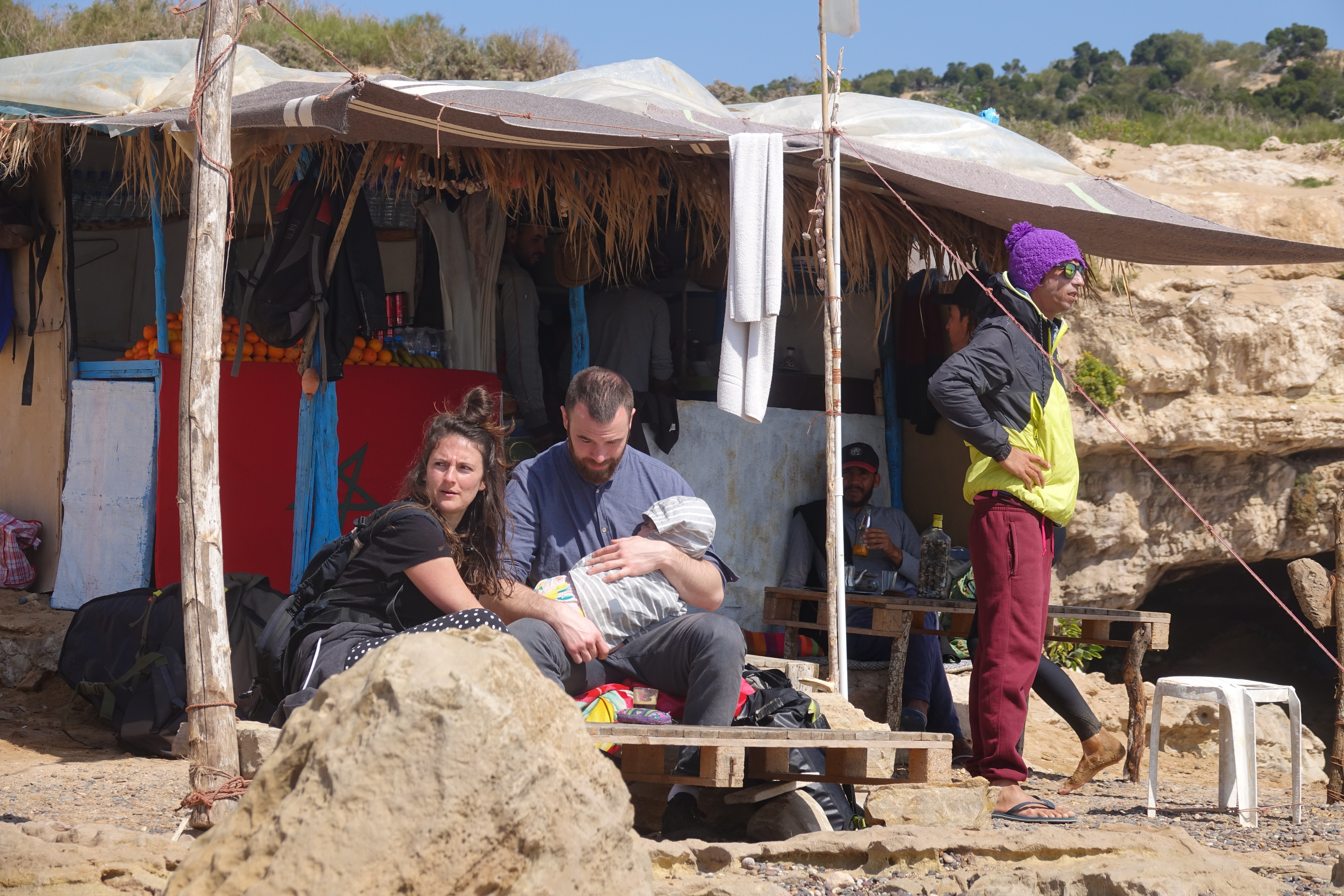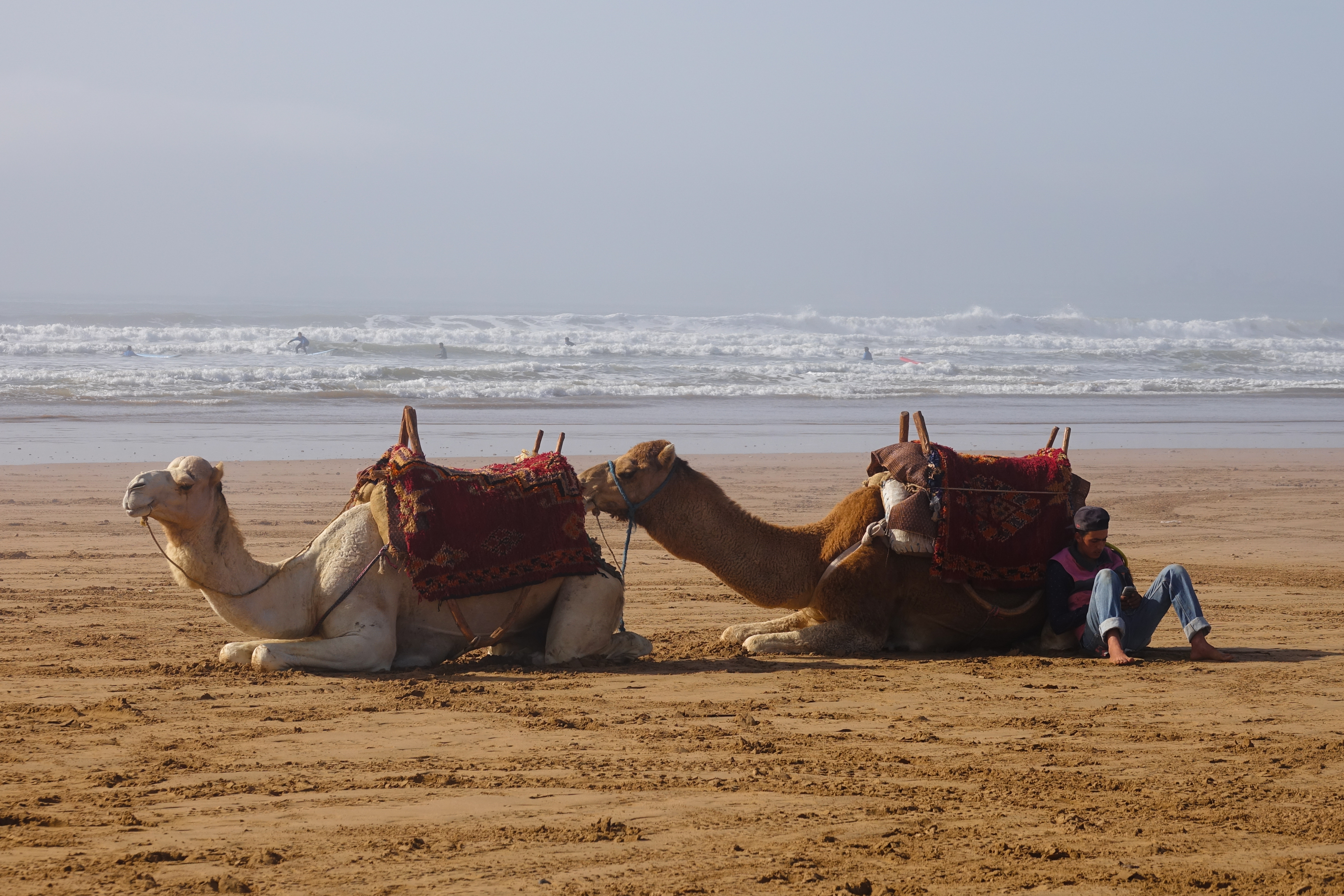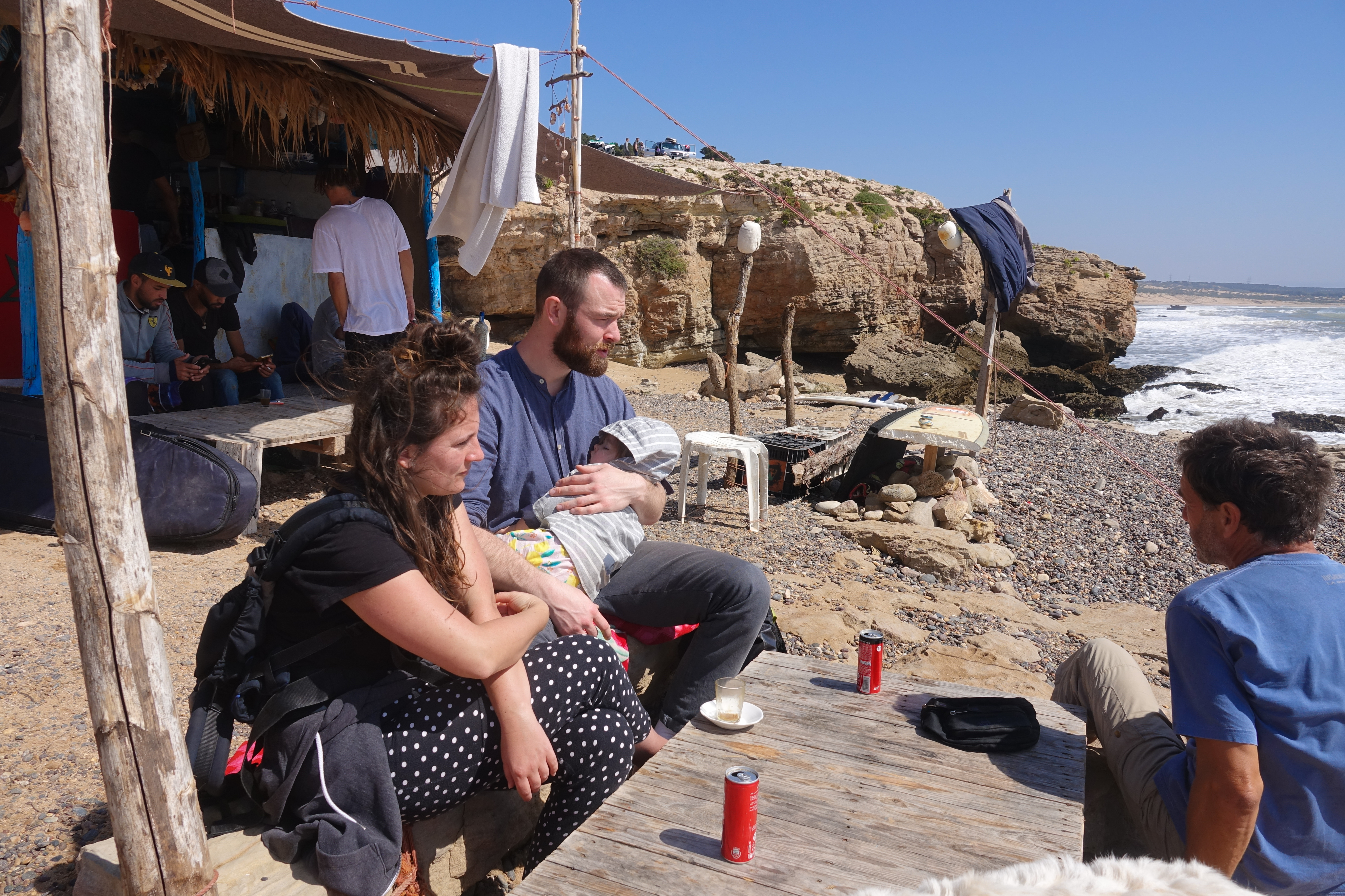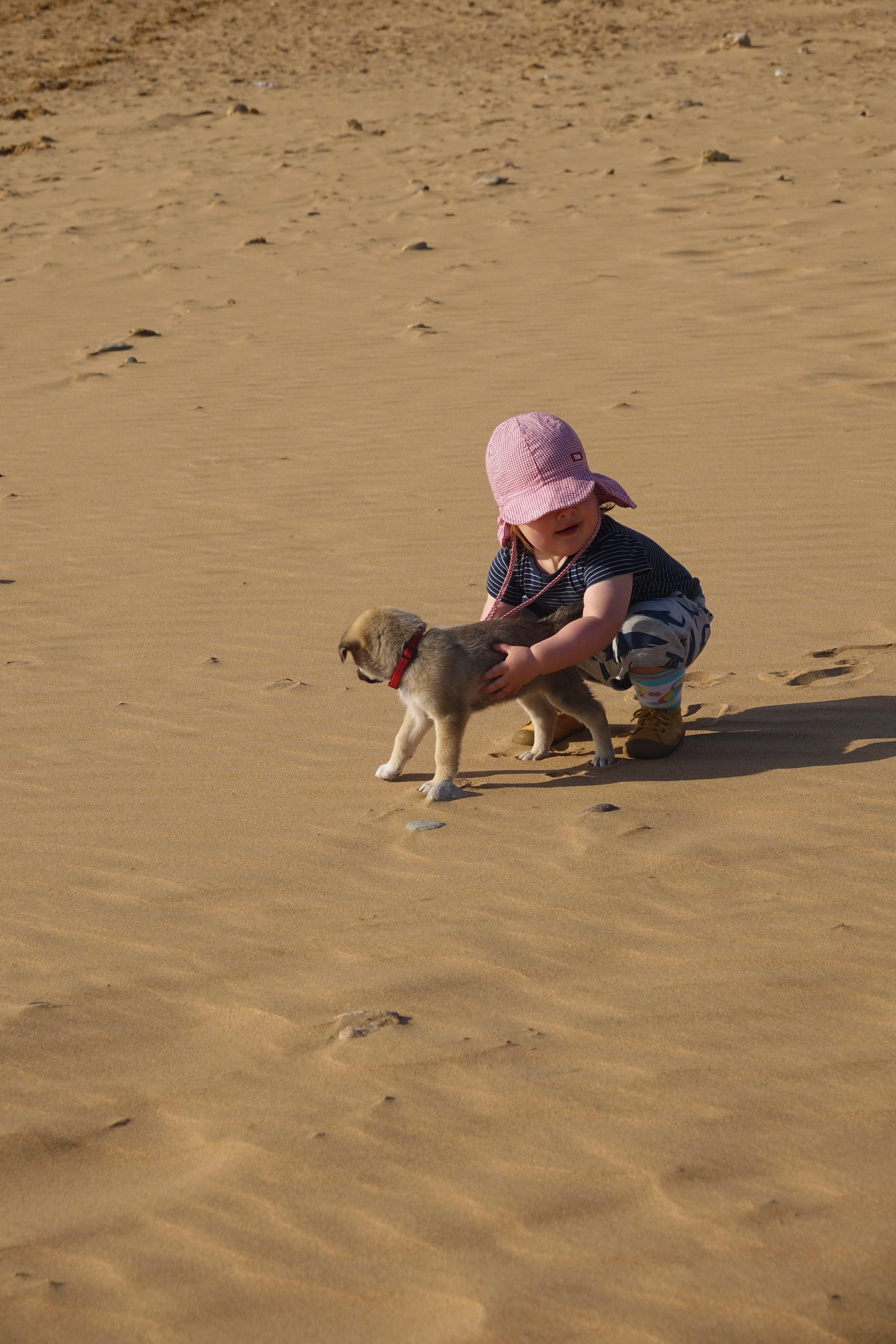 Nach dem Frühstück geht erst erst einmal mit Mali und Jan zu einem Strandspaziergang in Sidi Kaouki. Vor allem die Dromedare haben es unserem Enkelkind angetan.