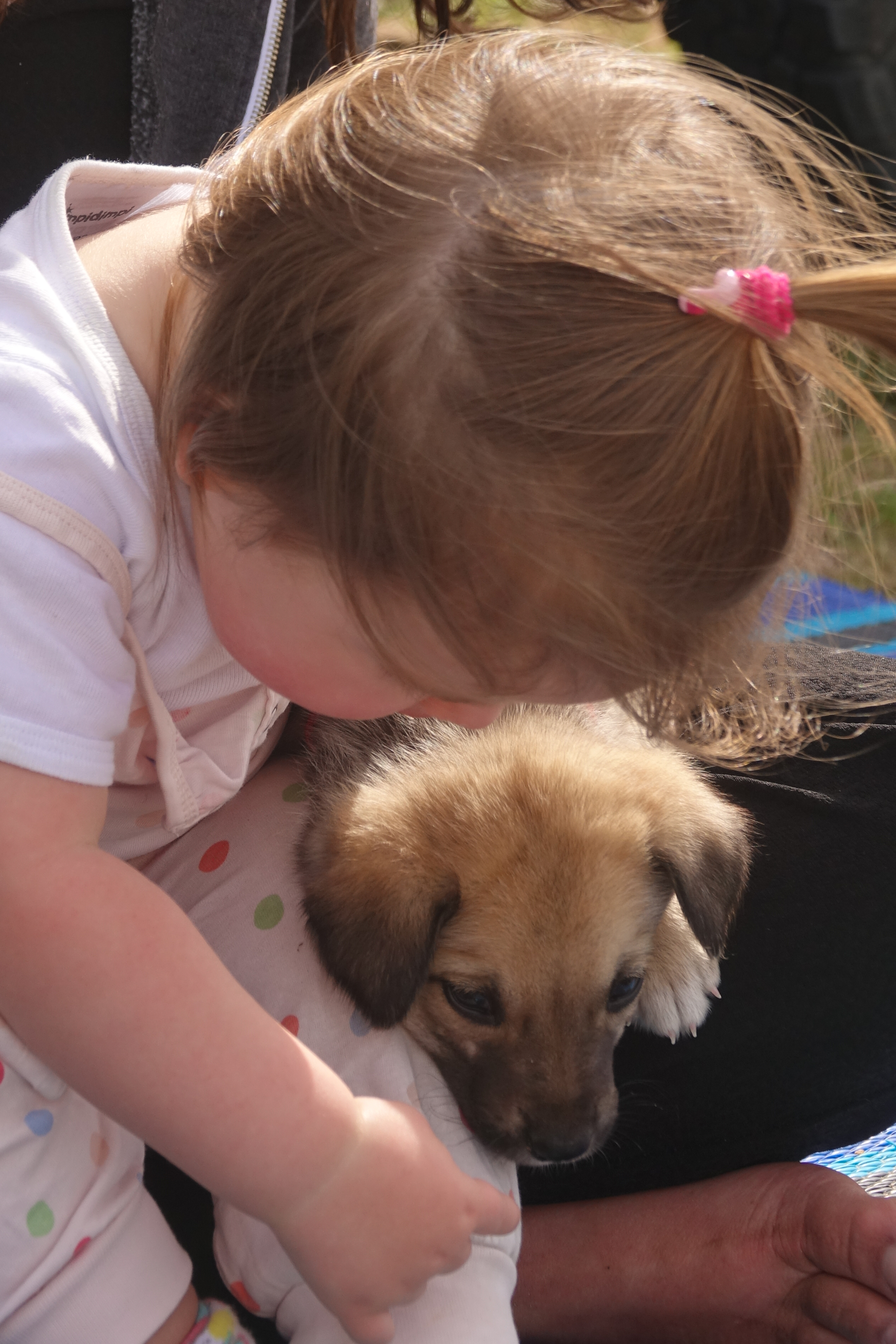 Amalia ist mit dem Hundebaby sehr glücklich.
