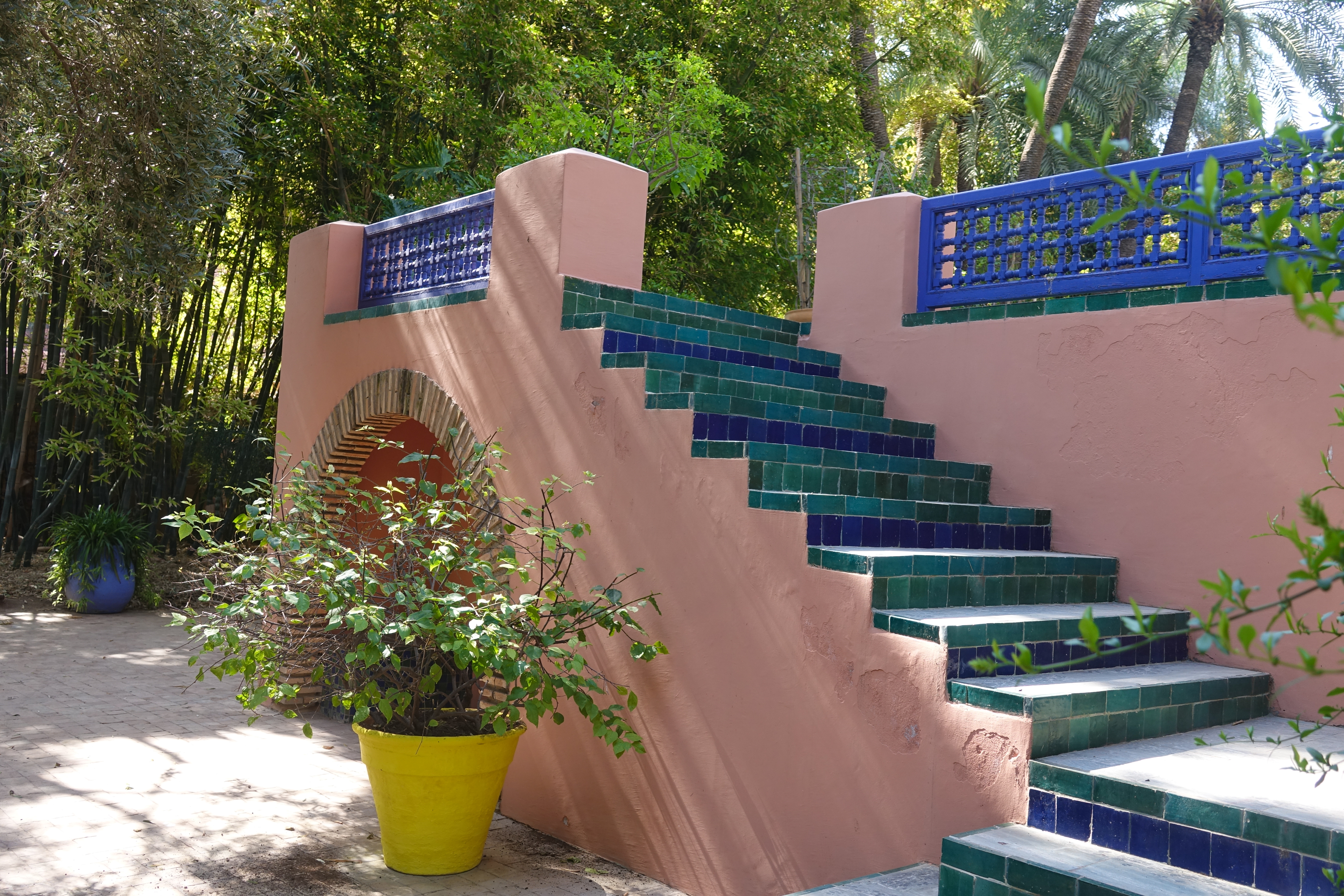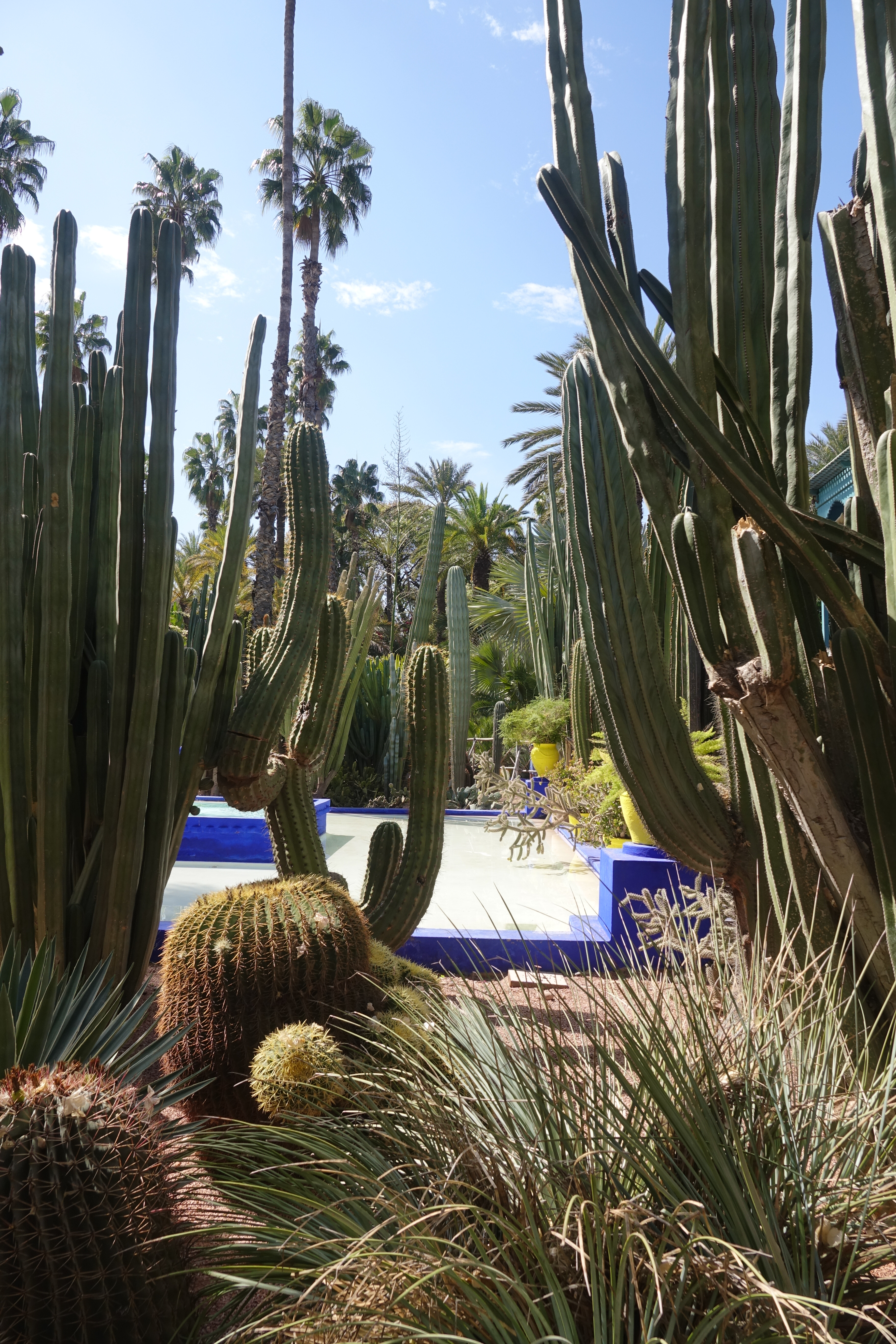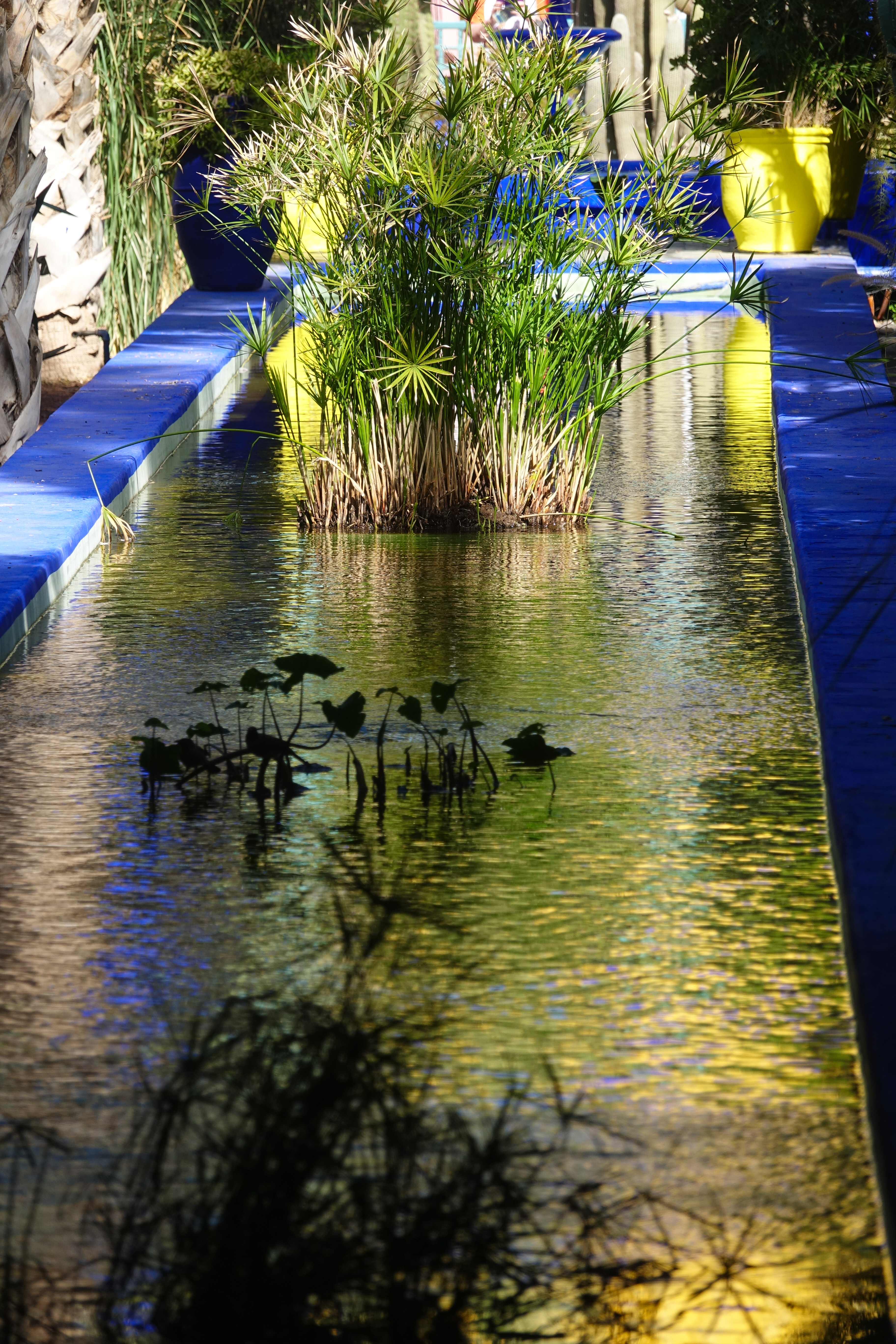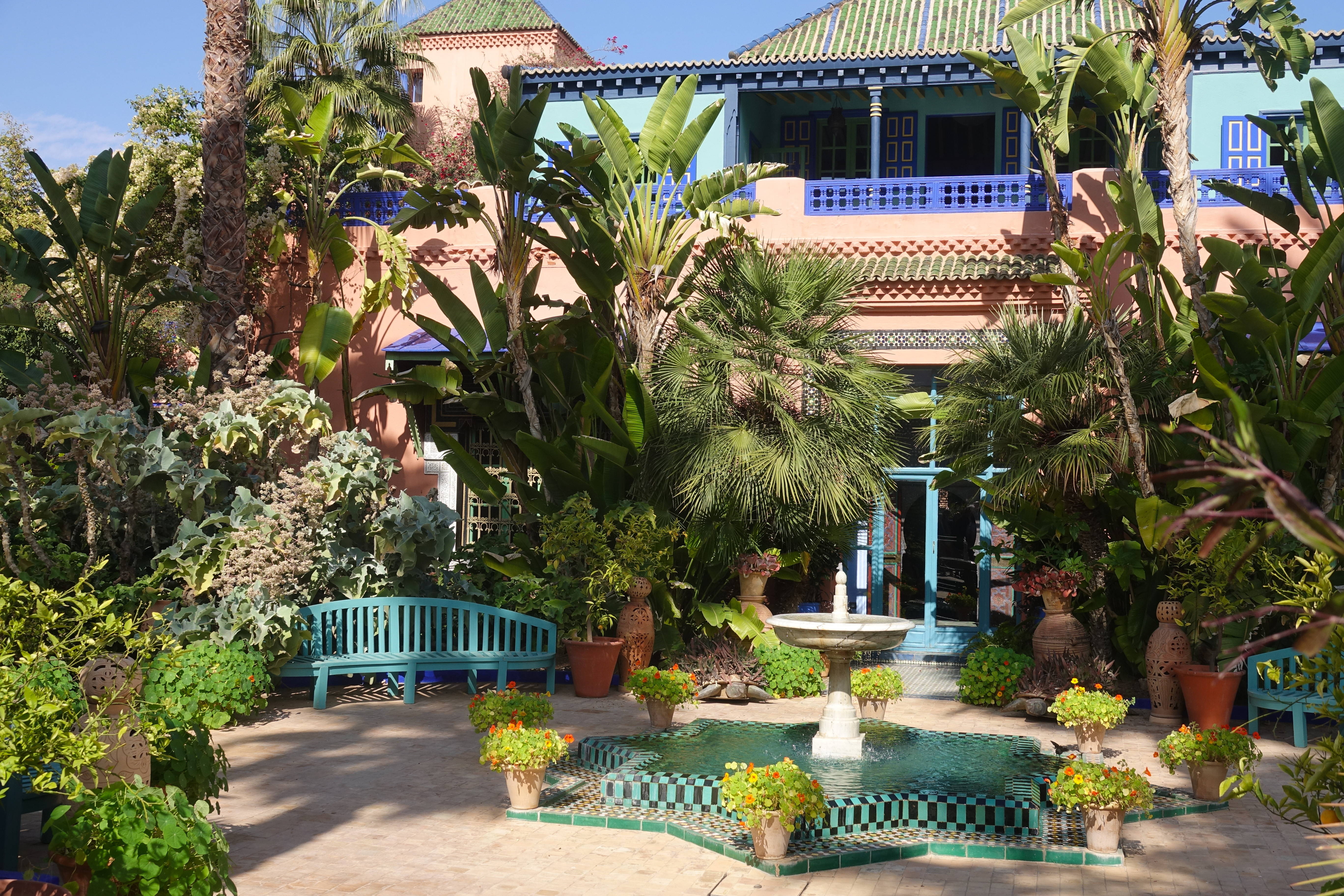 Der französische Maler Jaques Majorelle hat um sein Atelier einen herrlichen Garten angelegt. Es gibt einen sehr kühlen Bambuswald, Kakteen und Bougainvilleen. Die Pflanzen wirken großartig weil immer wieder dekorative Wasserbecken mit Pflanzendekorationen dazwischen angeordnet sind.