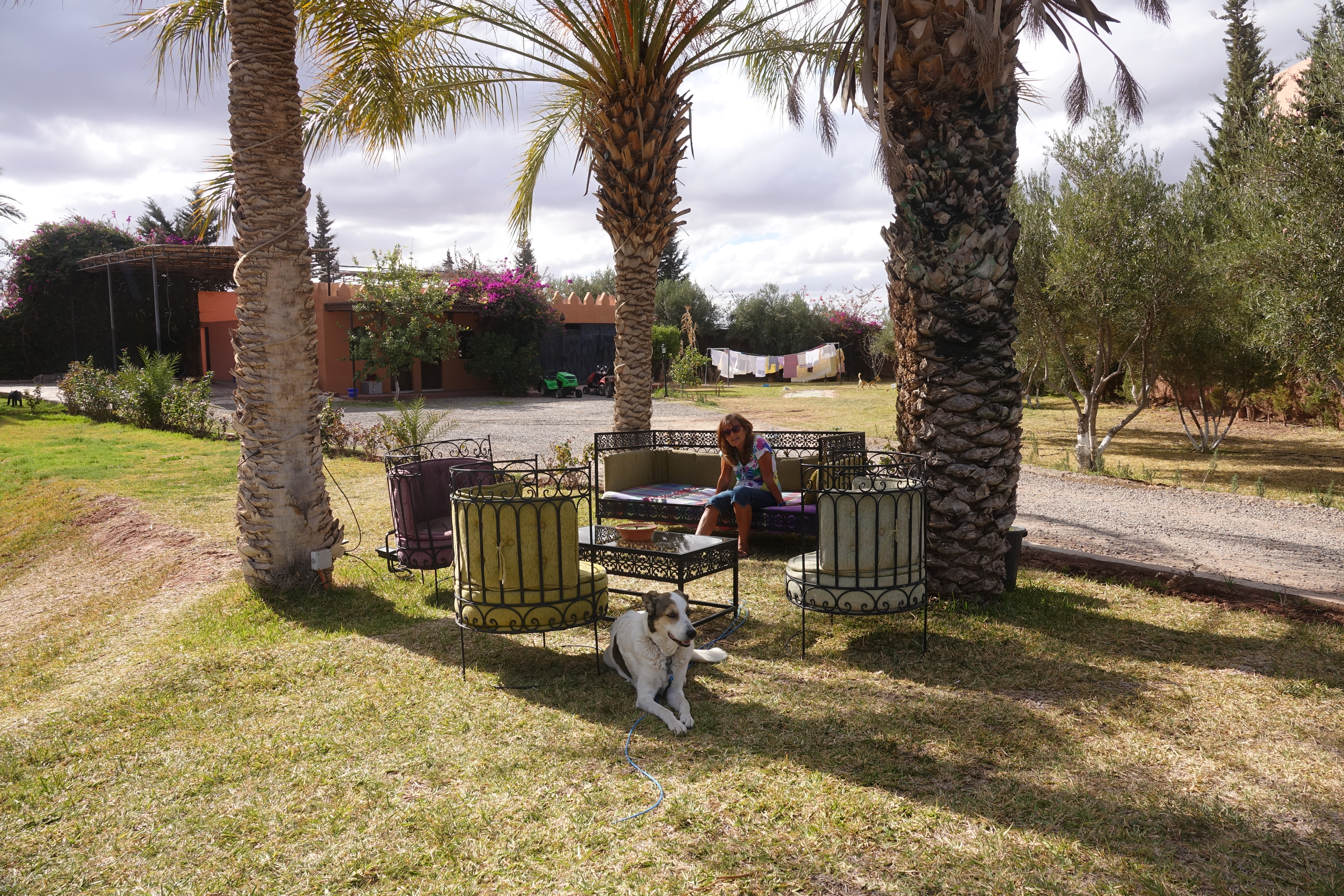 Danach geht es durch das Verkehrschaos von Marrakesch zum Stellplatz der Familie Schatz. Die deutsch-marrokanische Familie hat hier eine kashbaähnliche Villa gebaut und erlaubt es Wohnmobilfahrern in ihrem Park zu übernachten. Nach dem Lärm und Chaos von Marrakesch ist es hier wohltuend ruhig.