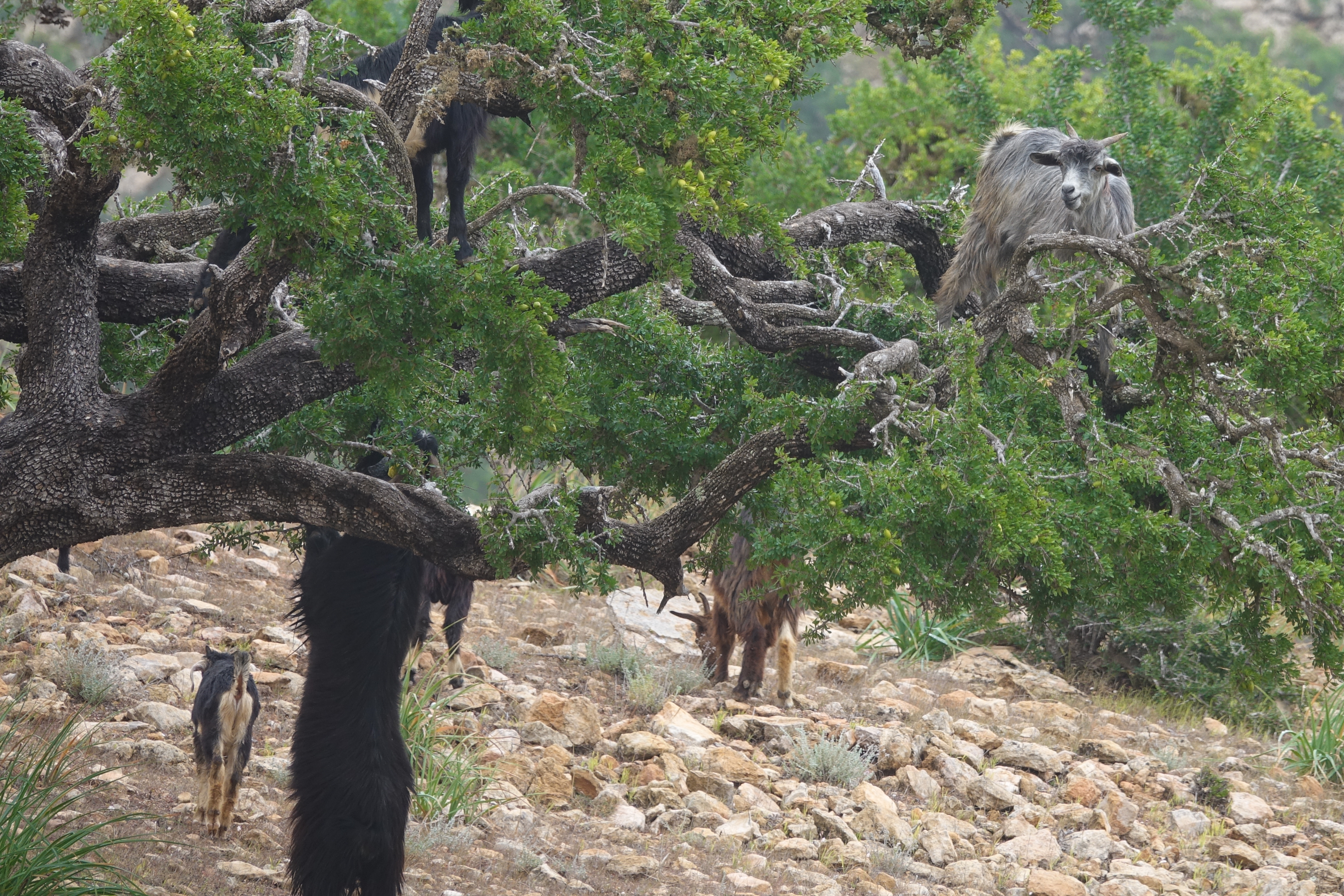 Von weitem hat der Ort ja wirklich Charme mit seinen blauen Fischerbooten, aber bei genauerem Hinsehen verliert der Ort, wie so oft in Marokko, seinen Reiz, weil viele Ecken so heruntergekommen sind. Daher entschließen wir uns, nach Sidi Kaouki zu fahren, um sicherheitshalber die Pension der Kinder unter die Lupe zu nehmen. Unterwegs sehen wir wieder Arganbäume, in denen die Ziegen herumklettern.