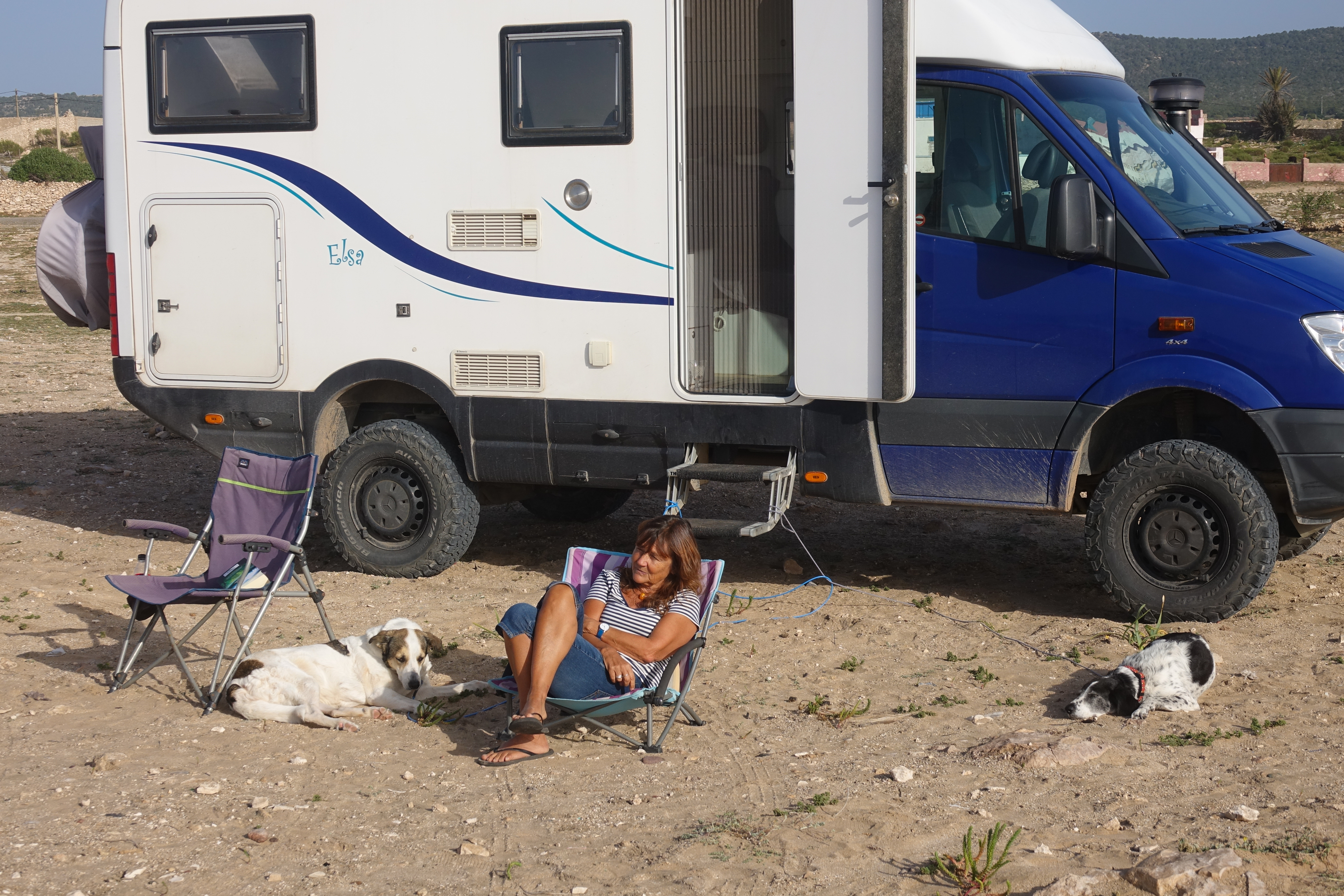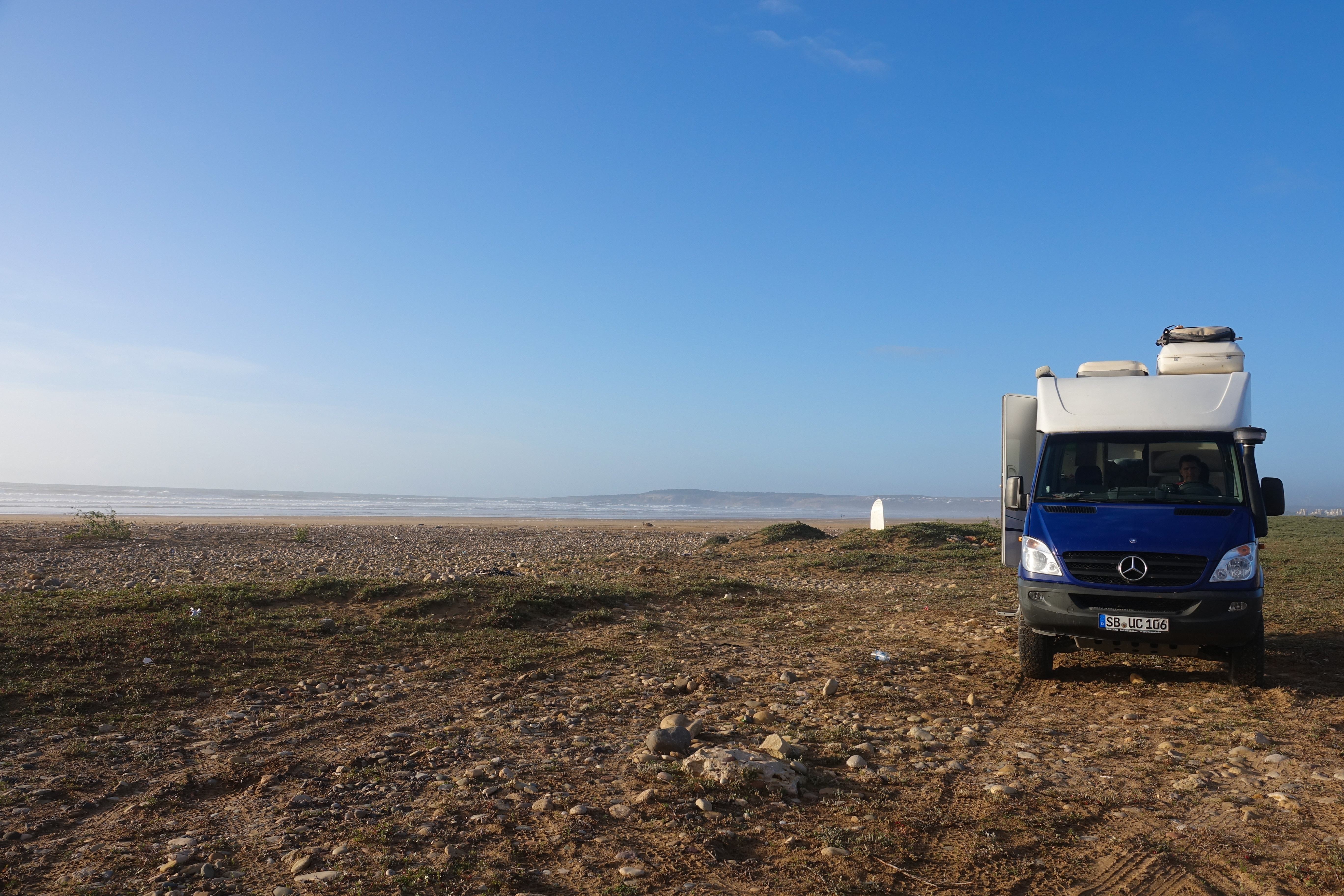 In Sidi Kaouki gehen wir zu unserem vertrauten Stellplatz „Camping Paradis Aicha“ und schauen uns noch ein bisschen um. Wir lernen ein Paar aus Cuxhaven kennen, das einen VW/MAN hat und schon fast die halbe Welt bereist hat. Passenderweise heißt ihr Auto Emma-Ännchen. Wir gehen zum Strand, weil dort bei unserer Ankunft ein Händler mit Boardbags stand, aber der ist leider verschwunden. Und die neuen Bekanntschaften werden nicht weniger, ein Paar aus Bad Dürkheim spricht uns an und wir reden über die vielen Reisen und auch über ihren MAN. Auch „alte“ Bekannte aus Dakhla treffen wir auf dem Platz wieder.