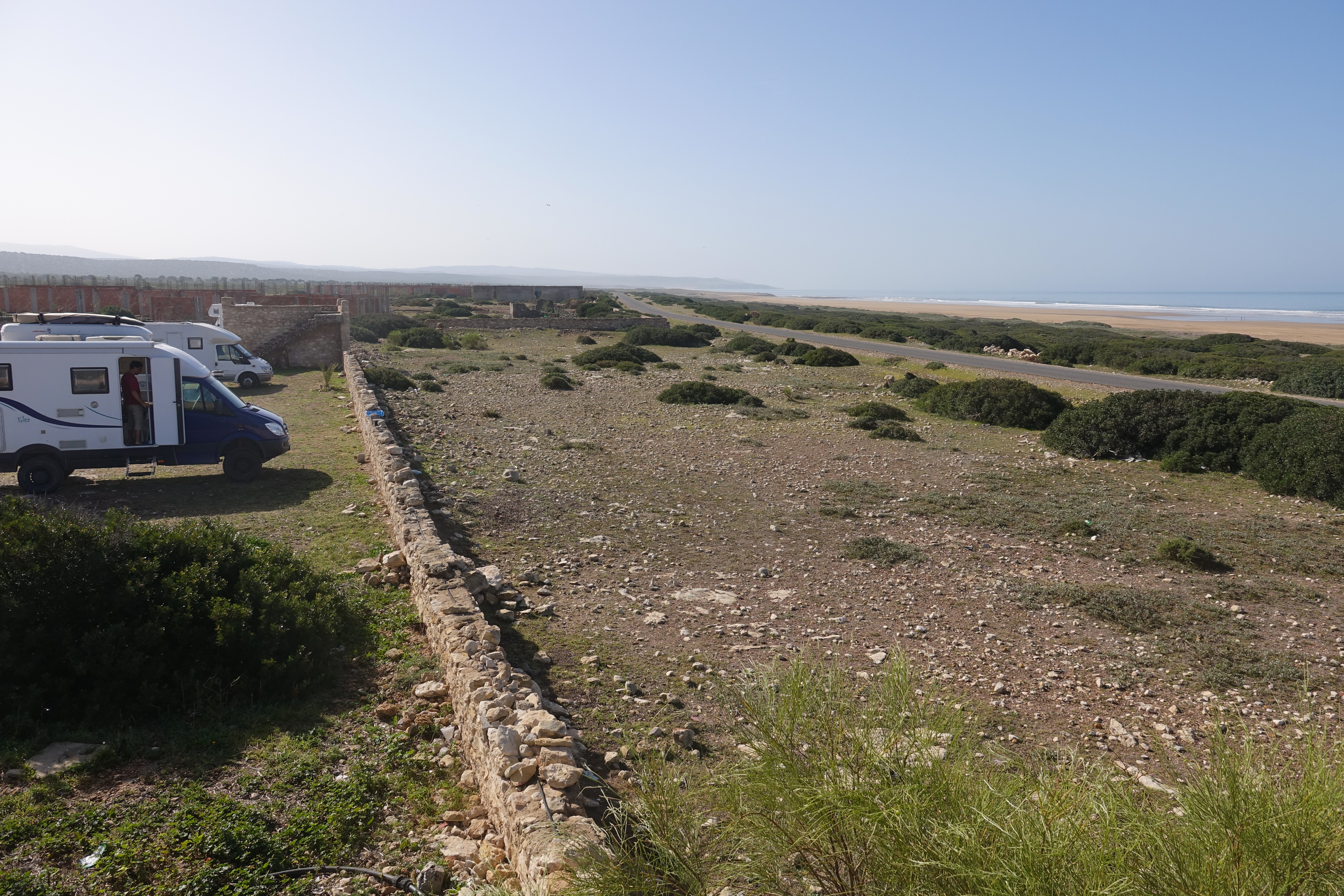 Wir haben jetzt das Rätsel gelöst, warum die Wohnmobile hier geordnet stehen müssen. Die Polizei möchte alles zu unserem Schutz im Blick haben. Lieb! So kennen wir sie. Wir vertrödeln den Tag mit Lesen und werden dabei von der Polizei bewacht. Dieses Privileg hat man in Europa eher selten, wenn man nicht gerade im Knast sitzt.  Uns fällt auf, dass die Polizei und Militärpräsenz im Land ziemlich hoch ist. Wir wissen nicht, wie das die Einheimischen empfinden, uns gegenüber waren die Polizisten und Militärangehörigen immer freundlich und hilfsbereit (bis auf das angebliche Rechtsüberholen am Anfang unserer Marokkoreise). Das Meer ist heute extrem stürmisch und ständig liegt ein leichter Salzschleier in der Luft.
