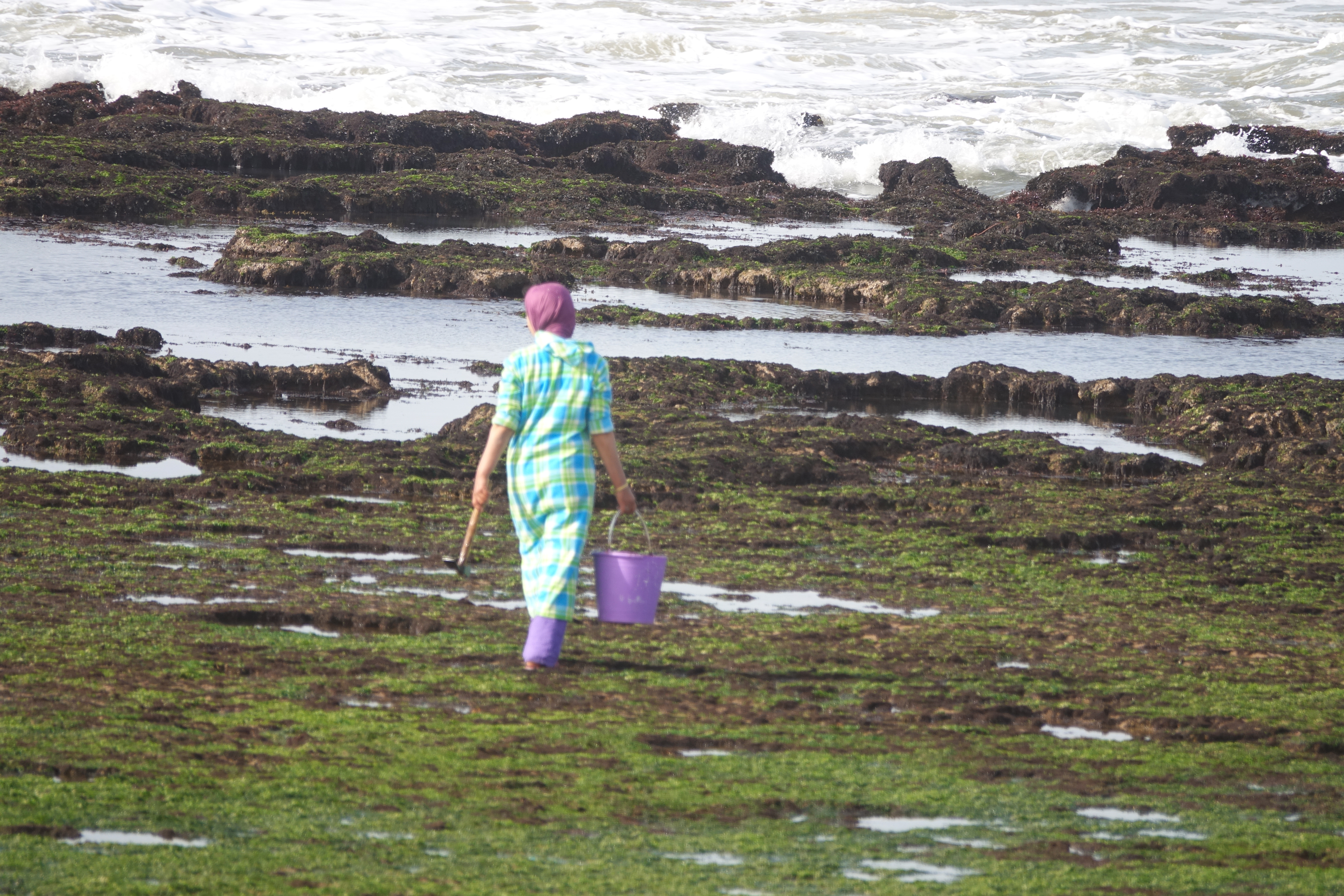 Der Strand ist hier in Bouzerktoun felsig und die einheimischen Frauen ernten hier das Seegras und trocknen es. Was sie damit machen, wissen wir auch nicht.