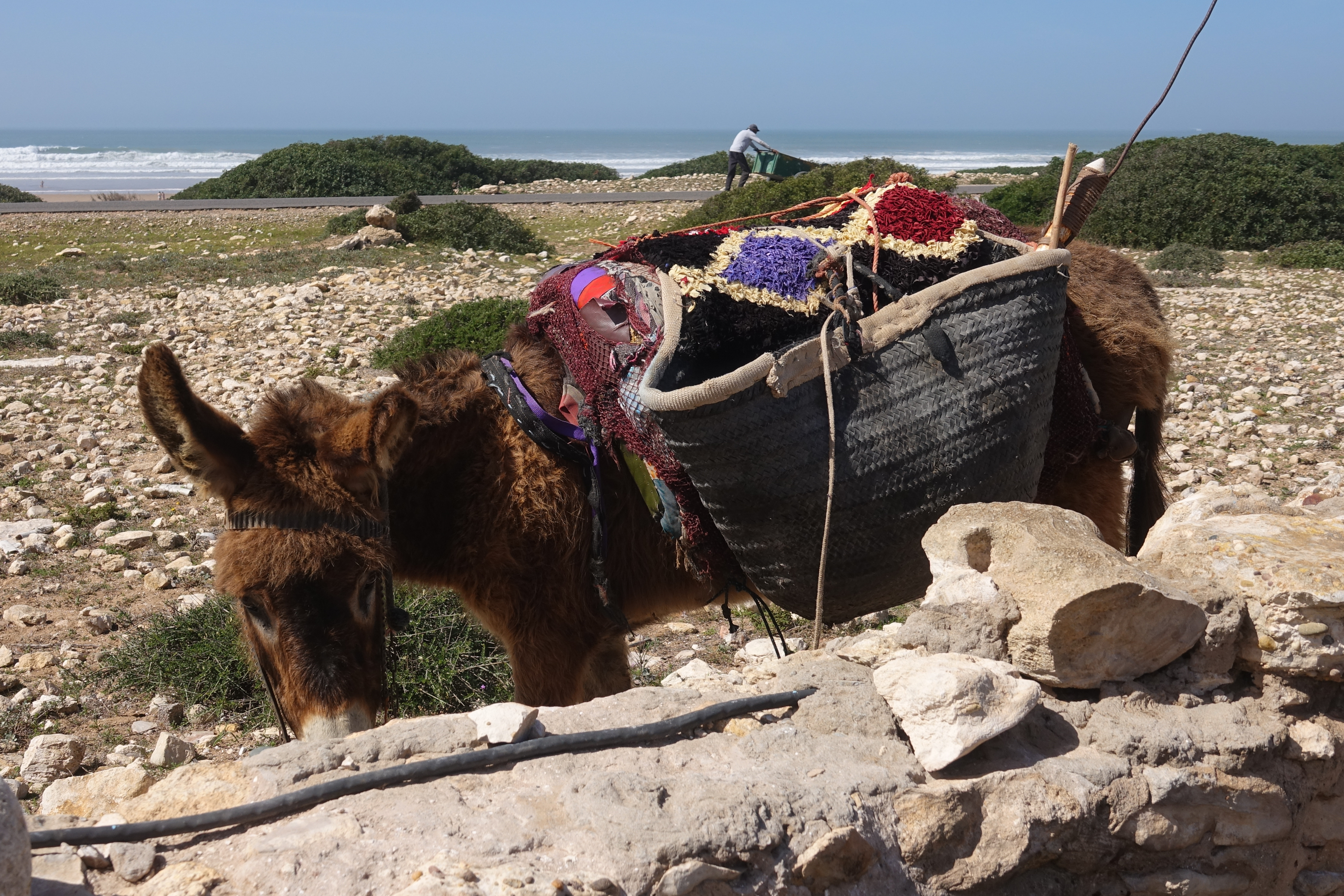 Nach dem Frühstück geht erst erst einmal mit Mali und Jan zu einem Strandspaziergang in Sidi Kaouki. Vor allem die Dromedare haben es unserem Enkelkind angetan.