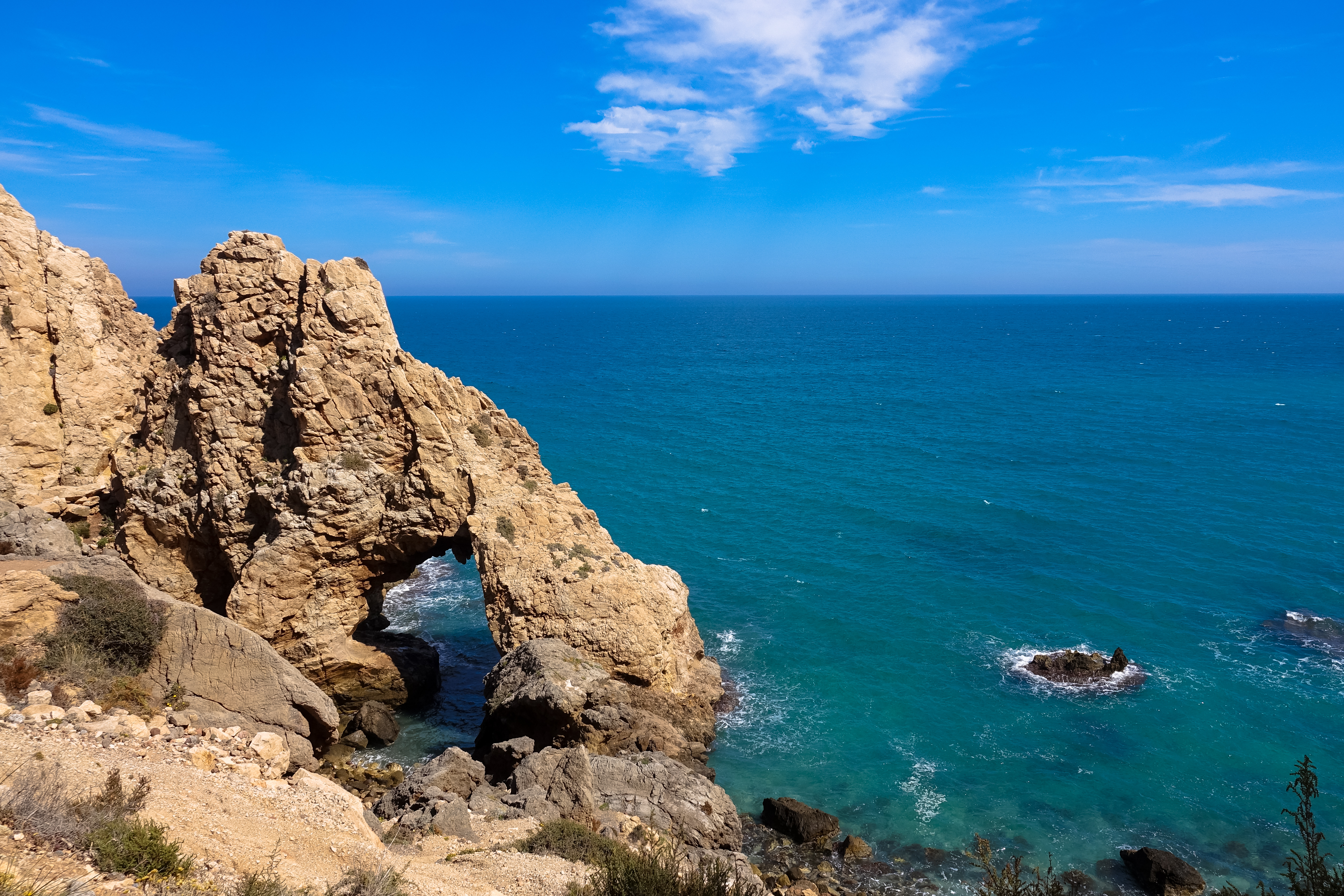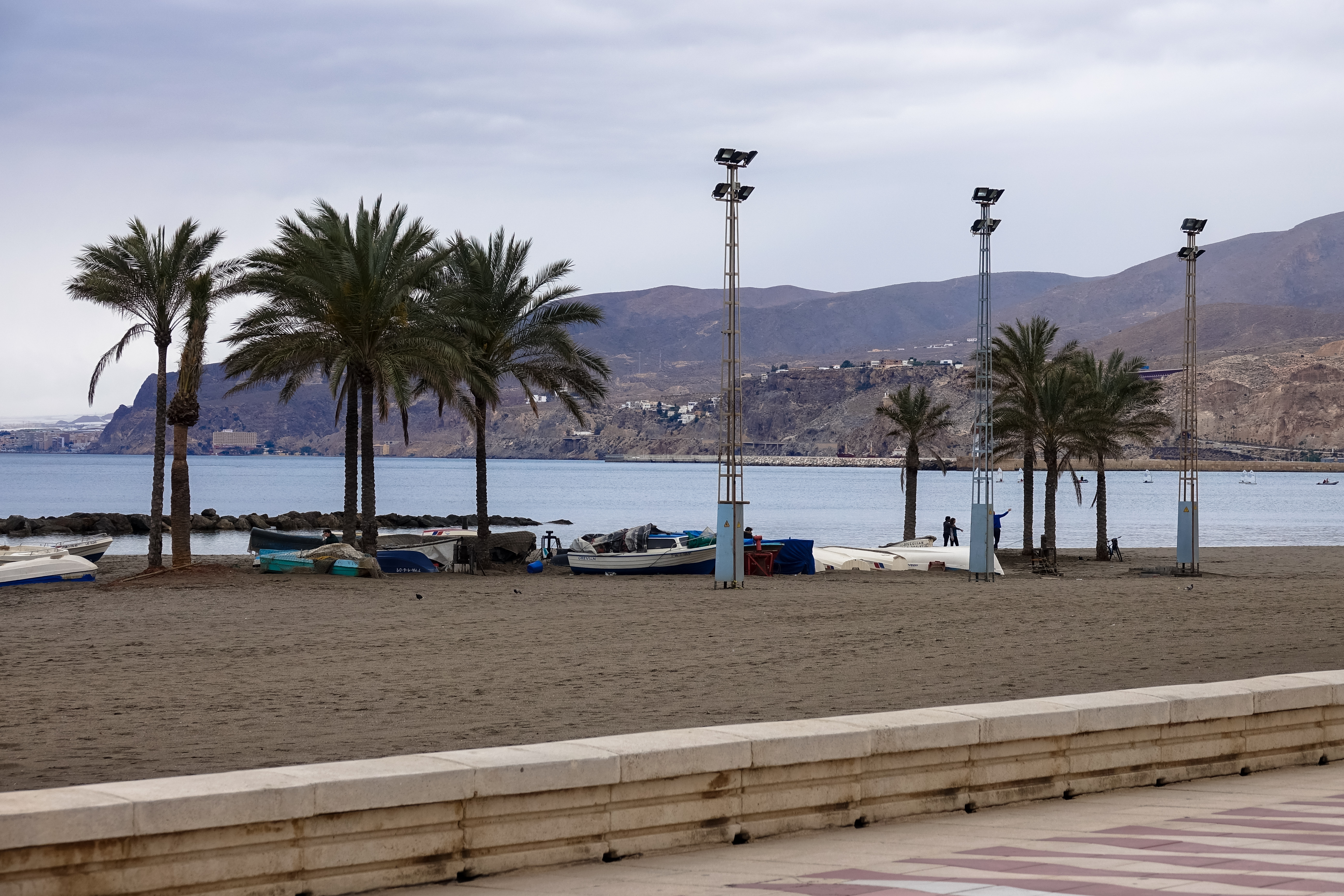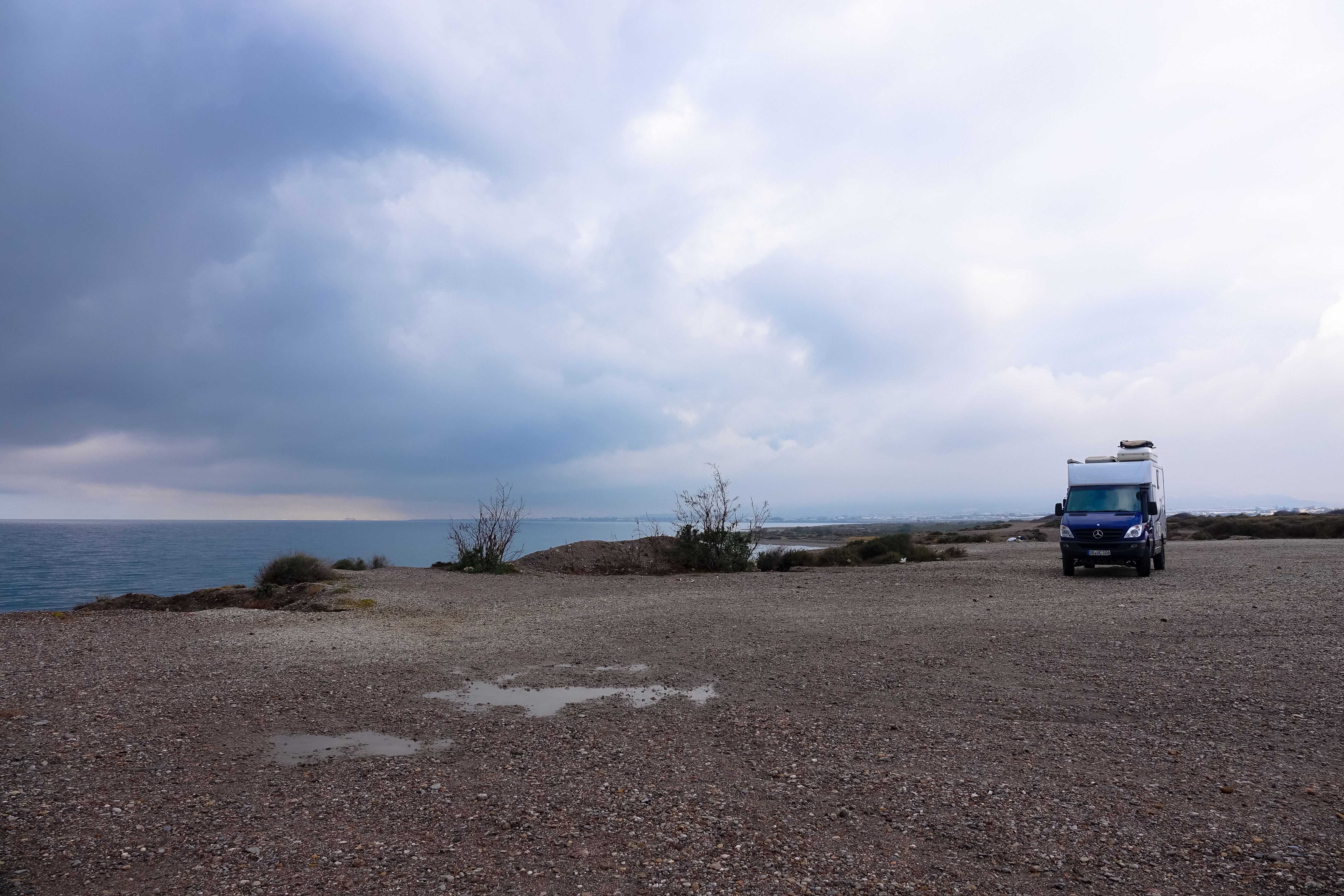 Nach 2 Stunden ist unser Kleiderschrank wieder gut gefüllt mit sauberen Klamotten und wir fahren außerhalb von Almeria zu einem einsamen Plätzchen bei Retamar. Die Camperapps machen das Leben schon leichter. Als wir vor 5 Jahren spät von der Marokkoreise in Almeria ankamen, haben wir uns einfach in eine normale Wohnstraße gestellt und dort geschlafen. Jetzt sagt uns die App, dass es im Hafen sogar einen offiziellen Platz gegeben hätte. Morgen wollen wir dann bei Sonnenschein die Küste oberhalb, also nördlich des Cabo Gata erkunden, weil wir vor 5 Jahren festgestellt haben, dass diese Gegend noch wunderschön ist.