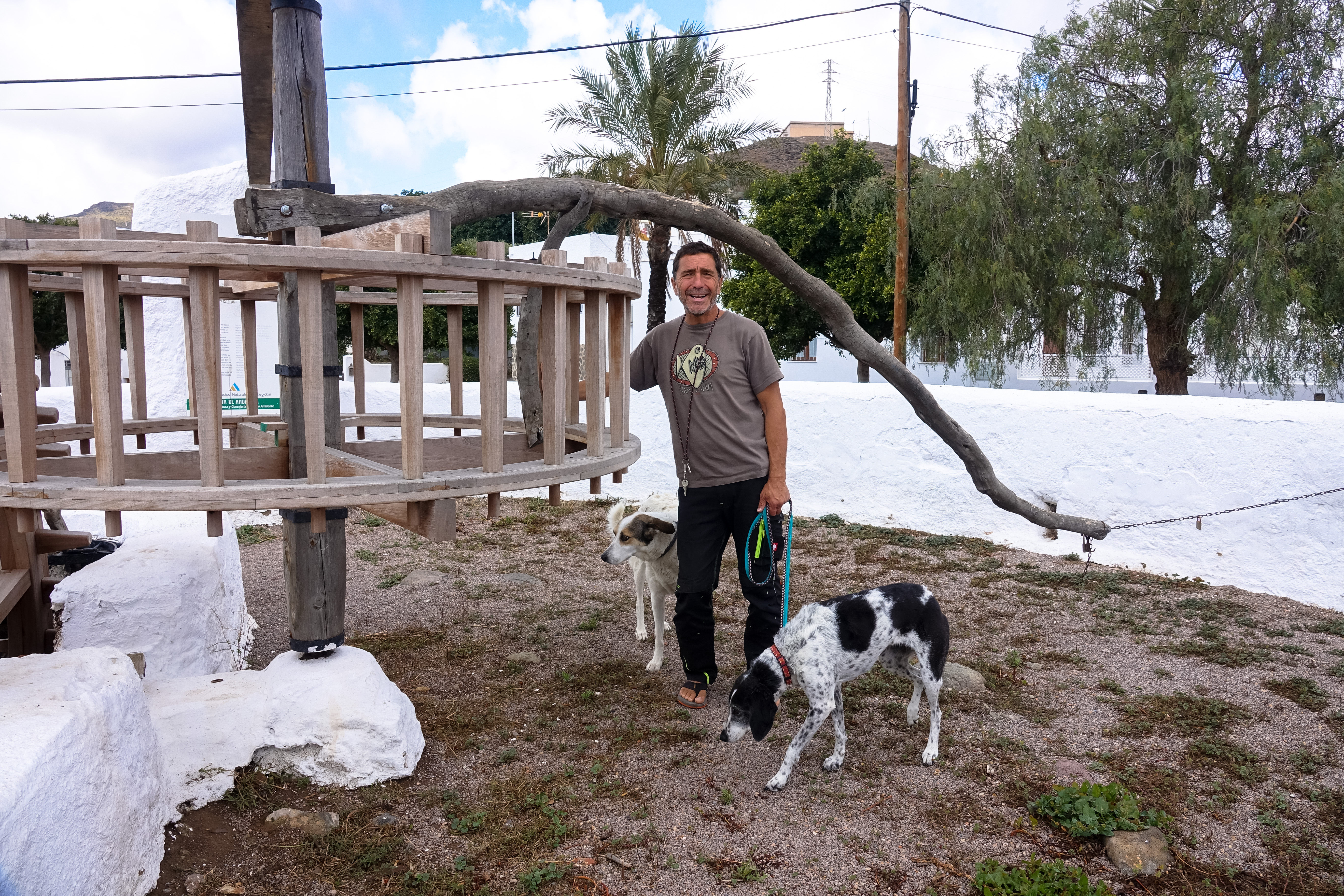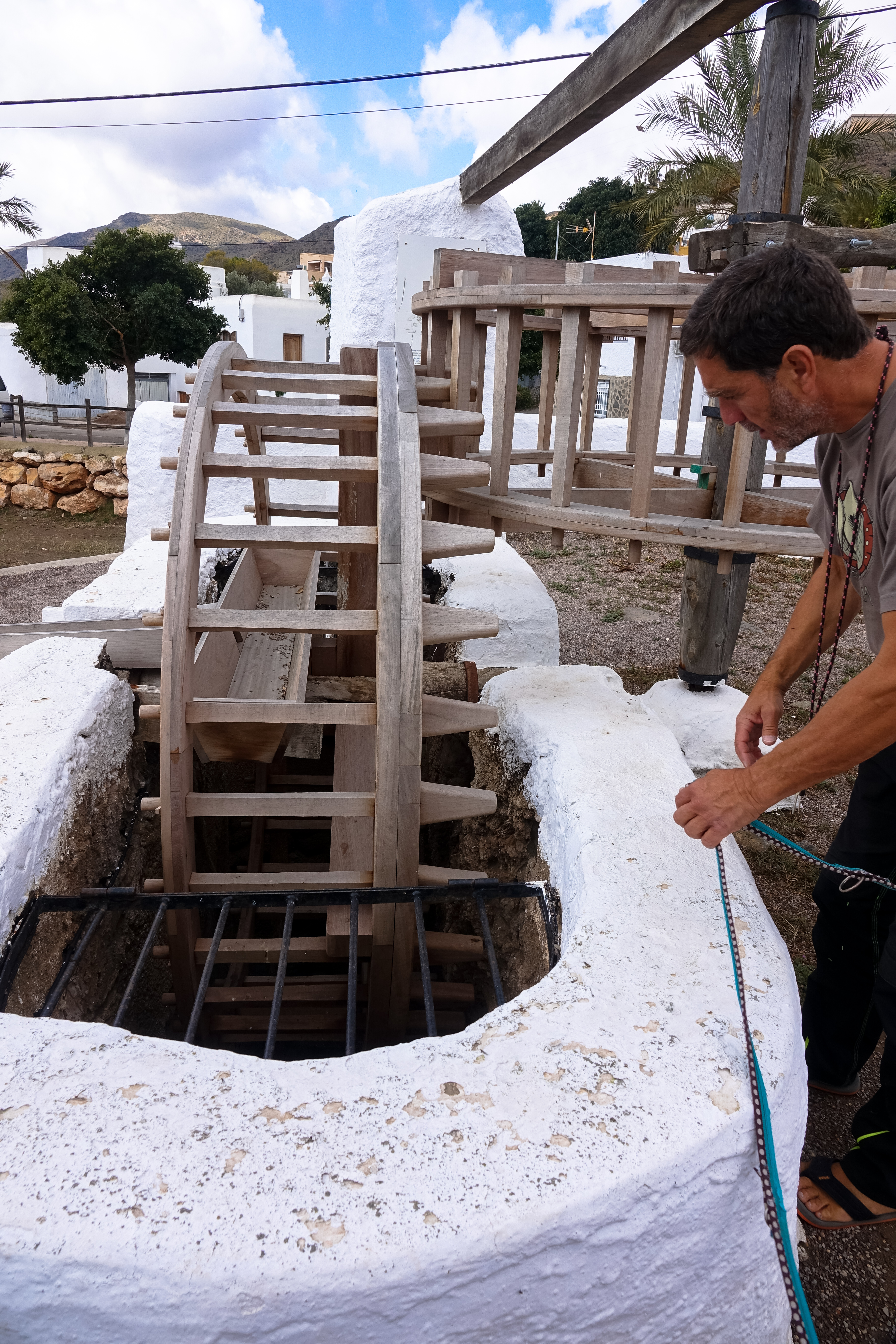 Dort entdecken wir eine schönes altes Schöpfrad, das von einem Esel angetrieben wurde. Heute ist Esel Uwe an der Reihe, hat aber glücklicherweise Verstärkung mit insgesamt 8 Pfoten dabei.