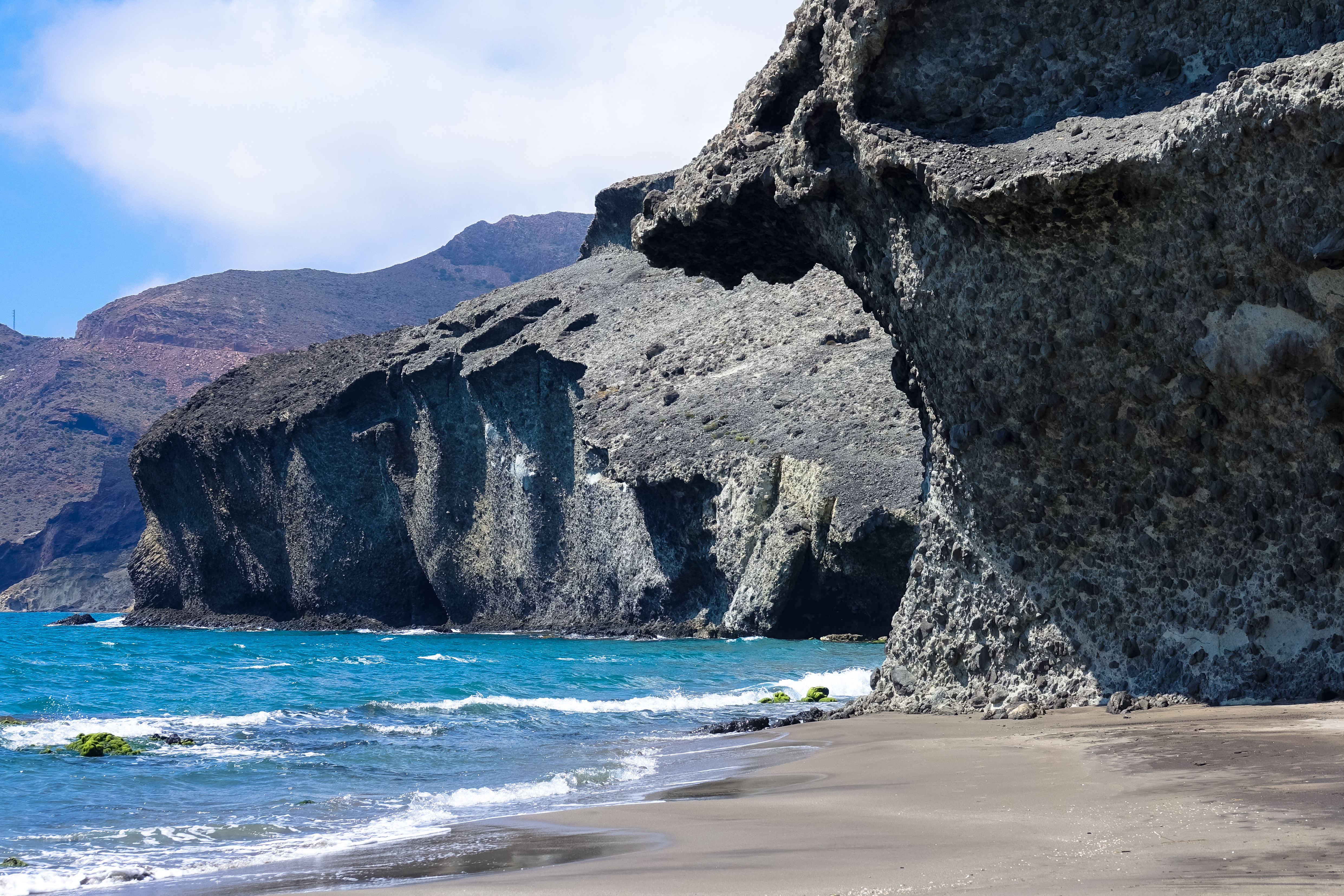 Dann geht es noch 2 km weiter zur Playa Mónsul. Dieser Strand sieht so ganz anders aus, als die anderen, weil es hier einmal einen Vulkan gab, aber das ist schon lange her. Also keine Sorge!