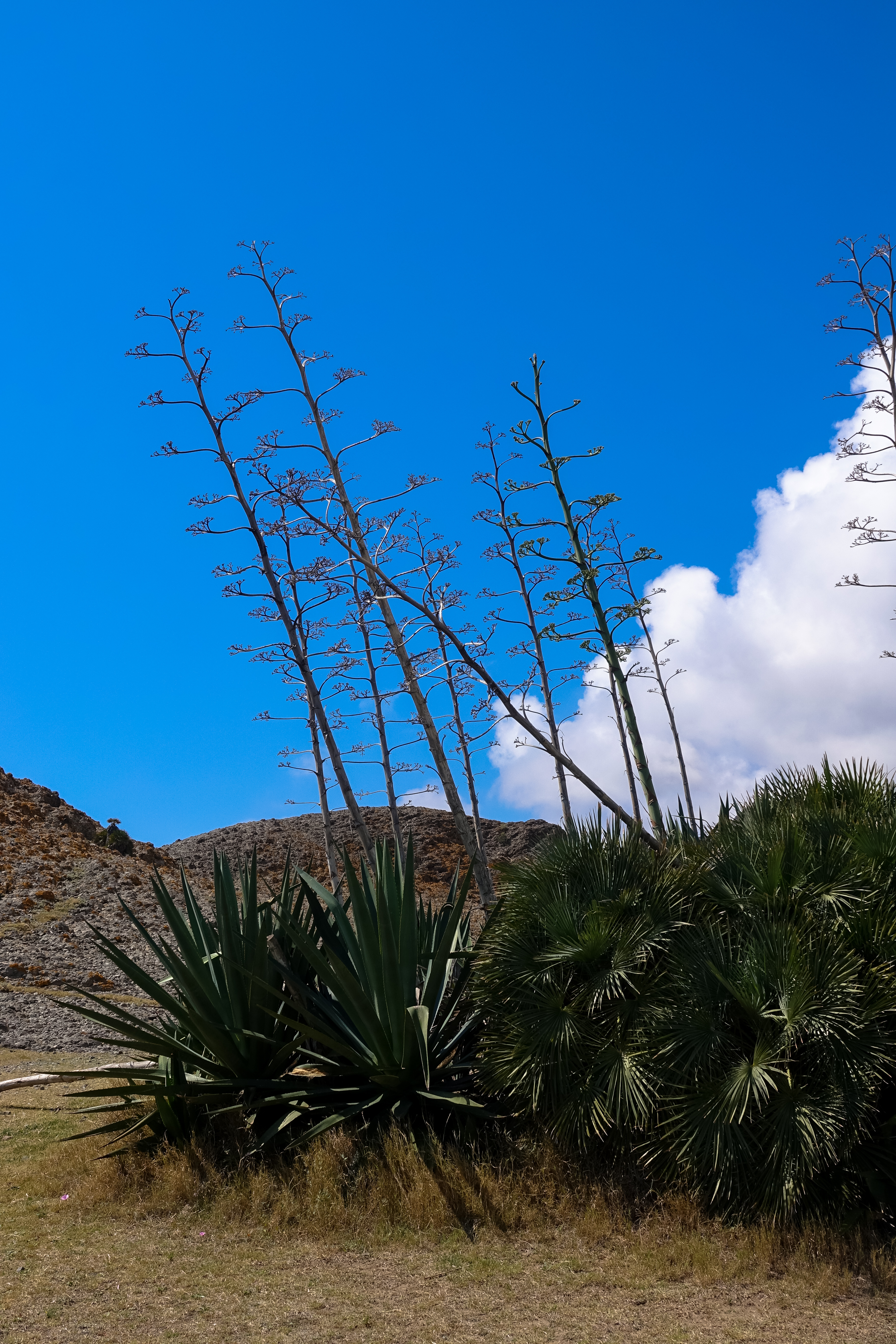 Hier wachsen sehr viele Agaven, die mit ihren filigranen Blütenständen der Landschaft einen Touch wie aus dem „Wilden Westen“ geben.