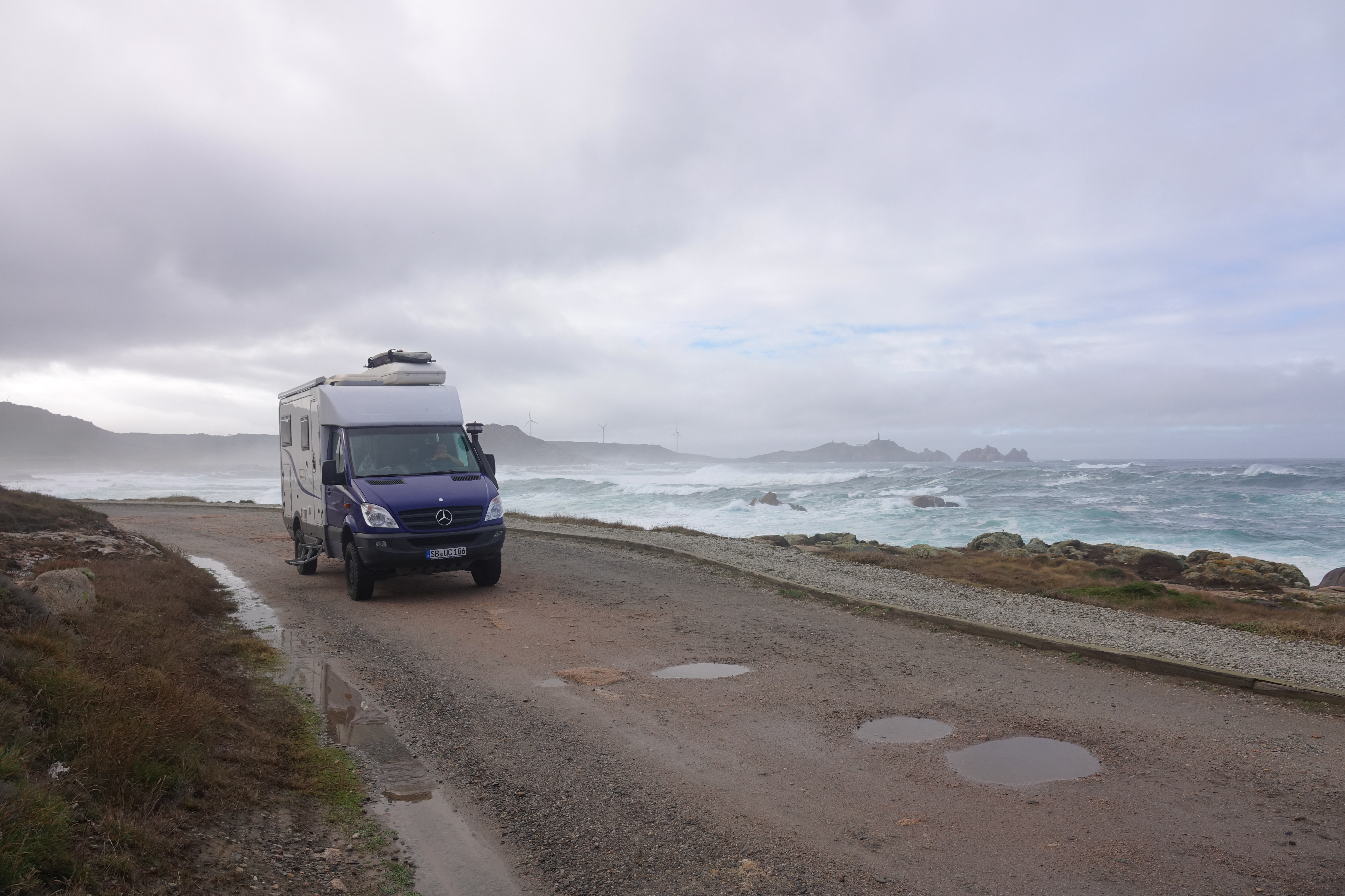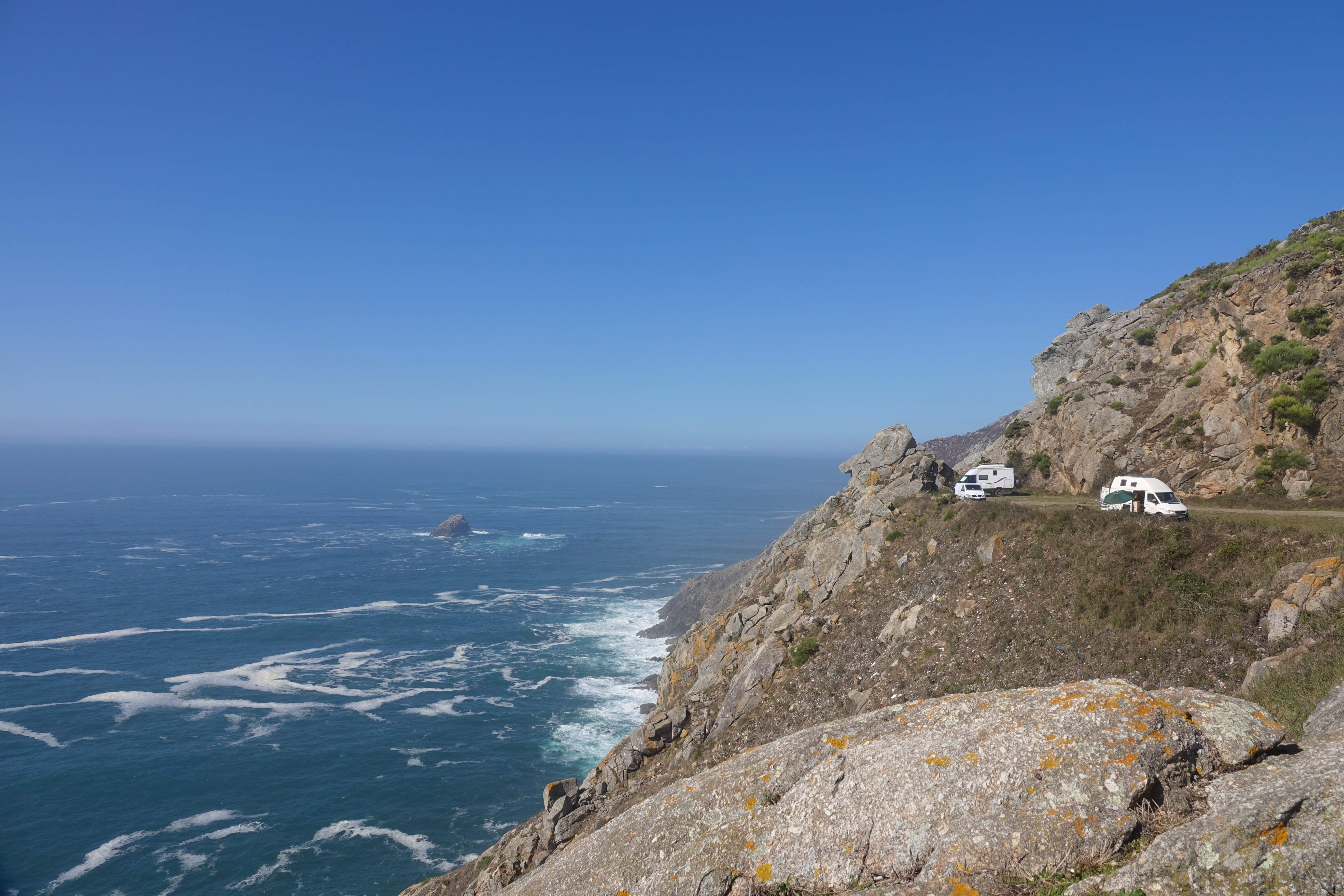 Unser Nachtlager schlagen wir am westlichsten Punkt Europas auf, zumindest fast. Eigentlich ist der westlichste Punkt das Cabo da Roca in Portugal. Der westlichste Punkt der iberischen Halbinsel ist hier aber schon, auch wenn das Cabo Fisterra viel populärer ist. Am Punta de Corsen waren wir am Anfang unserer Reise schon und das Cabo da Roca werden wir auch bald wiedersehen.