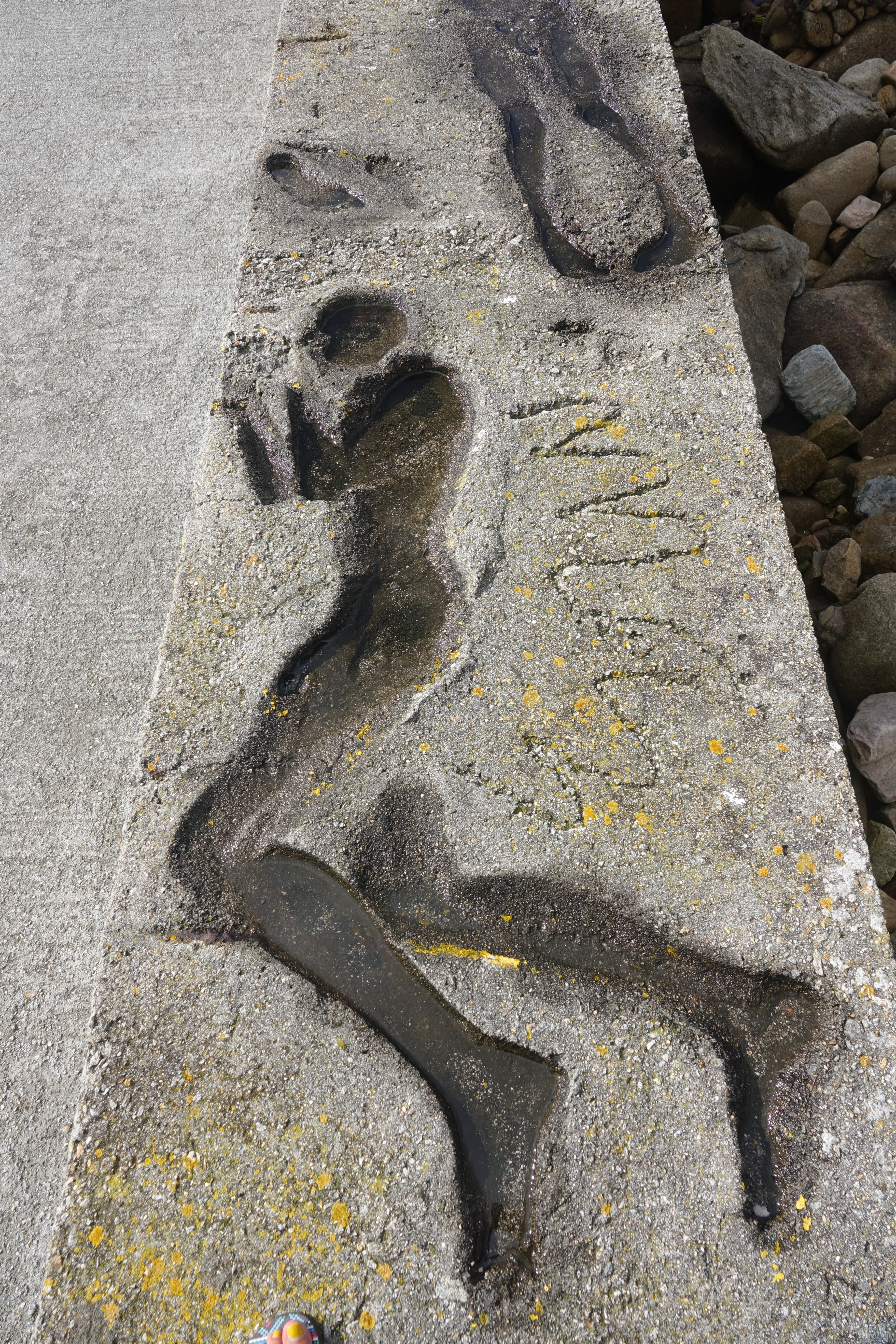 Hier hat nicht etwa jemand seinen Schuh vergessen, sondern es handelt sich um ein Kunstwerk zur Erheiterung der müden Pilger, die am liebsten ihre Wanderschuhe fortwerfen würden.