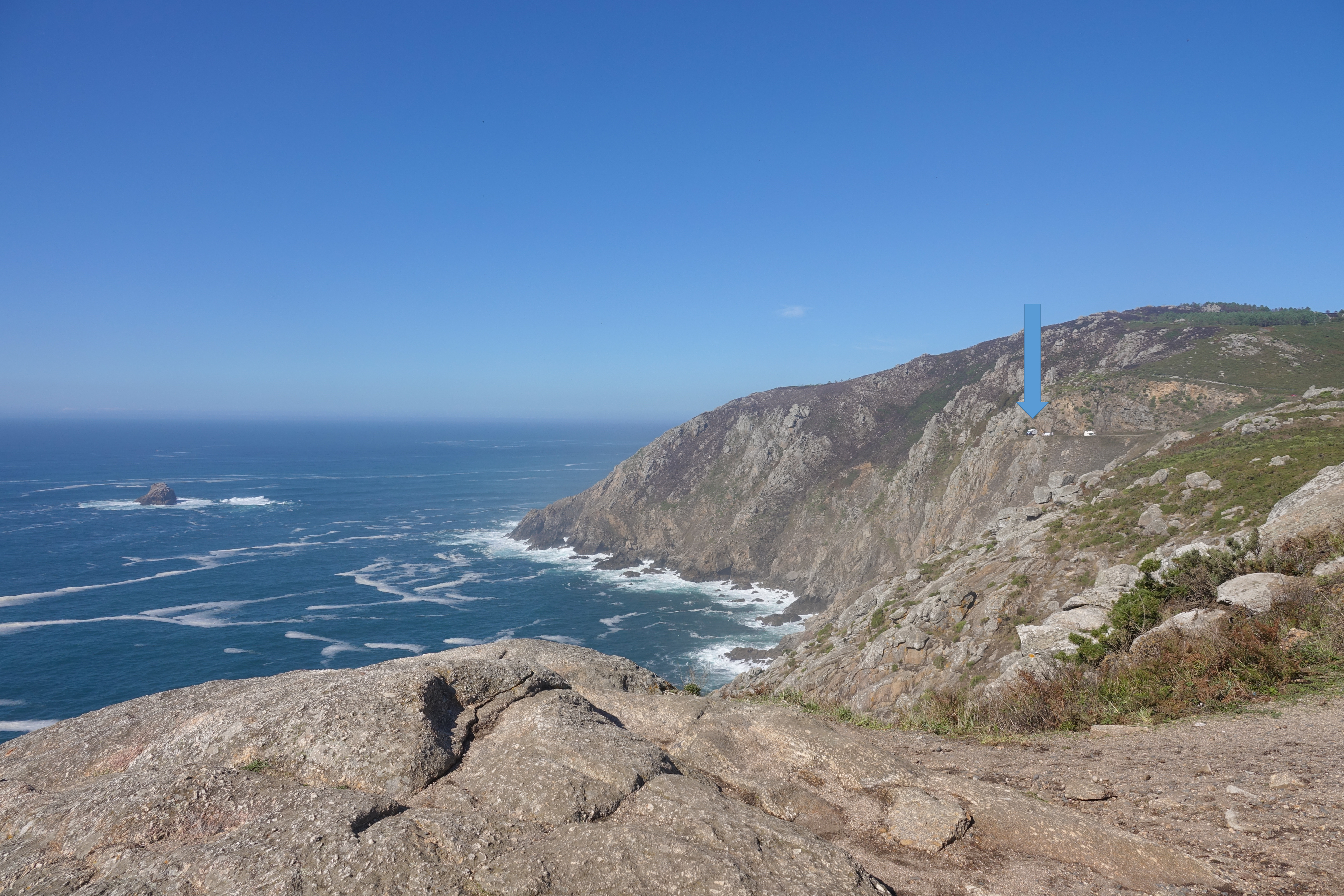 Der Stellplatz am Cabo Fisterra ist wirklich einzigartig. Dort unter dem blaue Pfeil steht unsere Elsa.