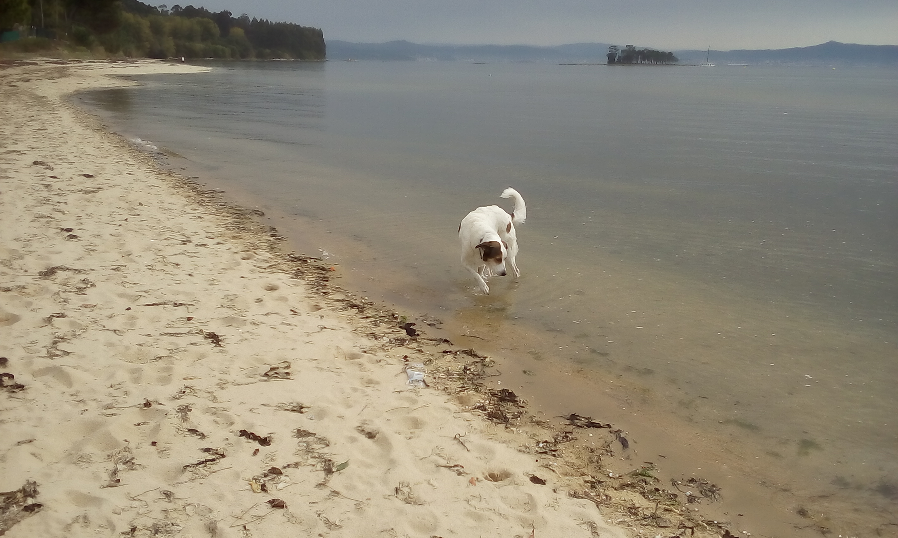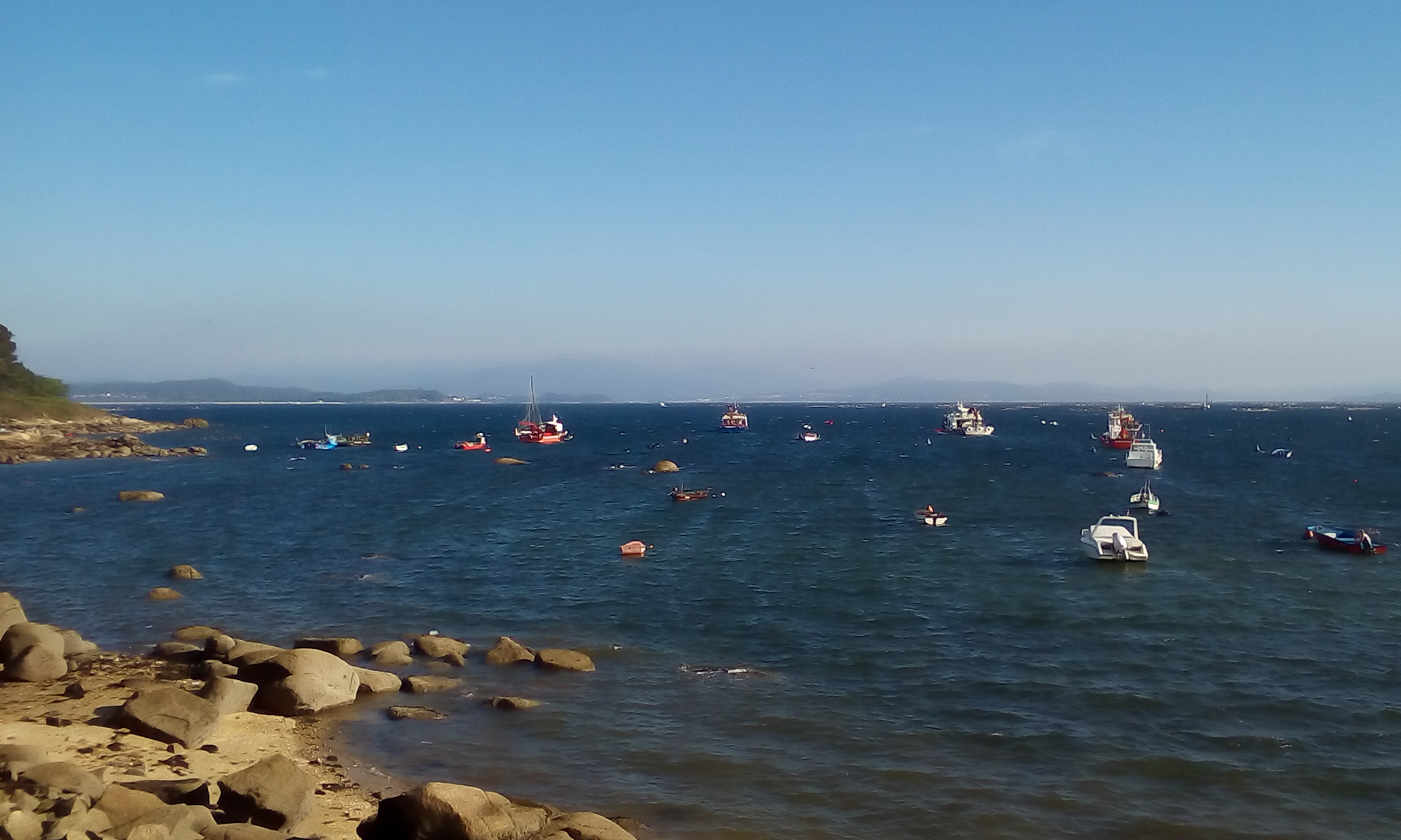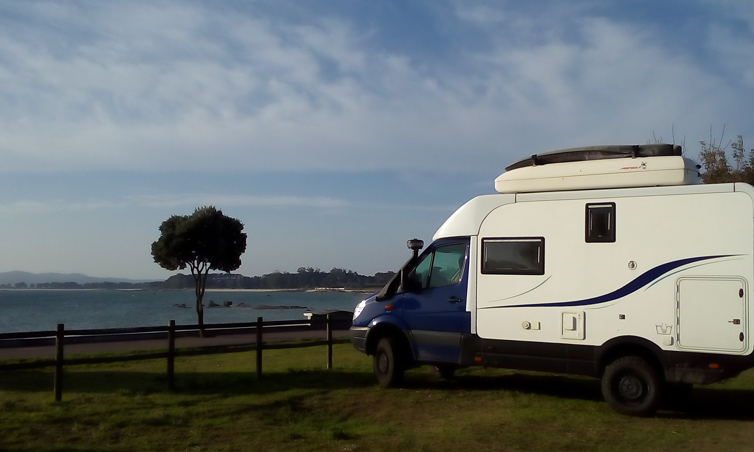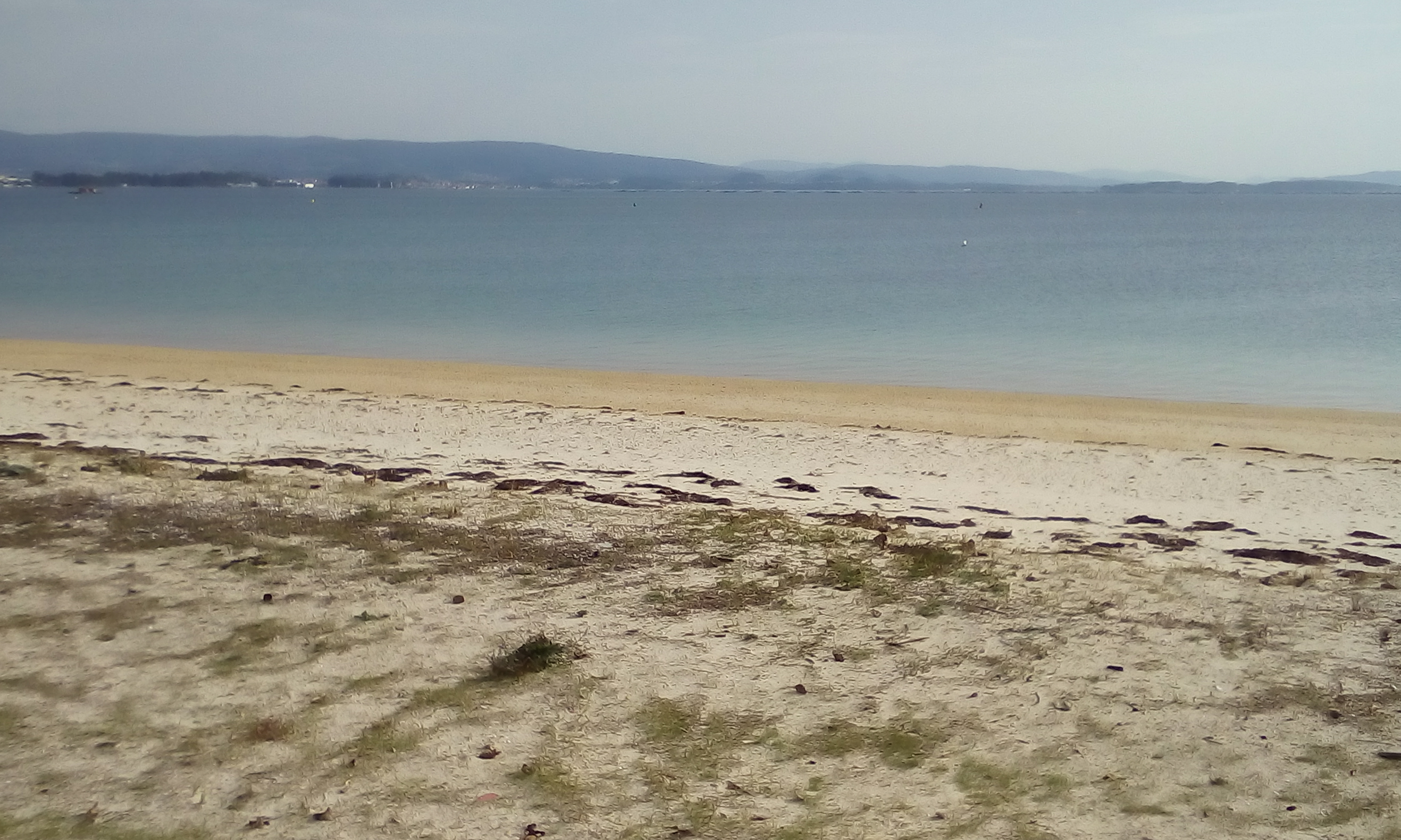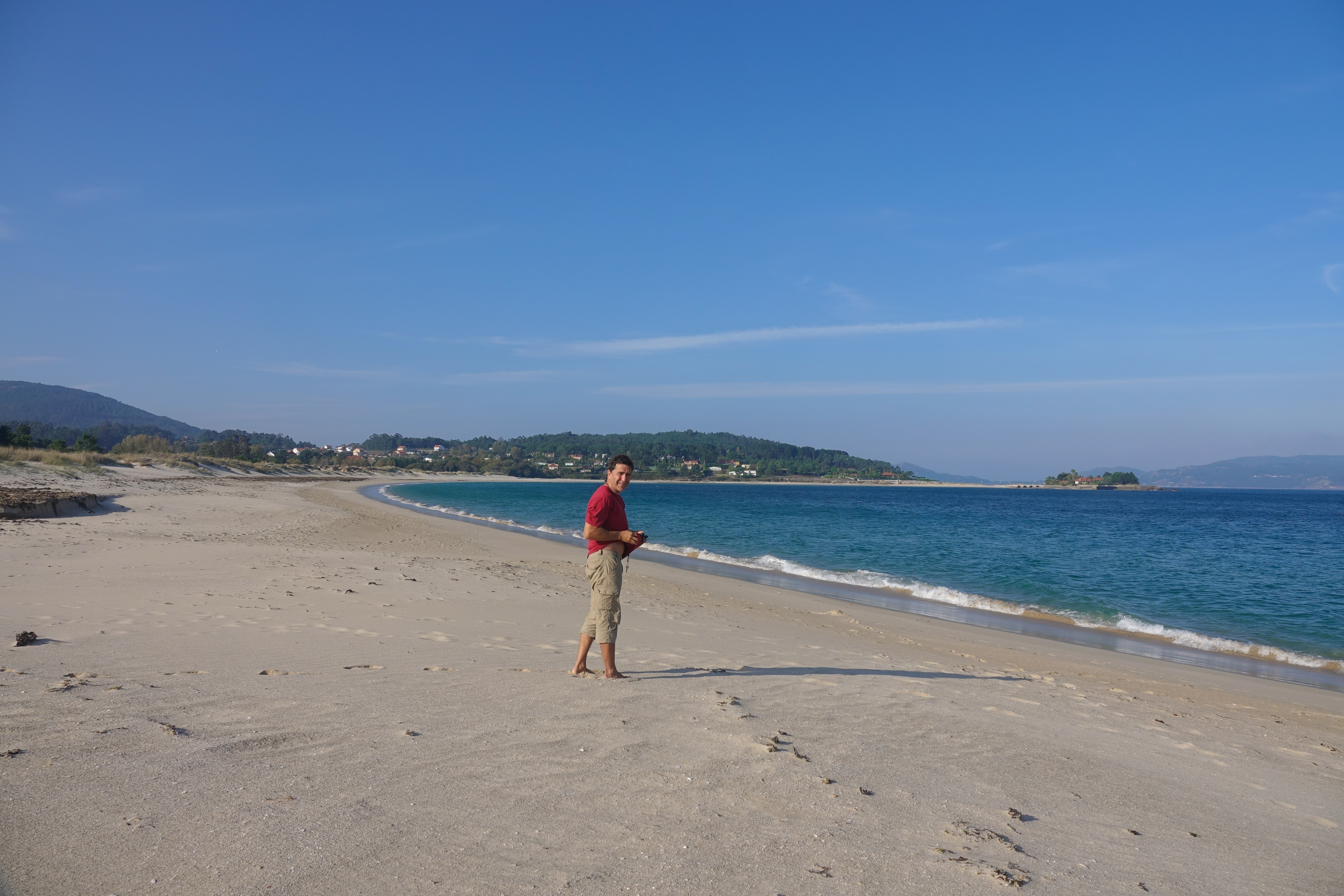 Wir wussten ja, das die Rias baixas stark zersiedelt sind, aber nach unseren vollkommen menschenleeren Stränden von gestern und vorgestern, kam die Flut von Ferienwohnungen doch ziemlich überraschend. Im Inneren wirkt das Meer der Rias immer wie ein See, zum Schwimmen ist das angenehm, aber trotzdem gefällt es uns nicht. Außerdem gibt es hier viele Muschel-Zuchtanlagen. Dann versuchen wir es doch Mal mit einer Insel. Die Isla Arousa ist durch eine lange Brücke mit dem Festland verbunden und dort gibt es einen Strandparkplatz, wo wir unser Nachtlager aufschlagen können.
