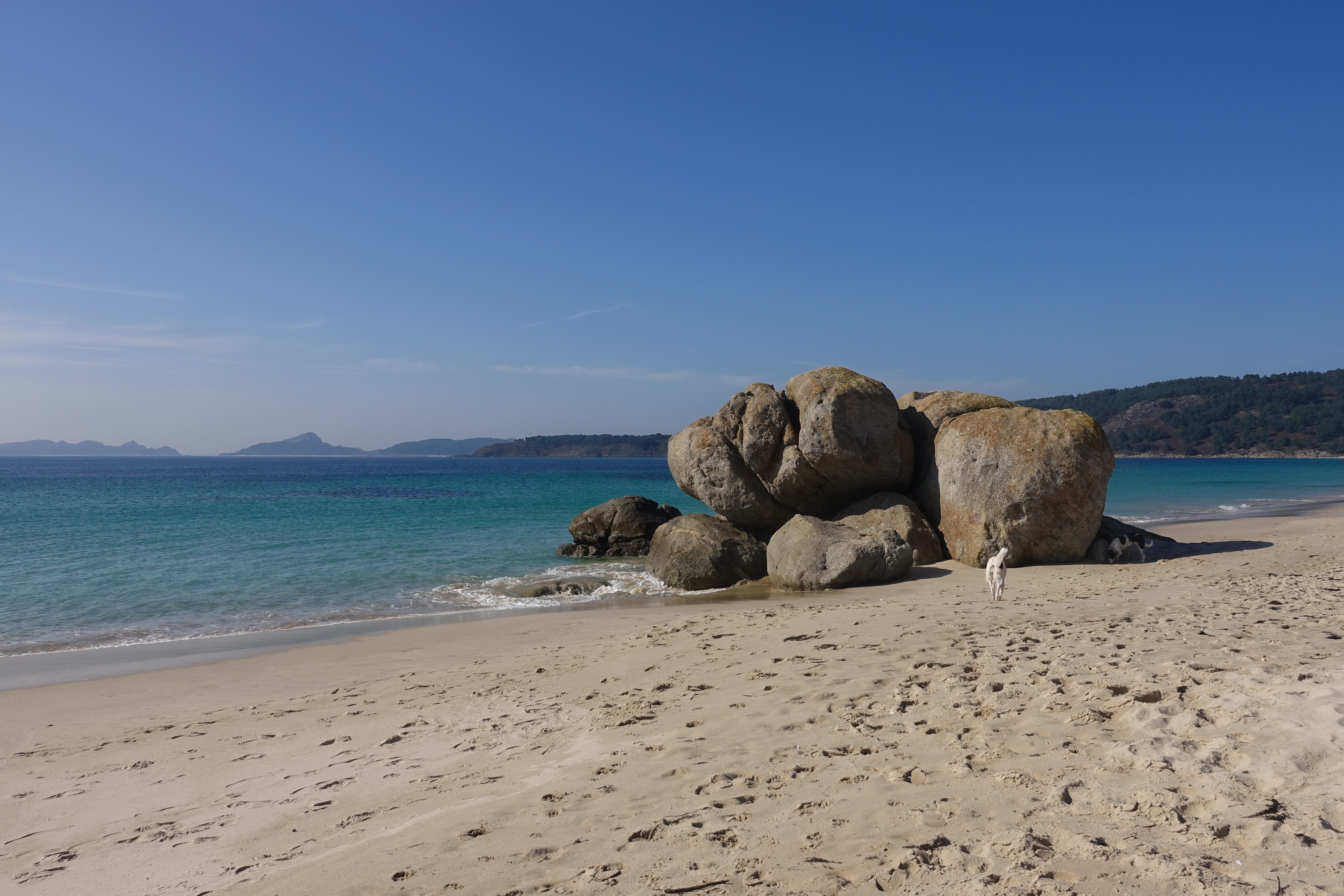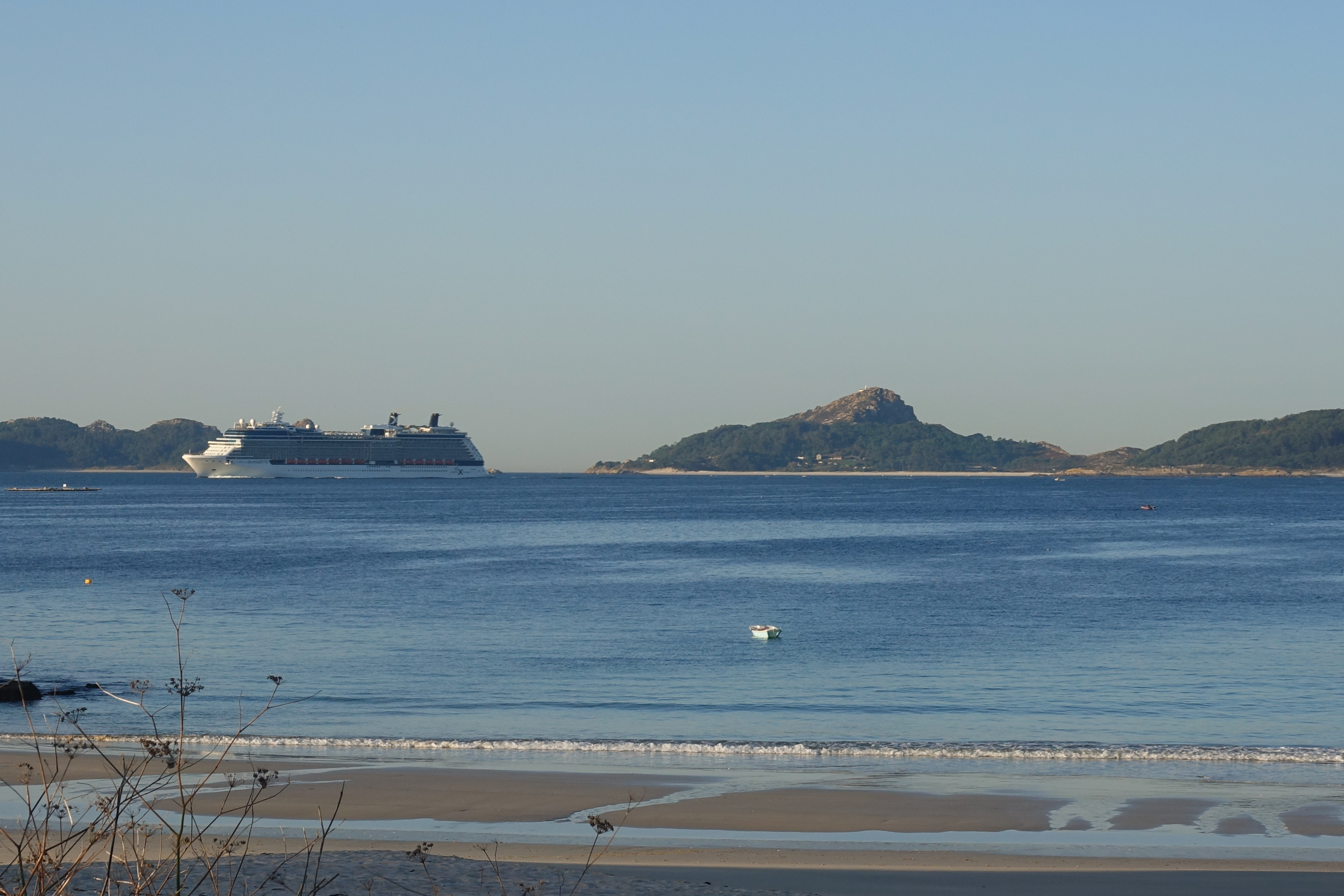 Beim Frühstück haben wir uns gewundert, als dieses riesige Kreuzfahrtschiff in unsere kleine Badebucht kam. Es war die Celebrity Silhouette, die zwischen dem Festland und den paradiesischen Cies Inseln hindurch nach Vigo einlaufen wollte.