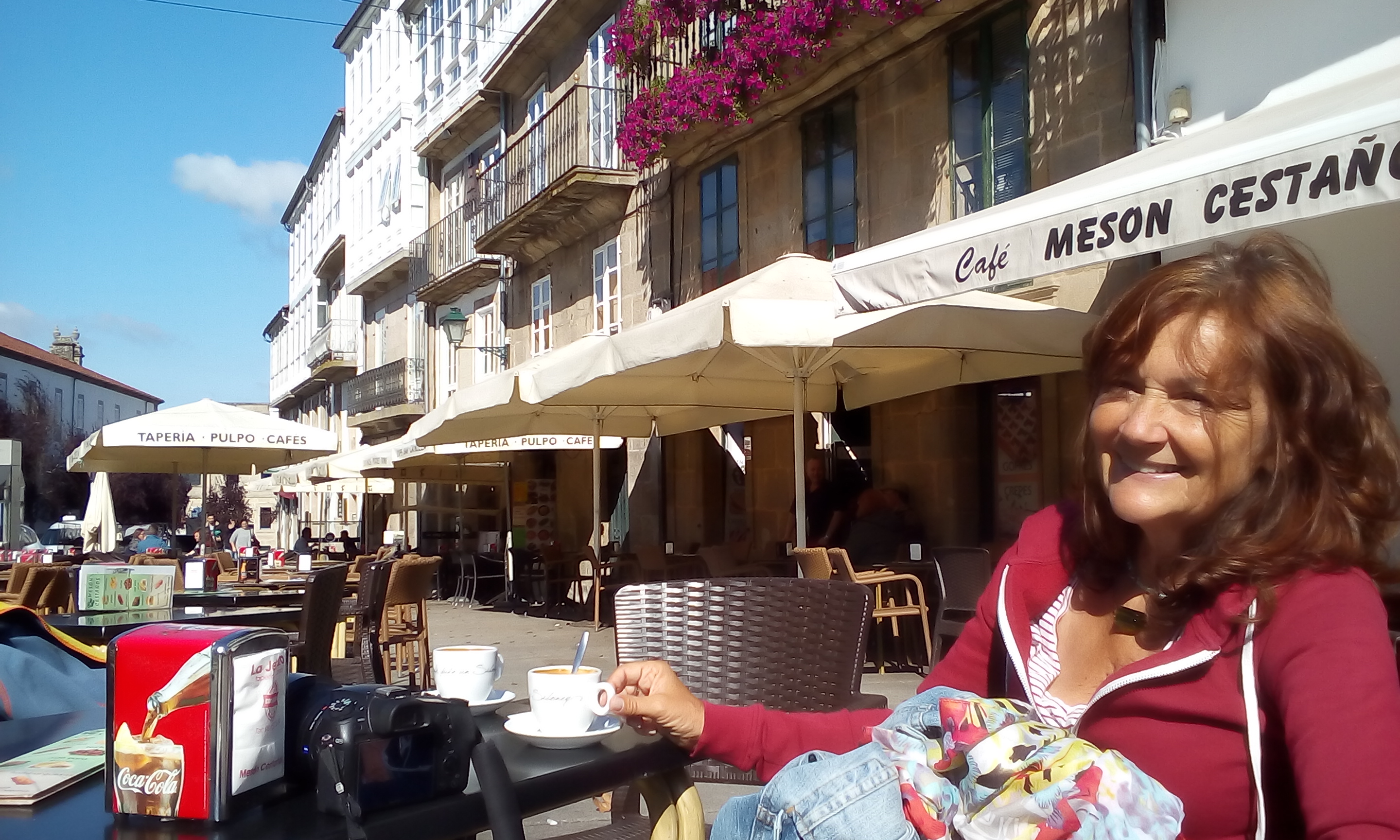 Nach der anstrengenden Pilgertour entspannen wir bei Café con Leche in der Sonne in einem der zahlreichen Cafés.