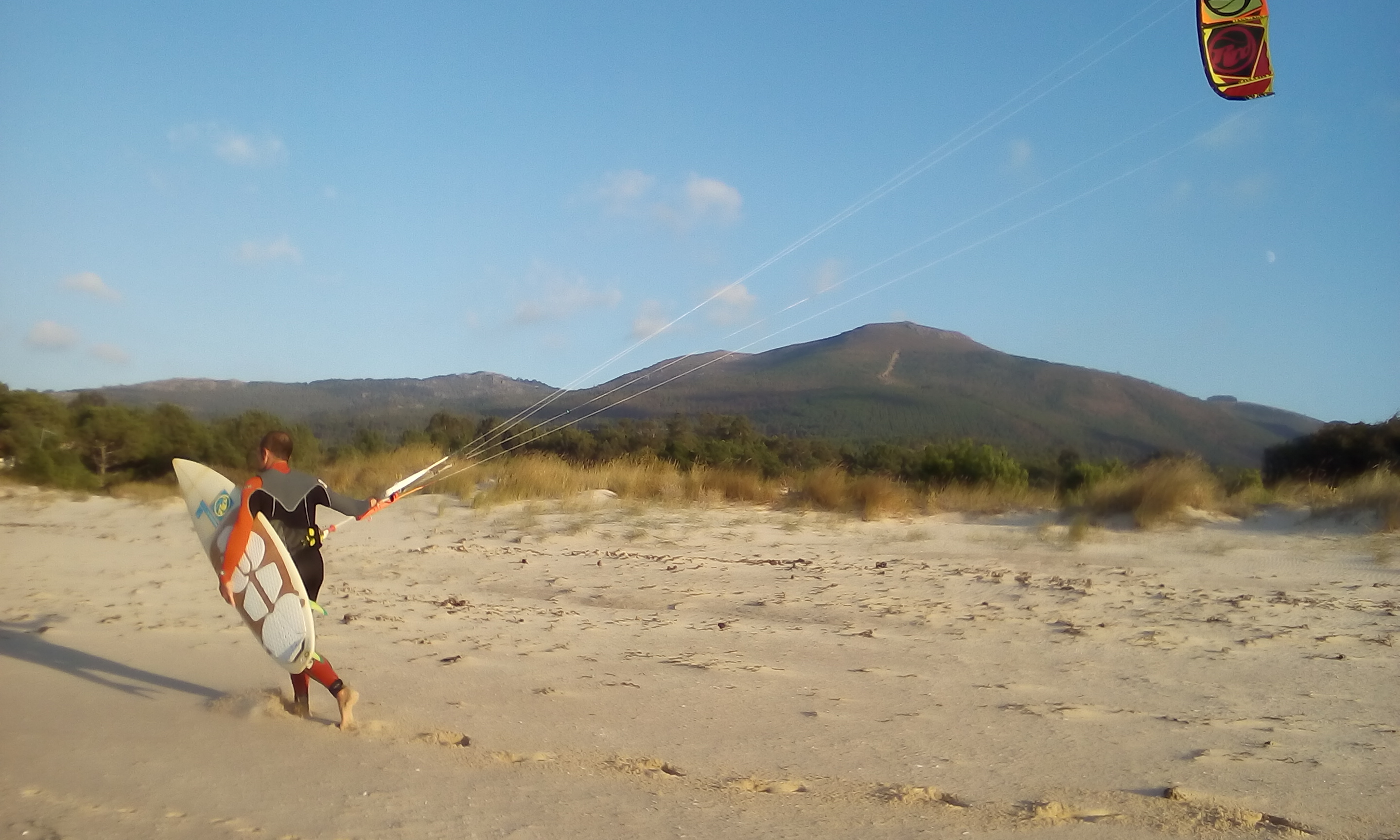 Wir fahren am Abend noch einmal ans Meer und finden den schönen Strand von Aguieira. Zu unserer Überraschung sehen wir seit langem mal wieder Kiter auf dem Wasser. Die eingeschnittene Bucht des Ría de Muros e Noia ist ein ideales Surf und Kite Revier und für morgen ist Wind gemeldet.