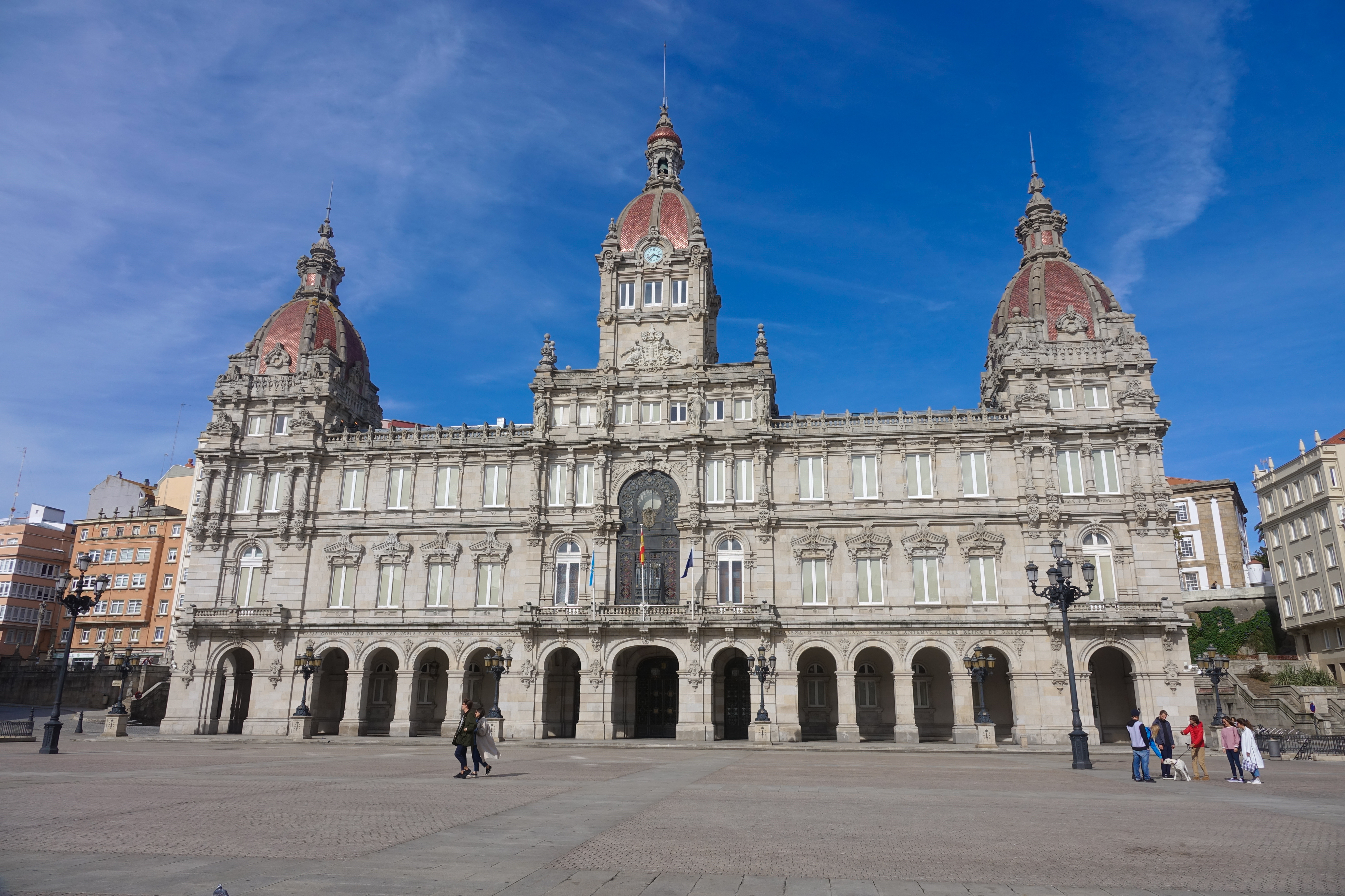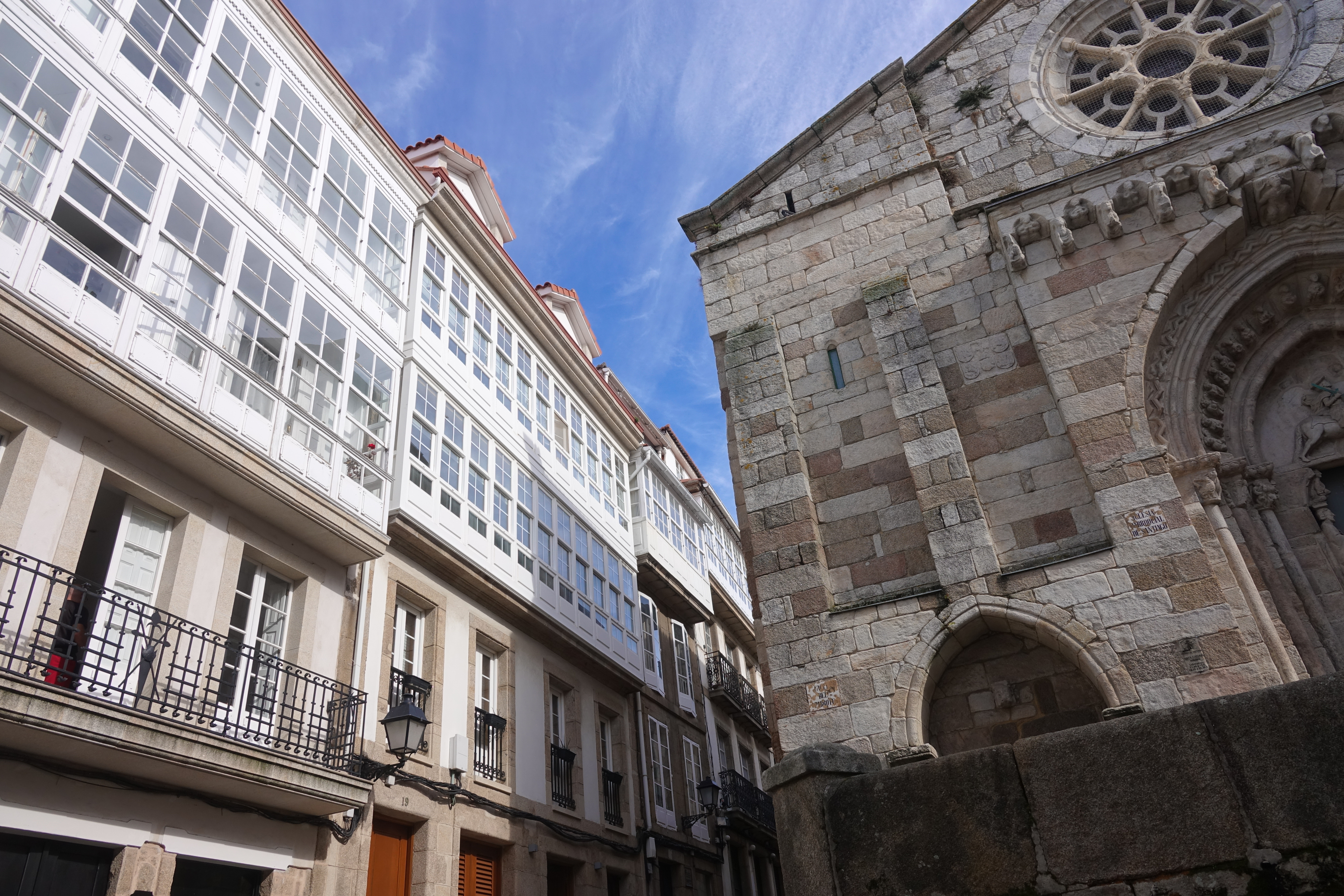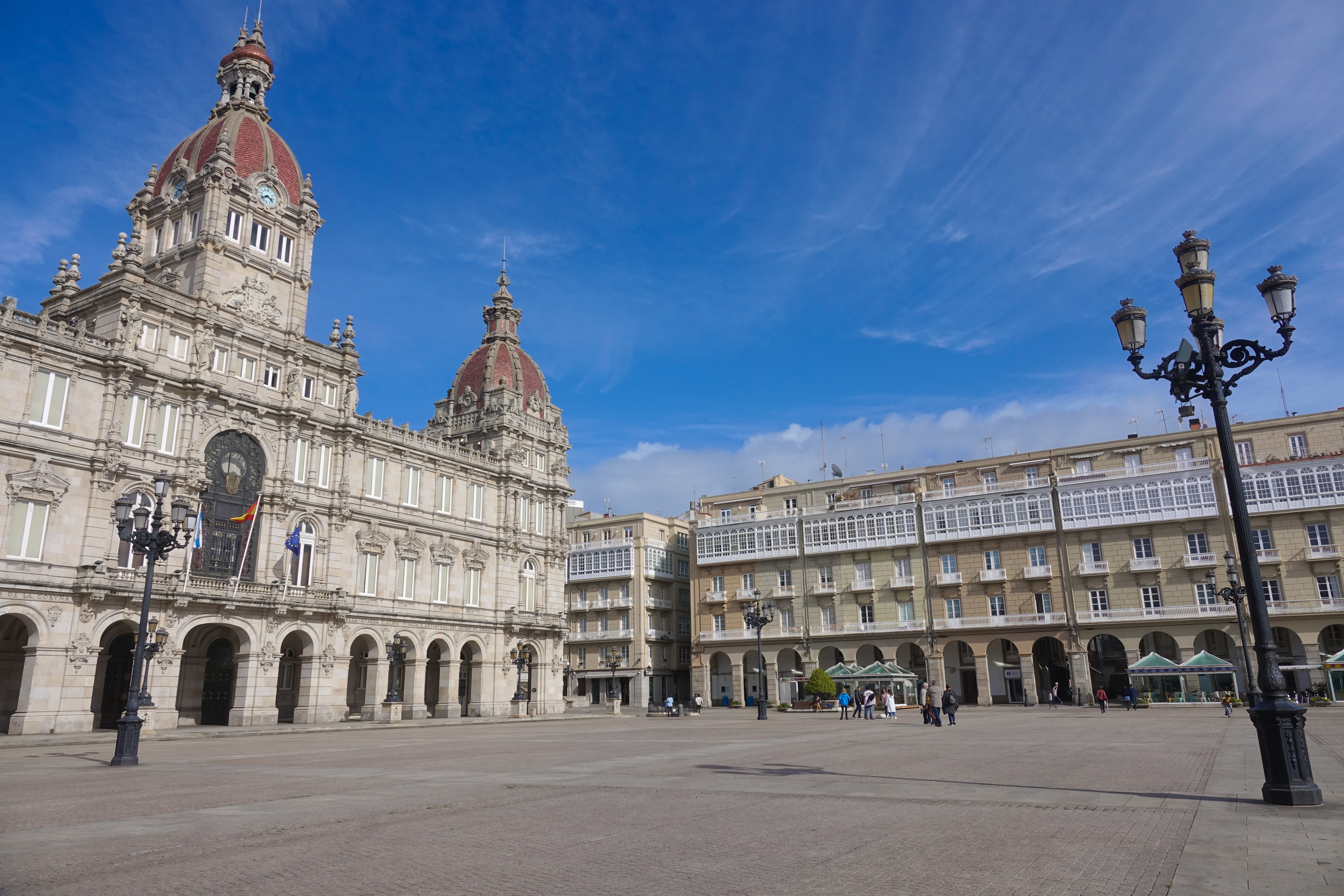 La Coruña ist eine sehr helle Stadt mit weißen Glasvorbauten an den Häusern. Dazwischen gibt es Kirchen und das schöne Rathaus.