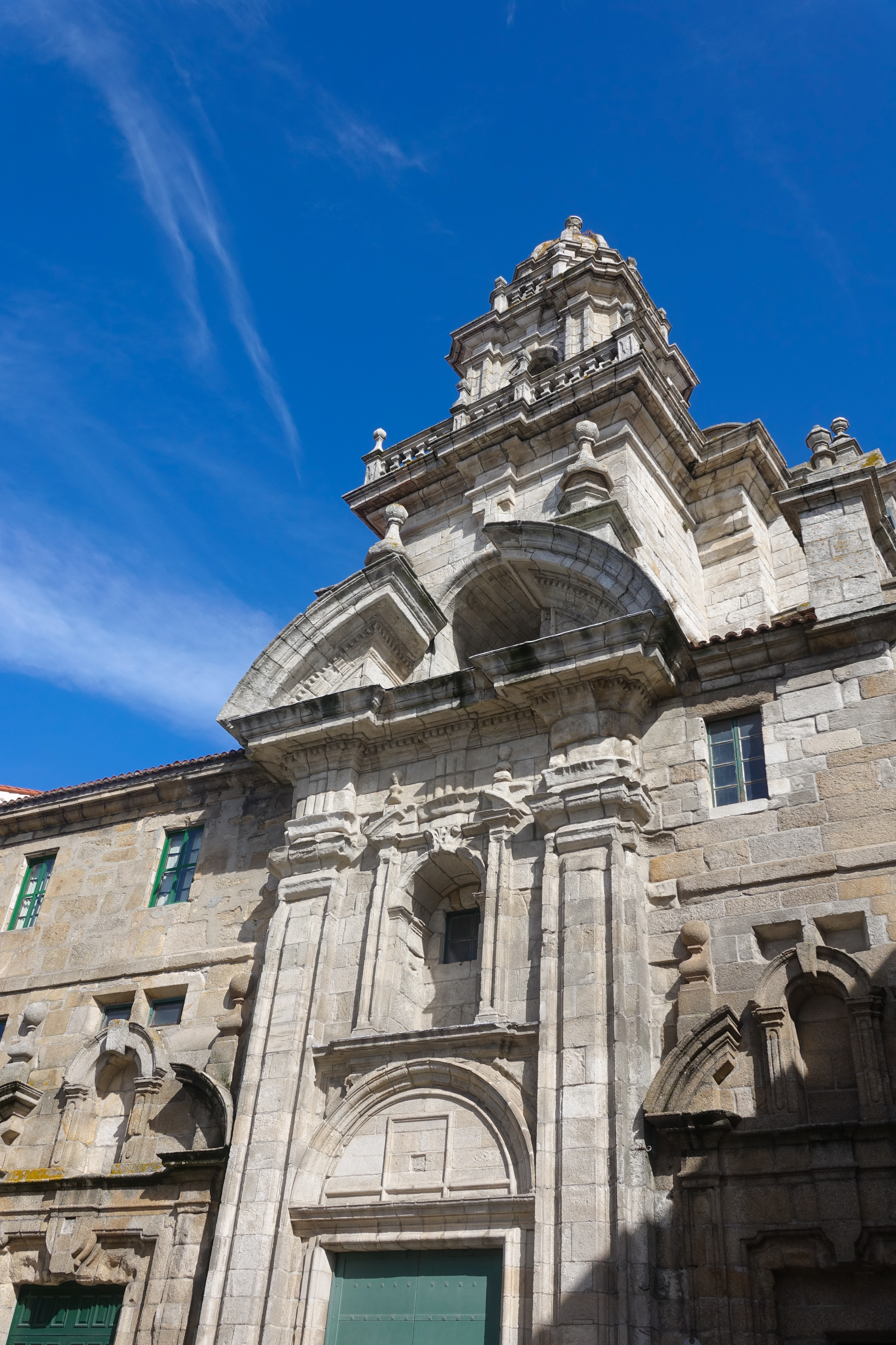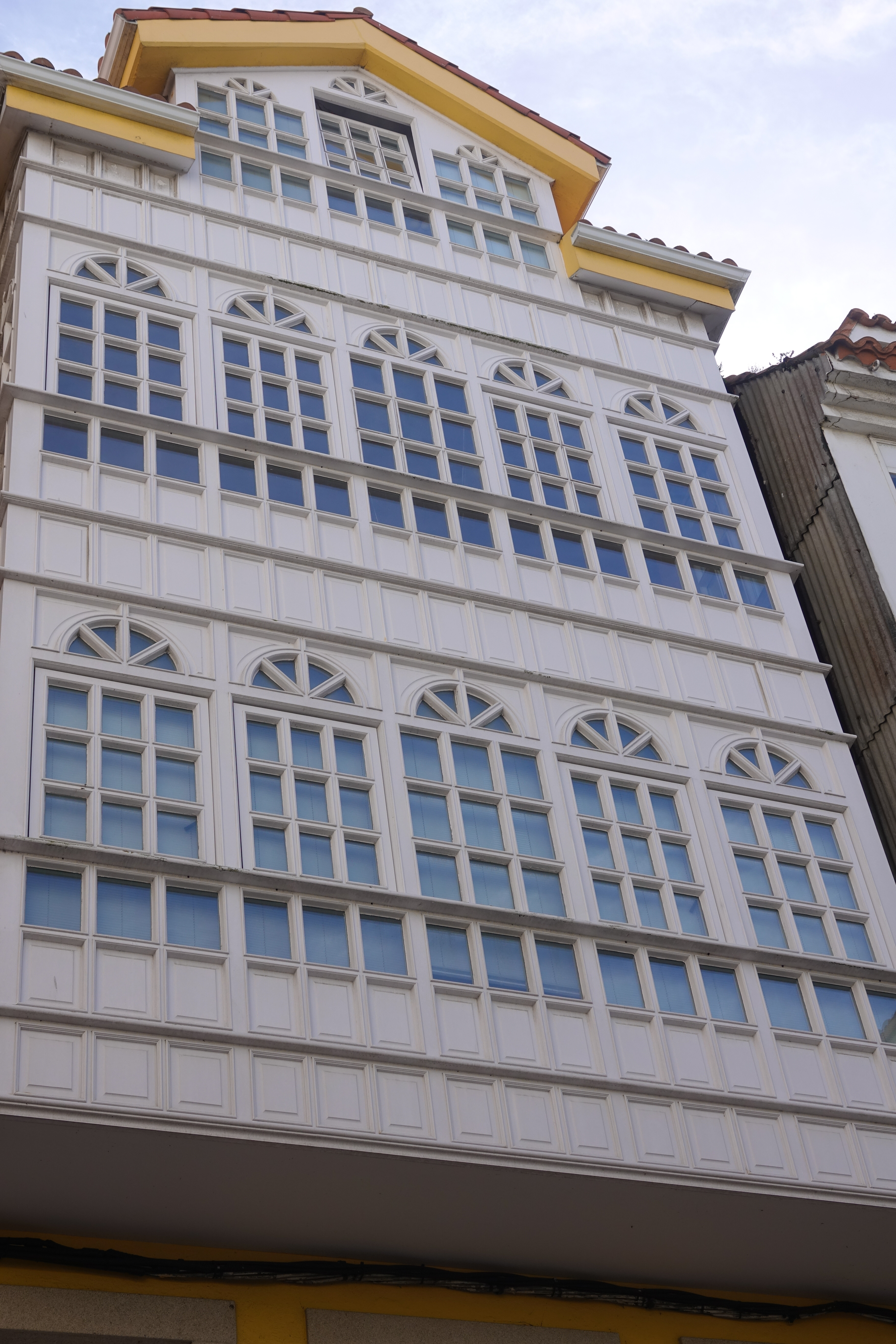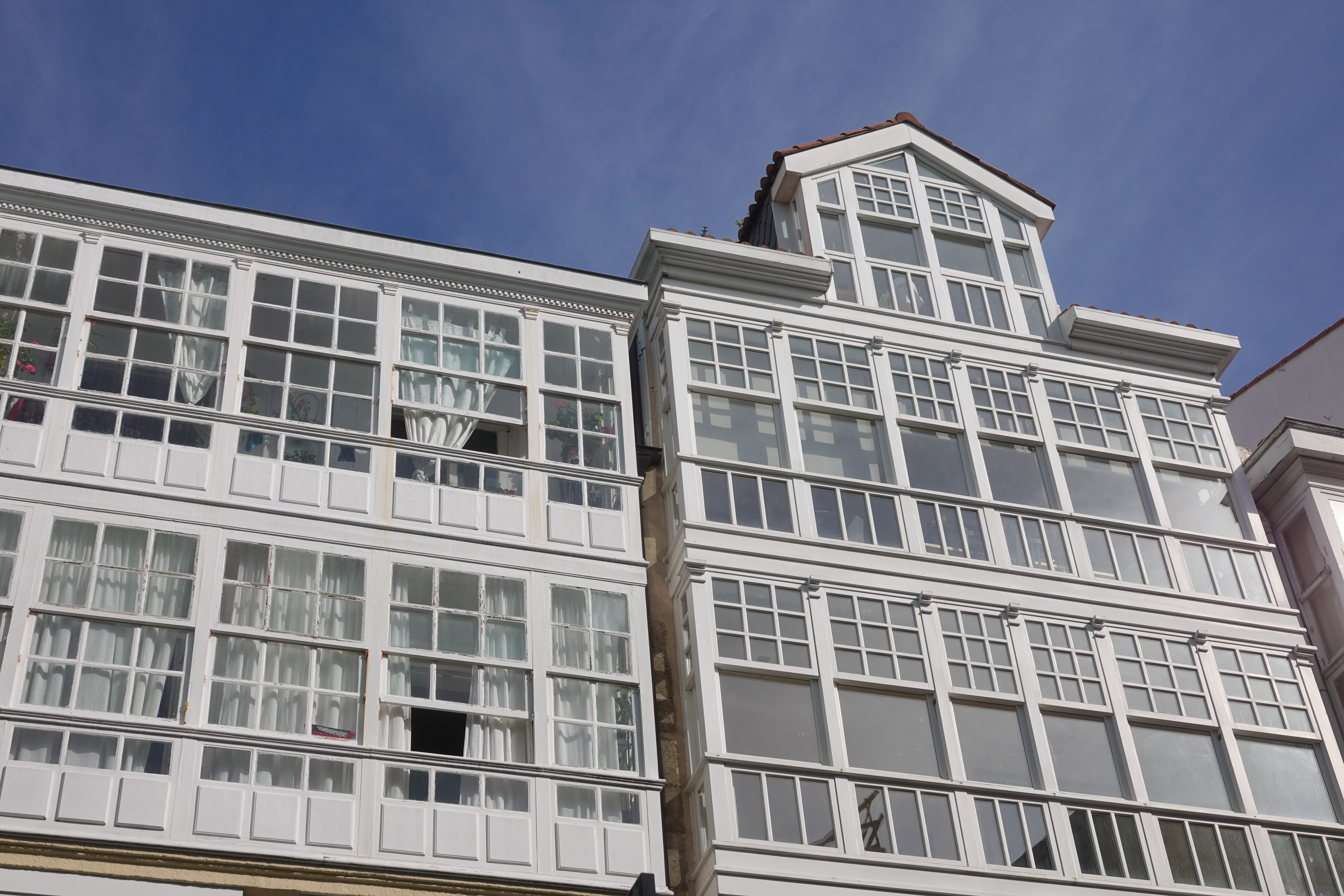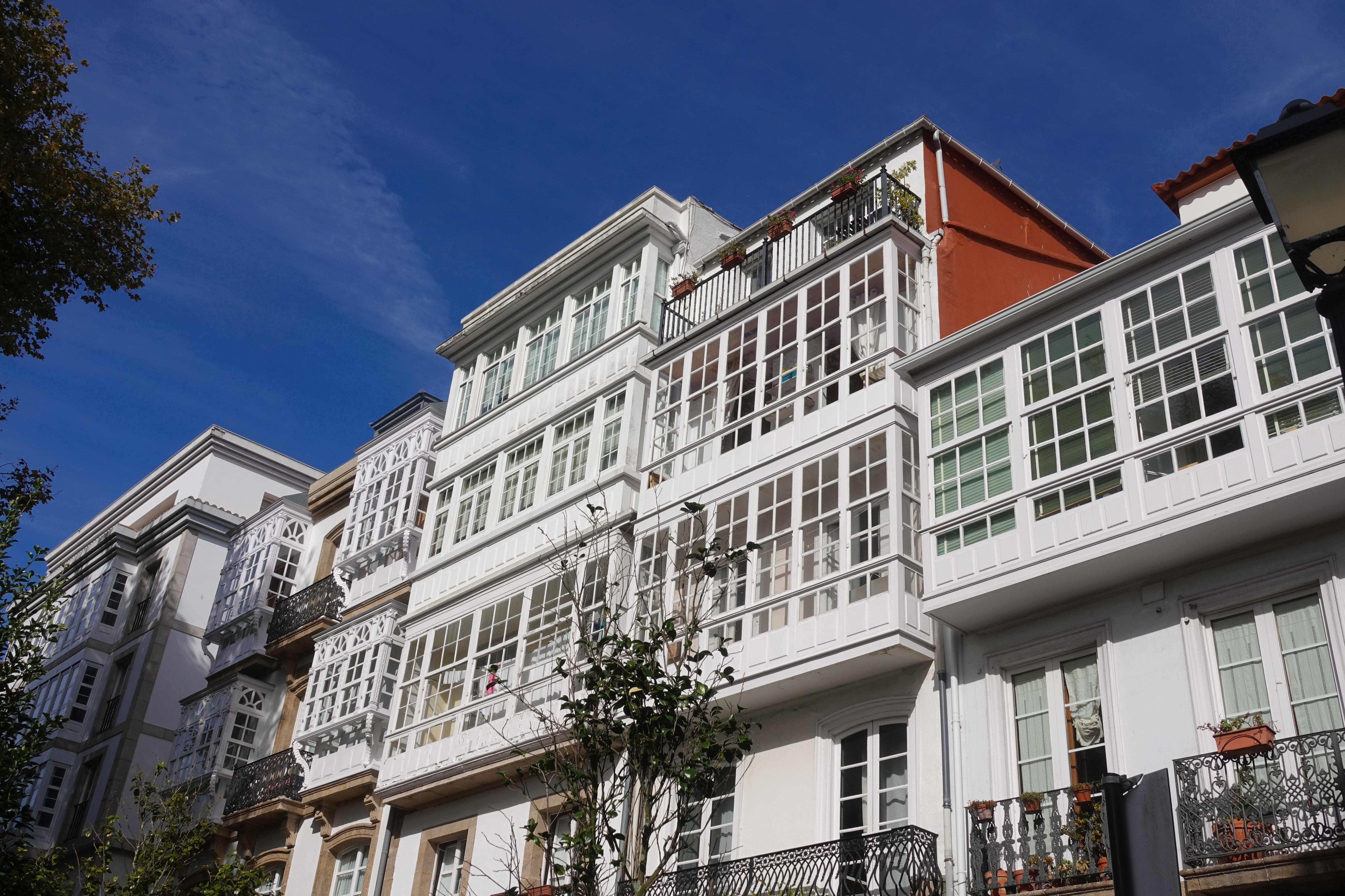 La Coruña ist eine sehr helle Stadt mit weißen Glasvorbauten an den Häusern. Dazwischen gibt es Kirchen und das schöne Rathaus.