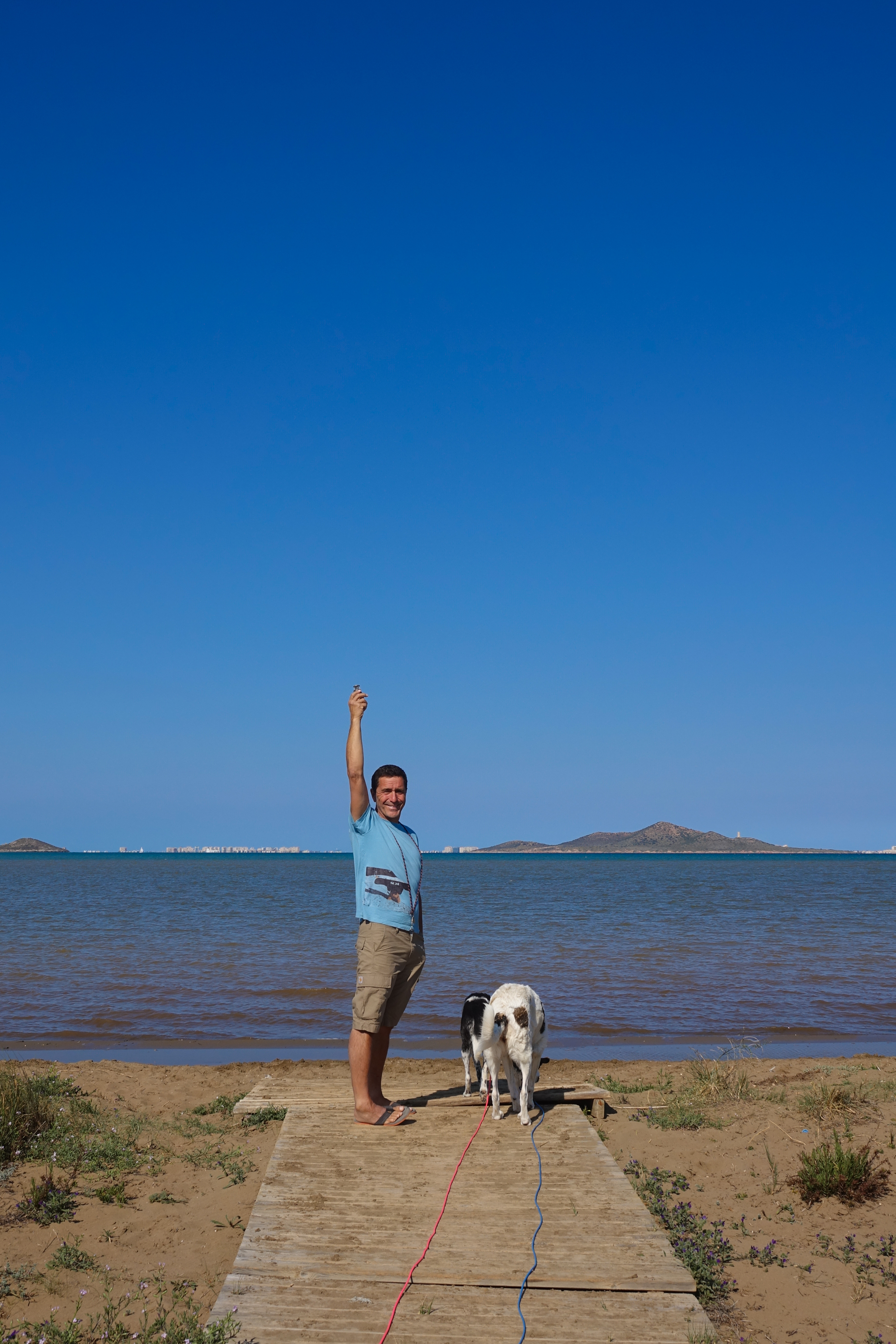 Früher, vor mehr als 50 Jahren war La Manga einmal ein Paradies. Ein riesiger Sandarm, La Manga heißt der Ärmel, trennte diese Lagune vom Meer ab. Leider wurde dann im Laufe der Jahre ein hässliches Hochhaus neben das andere gebaut. Die Bebauung ist wirklich furchtbar, fast wie in Manhattan. Auf dem ganzen Sandarm gibt es Ferienort neben Ferienort. Wir waren hier, mit einer Gruppe der Sporthochschule schon mindestens 20 Mal. Unsere Kinder haben hier surfen gelernt und wir durften es nicht wagen, an Ostern nicht hierher zu kommen. Für unsere Kinder war es das Ereignis des Jahres und auch wir hatten immer viel Spaß hier. Die Surfbedingungen in der Lagune sind wirklich großartig und man muss versuchen, über den Rest hinwegzusehen. Jedenfalls ist unser Stellplatz traumhaft schön und ruhig. Wir sind auch mit dem Wohnmobil schon zum dritten Mal hier und kennen daher die verschwiegenen Ecken, die wir selbst gefunden haben und die daher nicht auf Park4Night zu finden sind. Wir wollen jetzt hier ein bisschen verweilen und die idealen Surfbedingungen nutzen, wenn denn der Wind mitspielt. Wir fahren nochmal unsere Plätze ab und stellen zufrieden fest, dass sich nichts geändert hat. Im Dominique gibt es immer noch eine sehr gute Panaderia und mit den leckeren Croissant geht es zu einem Platz an der Lagune, den wir Seitenstraßenstrand genannt haben. Hier steht man ruhig und kann zur Isla Del Baron, die unsere Kinder immer Pirateninsel genannt haben, surfen. Es sieht wirklich aus, wie ein Katzensprung, aber es ist richtig weit.