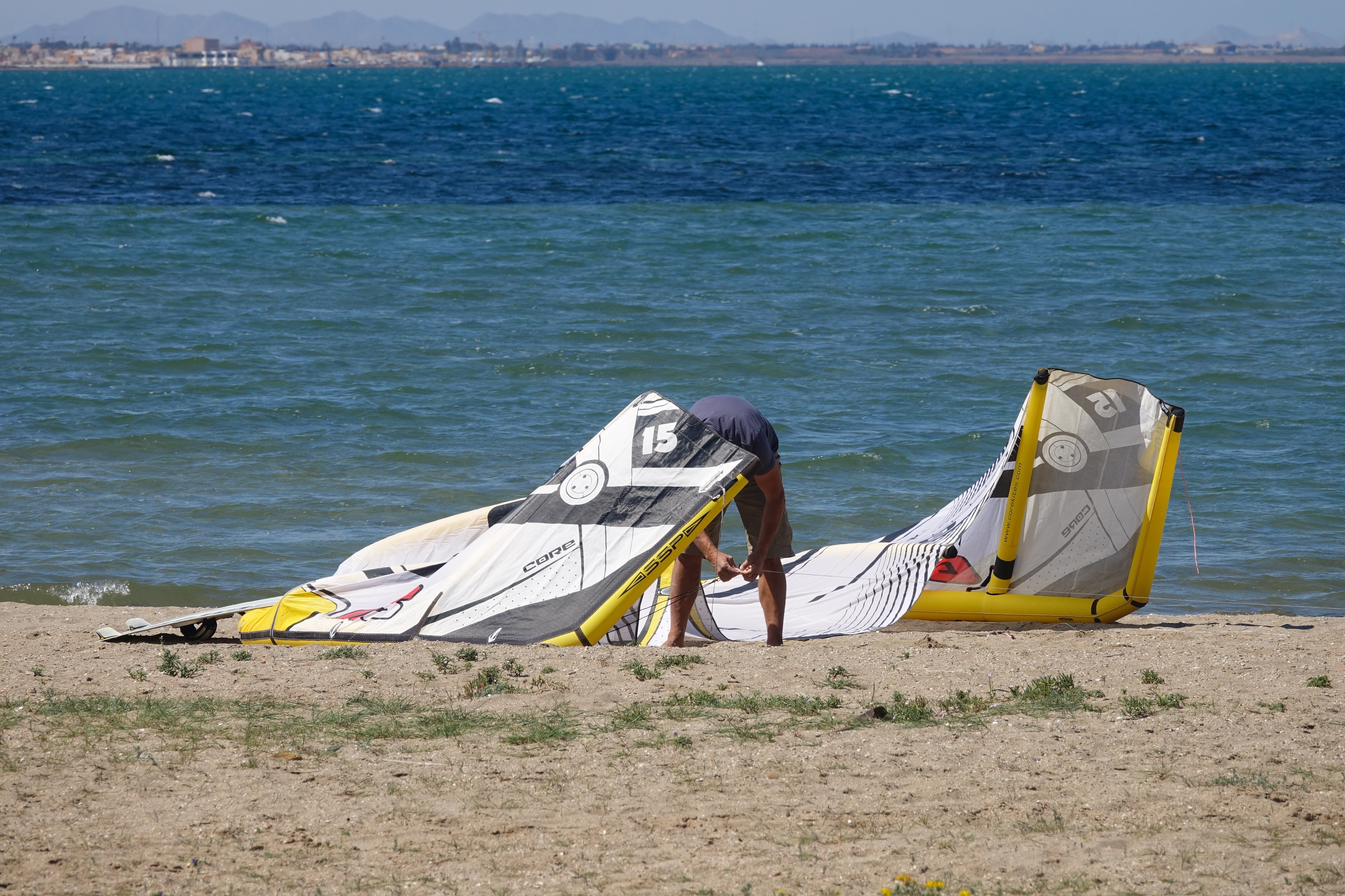 Damit wir nicht schon wieder den gleichen Fehler machen wie gestern, riggen wir mal viel kleiner auf, als wir nach dem aktuellen Wind müssten. Und tatsächlich geht heute die Rechnung auf. Carmen kann prima mit ihrem 4.3 surfen und Uwe mit dem 15 er Kite. Nach der Mittagspause ist Carmen schnell überpowert und kann Uwe das Material überlassen.