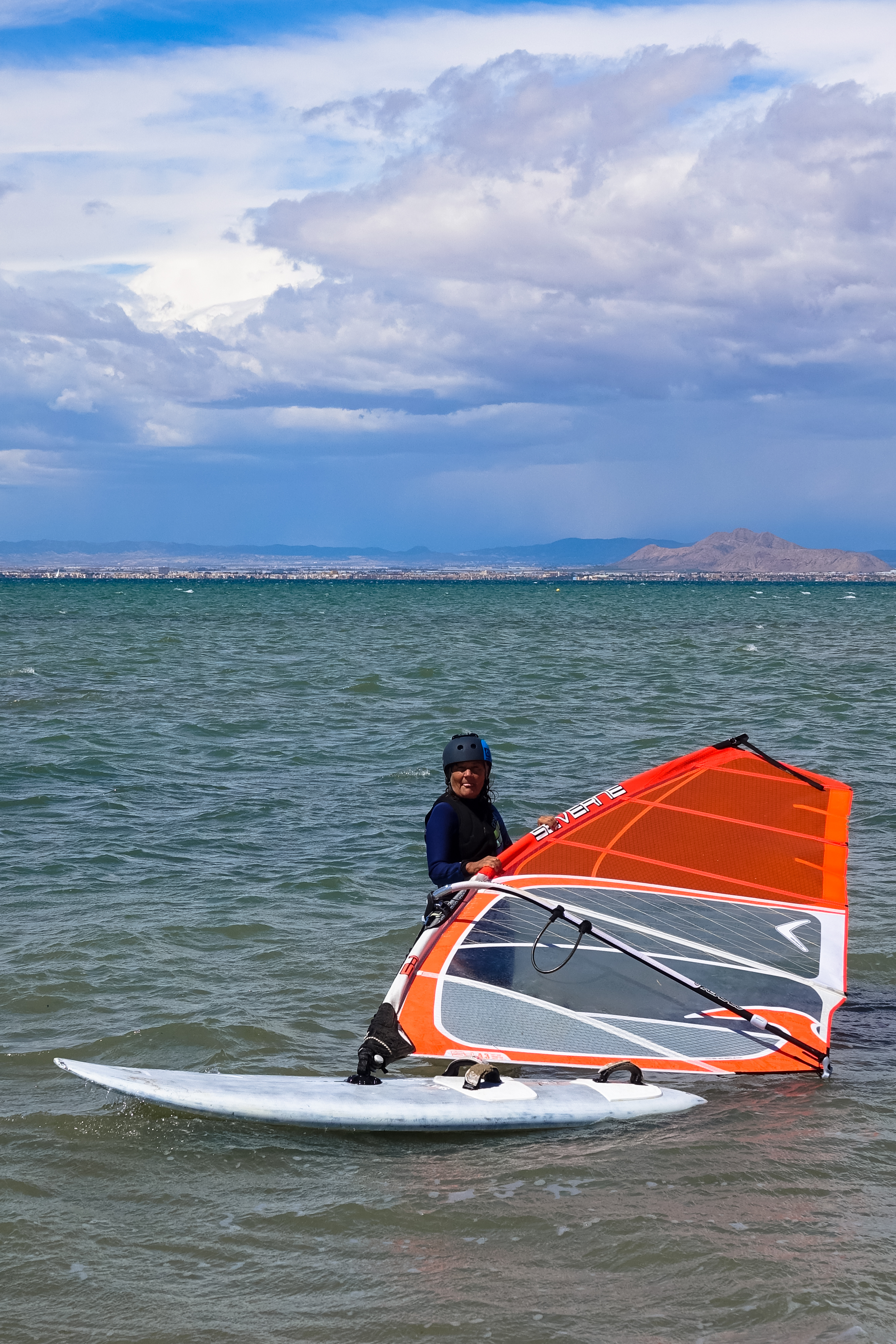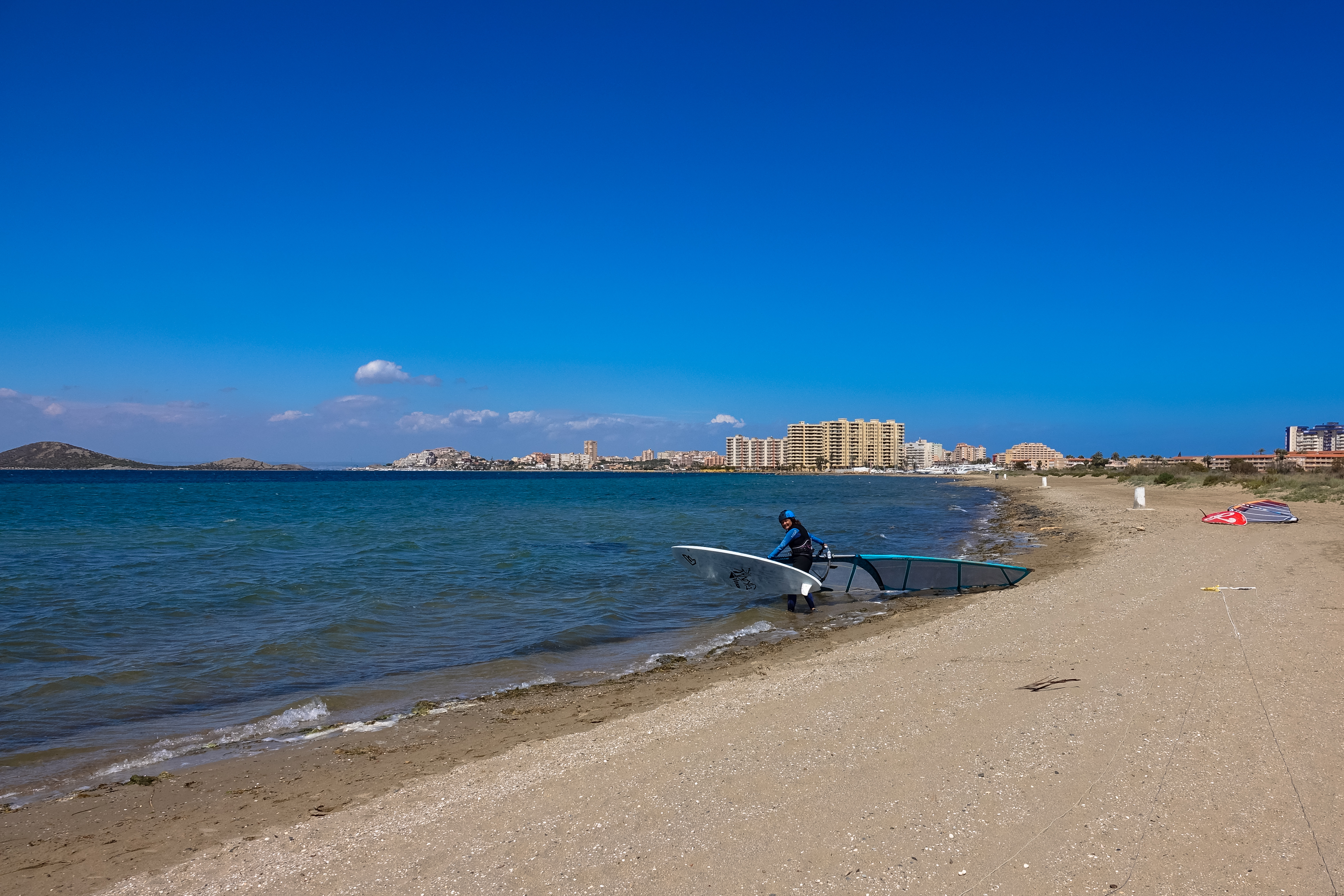 Wir wechseln auf die andere Seite der Gran Via ans Mar Menor und bereiten unseren Surfstuff vor. Beim Frühstück war es noch wunderbar warm, jetzt wird es durch den Wind kühl.