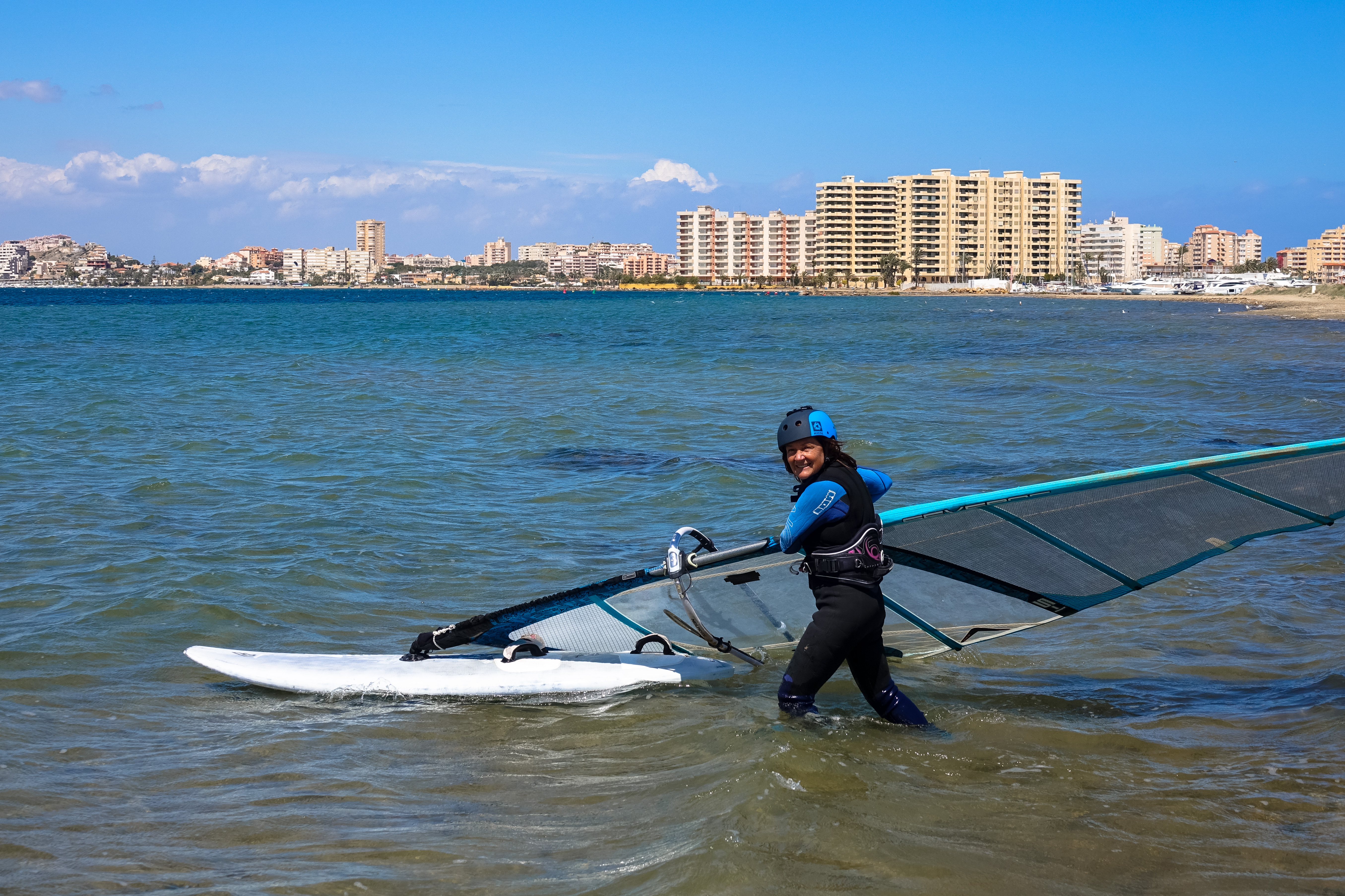 Wir umfahren Águilas und gehen noch schnell ins Decathlon Badelatschen kaufen. Die alten haben wir in den letzen Monaten eigentlich jeden Tag an den Füßen gehabt und sie sind „durch“. Der Stellplatz in Calabardinia, den wir für die Übernachtung ausgesucht haben, droht mit einer Strafe von 3000€ für das freie Übernachten. Wirklich unbegreiflich, angesichts von Foliengewächshäusern und Bauruinen. Fragt sich was schlimmer für die Umwelt ist? Der Einsatz von Pestiziden und riesige Foliengewächshäuser über Quadratkilometer oder übernachten auf einem Strandparkplatz? Ein weiteres Problem dieser Region soll die Ausbeutung von illegalen Arbeitskräften aus Afrika sein, die angeblich bei den Touristen betteln. Wir haben das allerdings nicht selbst erlebt, sondern nur auf unserer Camperapp gelesen. Gut, dann fahren wir eben weiter. Wir wollen ja sowieso ans Mar Menor zum Surfen und Kiten. Und diese Entscheidung erweist sich als richtig. Wir finden einen schönen Platz direkt am Mar Menor und wissen jetzt, dass die Region von Águilas bis Mazzarón auf Vertreibung der Wohnmobile setzt und das wir dort besser nicht mehr hin fahren. Der Stellplatz am Mar Menor ist großartig und da noch genügend Wind ist, geht Uwe noch für ein Stündchen aufs Wasser.